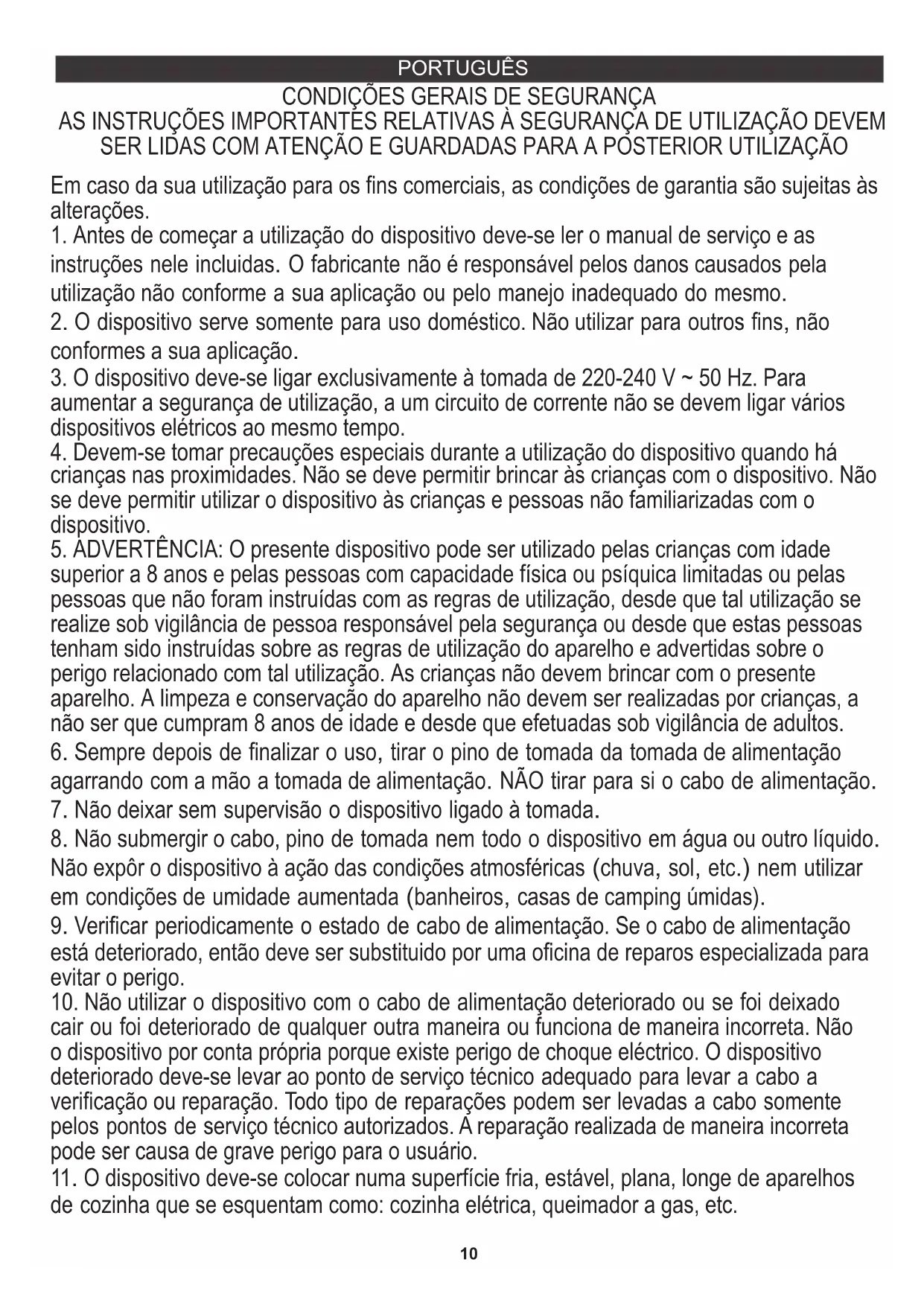 10. Não utilizar o dispositivo com o cabo de alimentação deteriorado ou se foi deixado