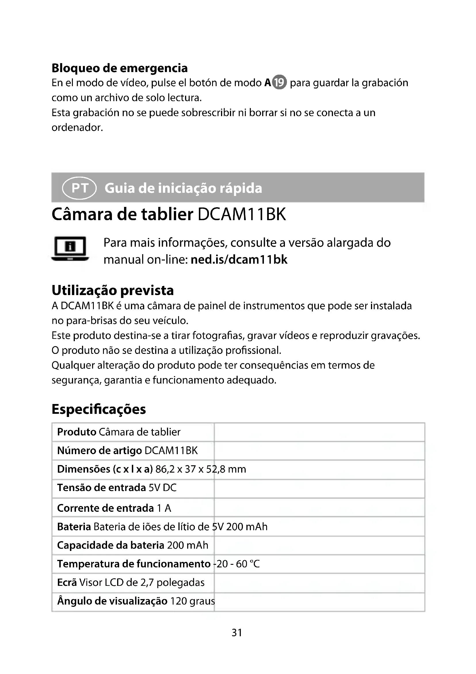 Guia de iniciação rápida Câmara de tablier DCAM11BK Para mais informações, consulte a versão alargada do manual on-line: ned.is/dcam11bk Utilização prevista A DCAM11BK é uma câmara de painel de instrumentos que pode ser instalada no para-brisas do seu veículo. Este produto destina-se a tirar fotograas, gravar vídeos e reproduzir gravações. O produto não se destina a utilização prossional. Qualquer alteração do produto pode ter consequências em termos de segurança, garantia e funcionamento adequado. Especicações Produto Câmara de tablier Número de artigo DCAM11BK Dimensões (c x l x a) 86,2 x 37 x 52,8 mm Tensão de entrada 5V DC Corrente de entrada 1 A Bateria Bateria de iões de lítio de 5V 200 mAh Capacidade da bateria 200 mAh Temperatura de funcionamento -20 - 60 °C Ecrã Visor LCD de 2,7 polegadas Ângulo de visualização 120 graus32 Vídeo Vídeo em loop Formato de vídeo .avi Resolução de vídeo 1920 x 1080p / 1440 x 1080 / 1280 x 720 / 848 x 480 / 640 x 480 @ 60 Hz Resolução de imagem 12MP (4032 x 3024) / 10MP / 8MP / 5MP / 3MP / 2MP (1920 x 1080) / 1.3MP / VGA (640 x 480) Formato de imagem .jpg Idioma Português, Francês, Alemão, Espanhol, Italiano, Neerlandês, Húngaro, Sueco, Finlandês, Dinamarquês, Checo, Tempo de gravação de vídeo 1 / 2 / 3 / 5 / 10 min Gravação de áudio Microfone e altifalante incorporados. O microfone pode ser ligado/desligado Cartão de memória Cartão MicroSD Capacidade do cartão de memória