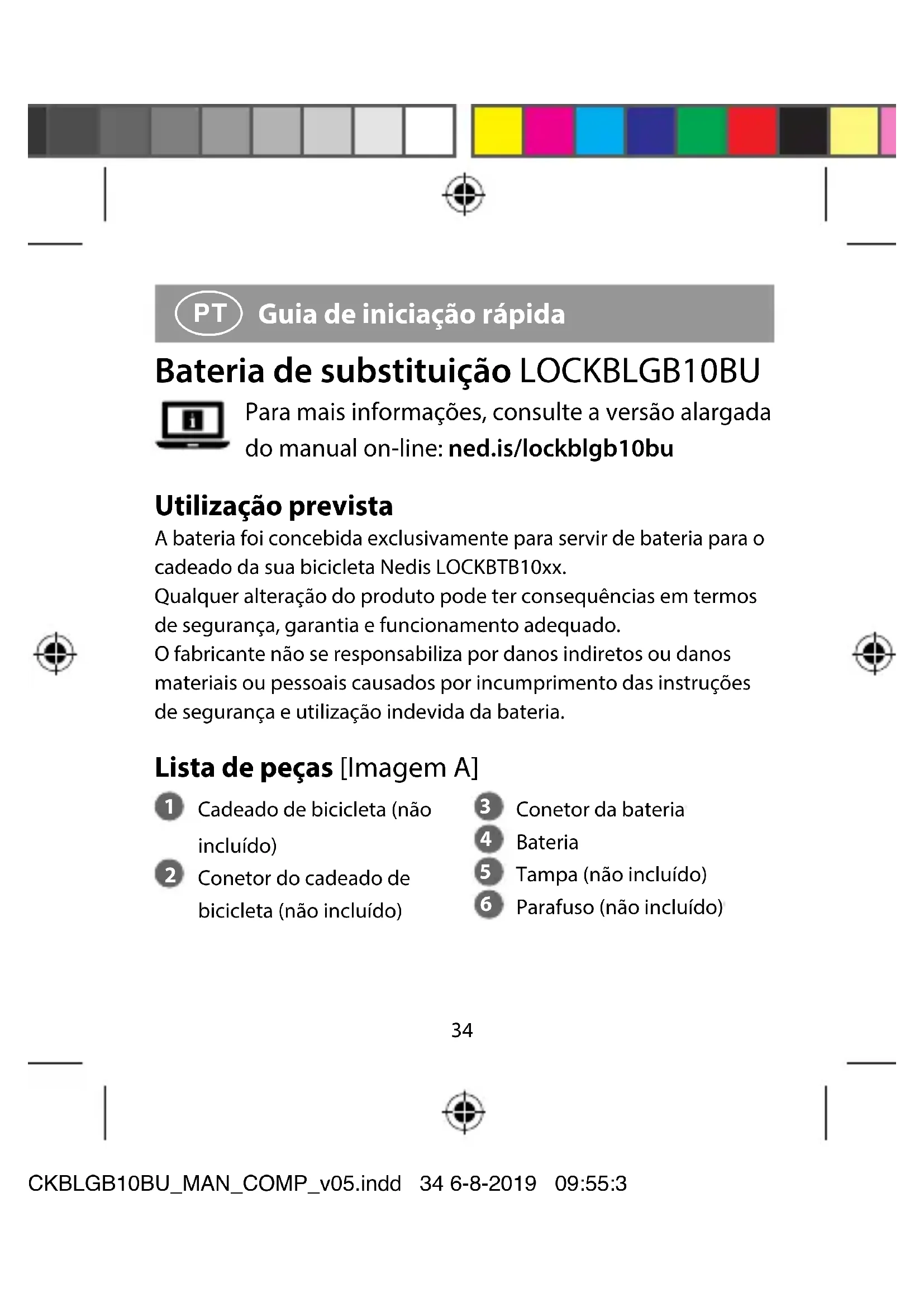 Guia de iniciação rápida Bateria de substituição LOCKBLGB10BU Para mais informações, consulte a versão alargada do manual on-line: ned.is/lockblgb10bu Utilização prevista A bateria foi concebida exclusivamente para servir de bateria para o cadeado da sua bicicleta Nedis LOCKBTB10xx. Qualquer alteração do produto pode ter consequências em termos de segurança, garantia e funcionamento adequado. O fabricante não se responsabiliza por danos indiretos ou danos materiais ou pessoais causados por incumprimento das instruções de segurança e utilização indevida da bateria. Lista de peças [Imagem A]