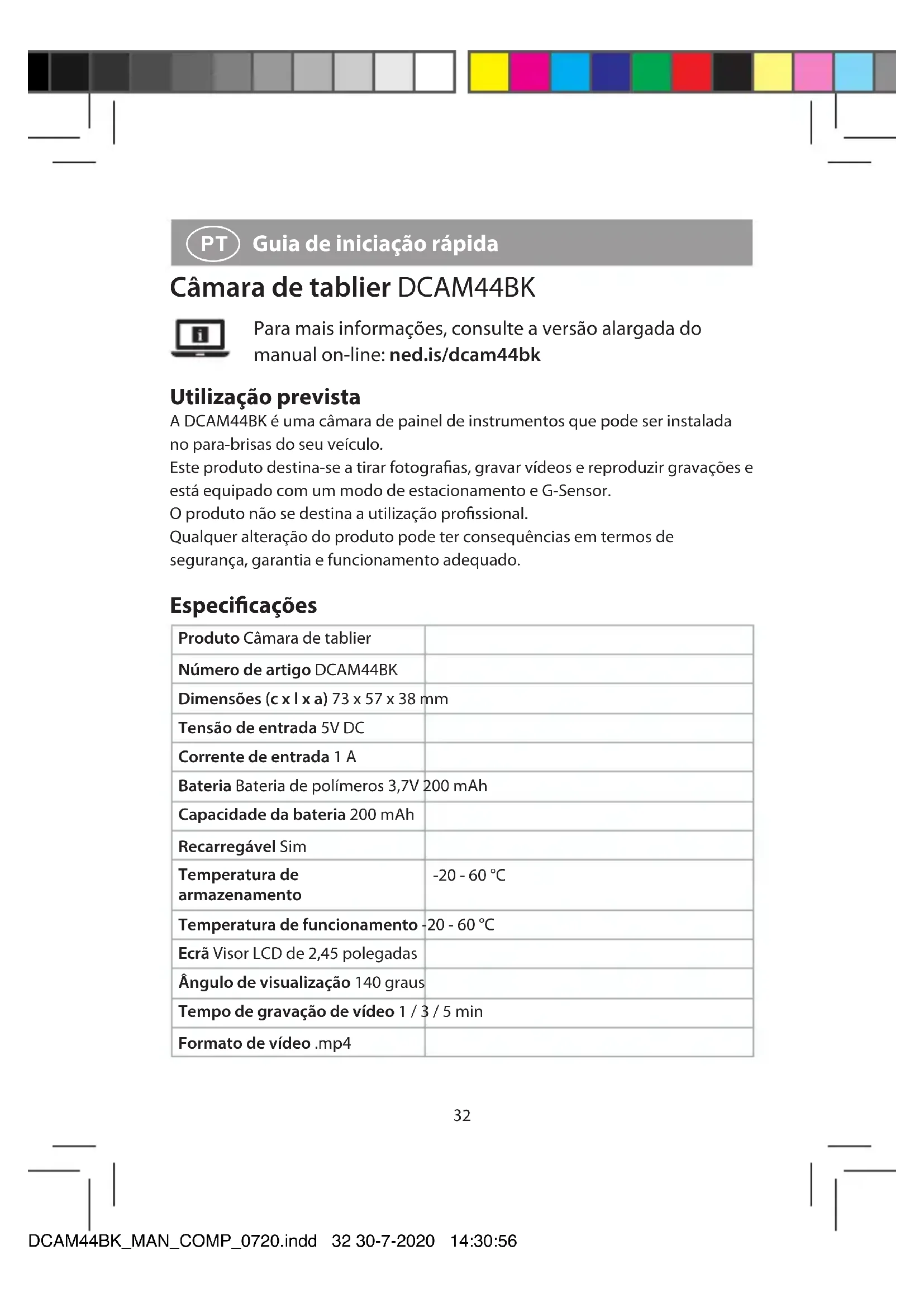 Guia de iniciação rápida Câmara de tablier DCAM44BK Para mais informações, consulte a versão alargada do manual on-line: ned.is/dcam44bk Utilização prevista A DCAM44BK é uma câmara de painel de instrumentos que pode ser instalada no para-brisas do seu veículo. Este produto destina-se a tirar fotografias, gravar vídeos e reproduzir gravações e está equipado com um modo de estacionamento e G-Sensor. O produto não se destina a utilização profissional. Qualquer alteração do produto pode ter consequências em termos de segurança, garantia e funcionamento adequado. Especicações Produto Câmara de tablier Número de artigo DCAM44BK Dimensões (c x l x a) 73 x 57 x 38 mm Tensão de entrada 5V DC Corrente de entrada 1 A Bateria Bateria de polímeros 3,7V 200 mAh Capacidade da bateria 200 mAh Recarregável Sim Temperatura de armazenamento -20 - 60 °C Temperatura de funcionamento -20 - 60 °C Ecrã Visor LCD de 2,45 polegadas Ângulo de visualização 140 graus Tempo de gravação de vídeo 1 / 3 / 5 min Formato de vídeo .mp4 DCAM44BK_MAN_COMP_0720.indd 32 30-7-2020 14:30:5633 Codicação de vídeo H.264 / H.265 Resolução de vídeo 3840 x 2160 P30 / 2560 x 1440 P30 / 1920 x 1080 P60 / 1920 x 1080 P30 Resolução de imagem 12M / 10M / 8M / 5M / 3M / VGA Idioma Português, Francês, Alemão, Italiano, Neerlandês, Sueco, Finlandês, Romeno, Húngaro, Checo, , Gravação de áudio Microfone integrado Cartão de memória Cartão MicroSD Capacidade do cartão de memória