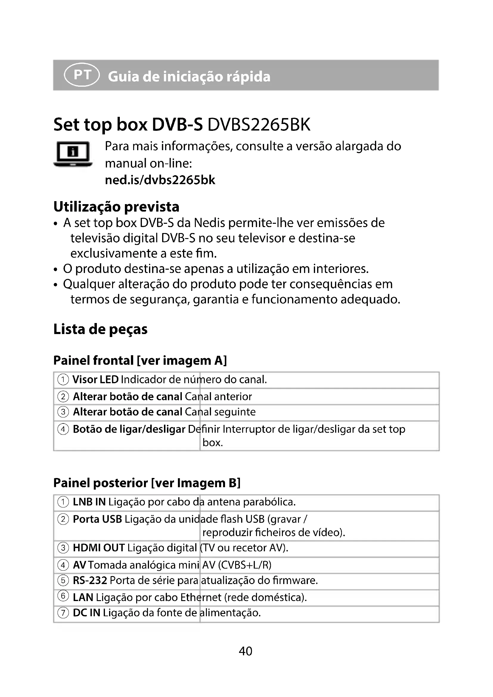 Guia de iniciação rápida Set top box DVB-S DVBS2265BK Para mais informações, consulte a versão alargada do manual on-line: ned.is/dvbs2265bk Utilização prevista