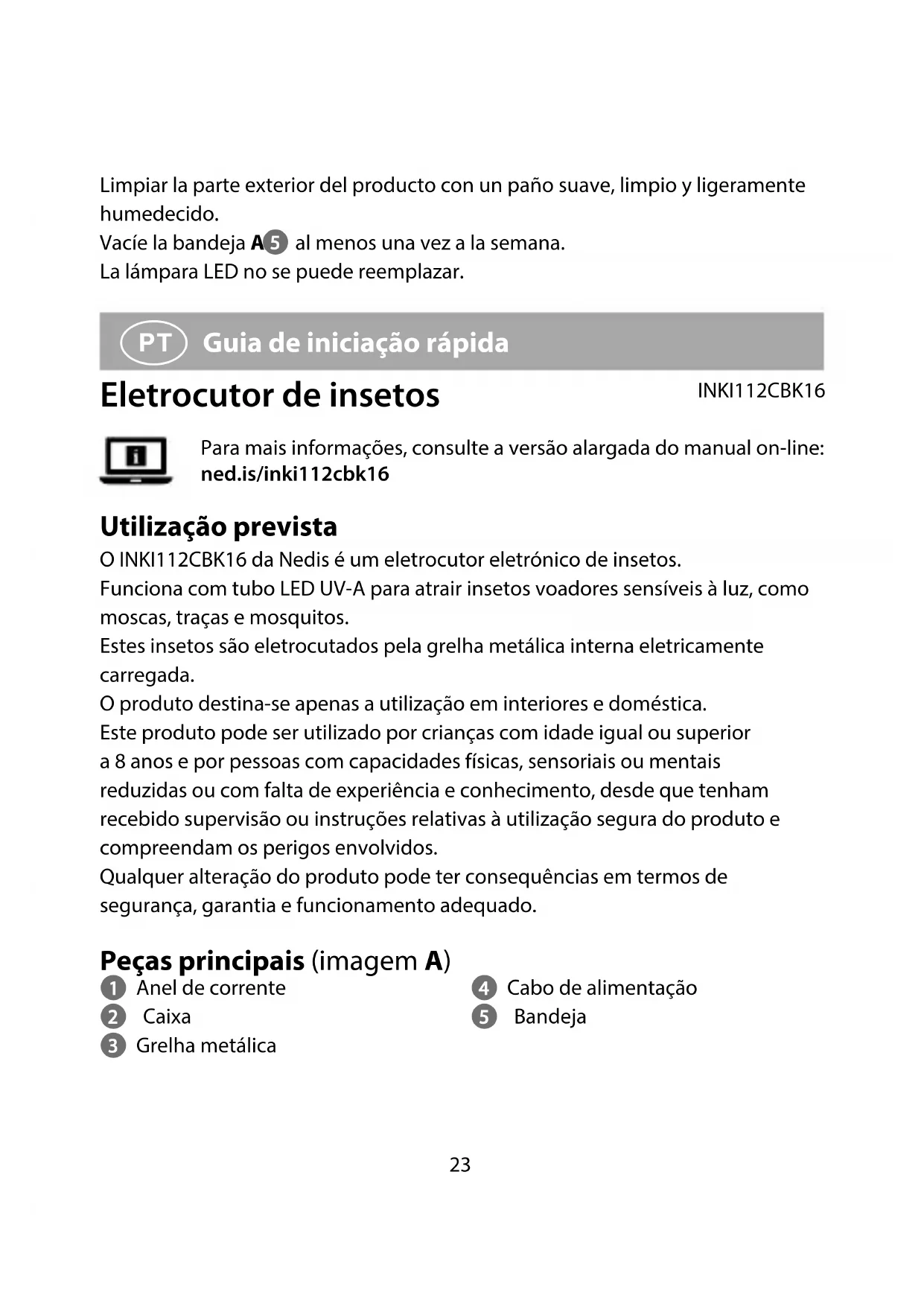 Guia de iniciação rápida Eletrocutor de insetos INKI112CBK16 Para mais informações, consulte a versão alargada do manual on-line: ned.is/inki112cbk16 Utilização prevista O INKI112CBK16 da Nedis é um eletrocutor eletrónico de insetos. Funciona com tubo LED UV-A para atrair insetos voadores sensíveis à luz, como moscas, traças e mosquitos. Estes insetos são eletrocutados pela grelha metálica interna eletricamente carregada. O produto destina-se apenas a utilização em interiores e doméstica. Este produto pode ser utilizado por crianças com idade igual ou superior a 8 anos e por pessoas com capacidades físicas, sensoriais ou mentais reduzidas ou com falta de experiência e conhecimento, desde que tenham recebido supervisão ou instruções relativas à utilização segura do produto e compreendam os perigos envolvidos. Qualquer alteração do produto pode ter consequências em termos de segurança, garantia e funcionamento adequado. Peças principais (imagem A) 1 Anel de corrente 2 Caixa 3 Grelha metálica 4 Cabo de alimentação 5 Bandeja24 Instruções de segurança