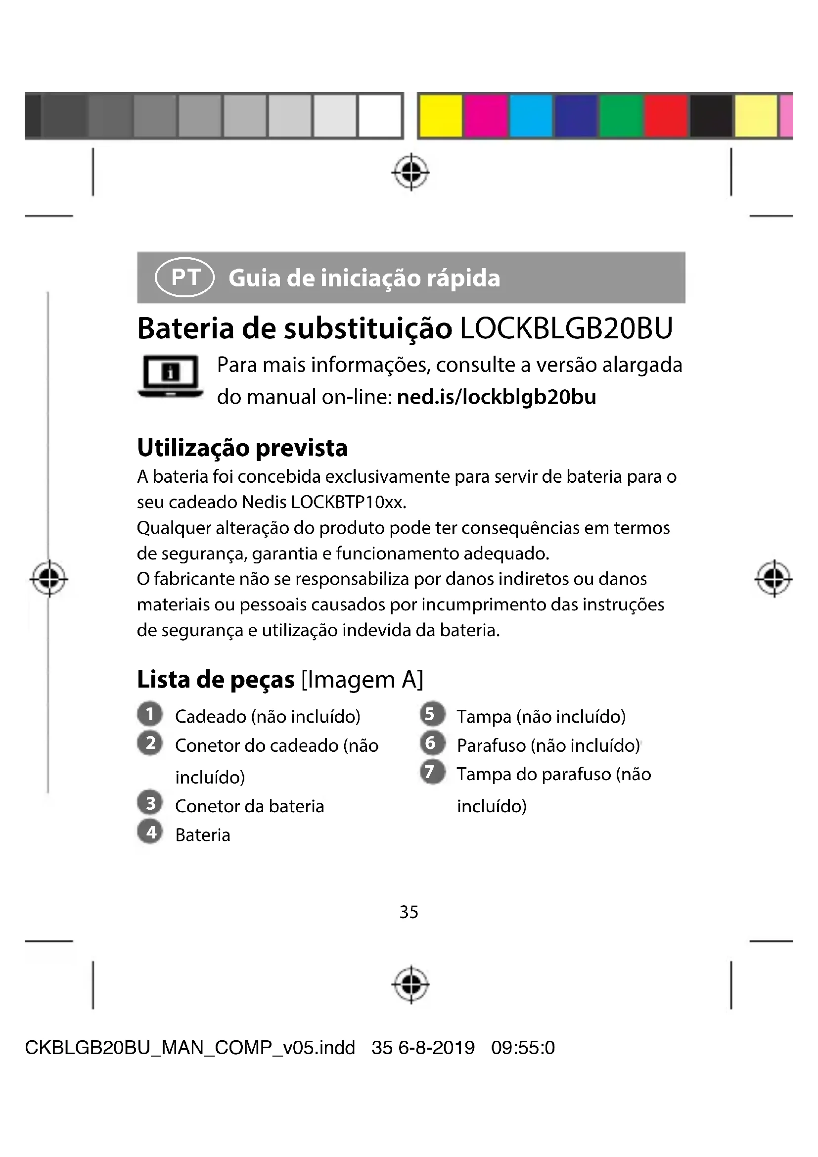 Guia de iniciação rápida Bateria de substituição LOCKBLGB20BU Para mais informações, consulte a versão alargada do manual on-line: ned.is/lockblgb20bu Utilização prevista A bateria foi concebida exclusivamente para servir de bateria para o seu cadeado Nedis LOCKBTP10xx. Qualquer alteração do produto pode ter consequências em termos de segurança, garantia e funcionamento adequado. O fabricante não se responsabiliza por danos indiretos ou danos materiais ou pessoais causados por incumprimento das instruções de segurança e utilização indevida da bateria. Lista de peças [Imagem A]