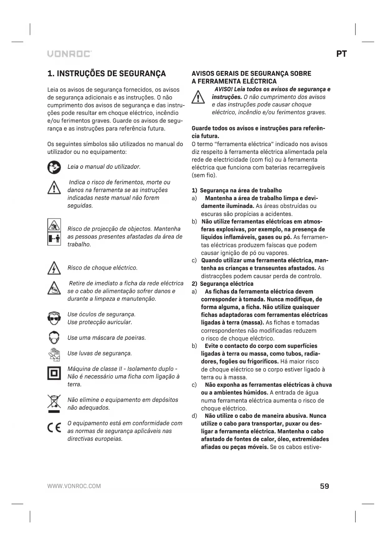 Limpe acaixa da máquina com regularidade com um pano macio, de preferência após cada utili- zação. As aberturas de ventilação não devem ter pó ou sujidade. Retire asujidade muito persistente com um pano macio humedecido com água de sabão. Não utilize solventes, como gasolina, álcool, amoníaco, etc. Este tipo de produtos químicos danificam os componentes sintéticos. AMBIENTE Os equipamentos eléctricos ou electrónicos defeituosos e/ou eliminados devem ser recolhidos em locais de reciclagem adequa- dos. Apenas para os países da CE Não elimine as ferramentas eléctricas em conjun- to com os resíduos domésticos. De acordo com adirectiva europeia 2012/19/CE sobre resíduos de equipamentos eléctricos e electrónicos e ares- pectiva implementação na legislação nacional, as ferramentas eléctricas que já não sejam utilizadas devem ser recolhidas em separado e eliminadas de maneira ecológica. GARANTIA Os produtos da VONROC são desenvolvidos de acordo com os padrões de qualidade mais eleva- dos e não têm quaisquer defeitos em termos de materiais e mão-de-obra em relação ao período estipulado por lei, cujo início é apartir da data de compra original. Se oequipamento apresentar qualquer falha durante este período devido aqual- quer defeito no material e/ou de mão-de-obra, contacte aVONROC directamente. As seguintes circunstâncias estão excluídas desta garantia: