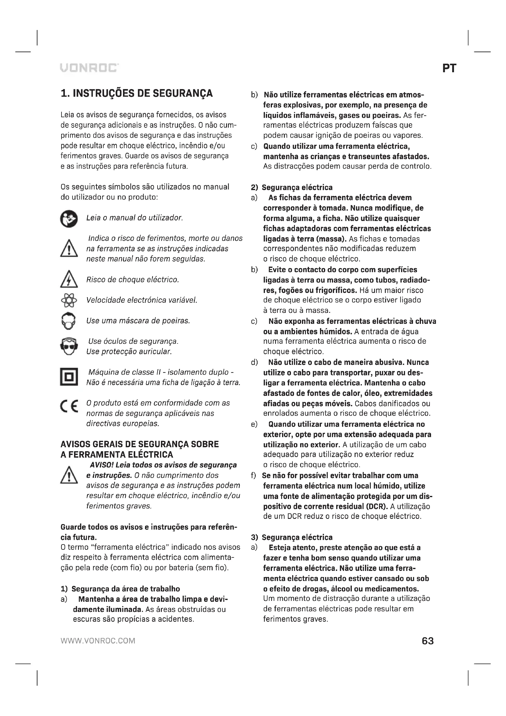 AMBIENTE Os equipamentos eléctricos ou electrónicos defeituosos e/ou eliminados devem ser recolhidos em locais de reciclagem adequa- dos. Apenas para os países da CE Não elimine as ferramentas eléctricas em conjun- to com os resíduos domésticos. De acordo com a directiva europeia 2012/19/CE sobre resíduos de equipamentos eléctricos e electrónicos e a respectiva implementação na legislação nacional, as ferramentas eléctricas que já não sejam utilizadas devem ser recolhidas em separado e eliminadas de maneira ecológica. GARANTIA Os produtos da VONROC são desenvolvidos de acordo com os padrões de qualidade mais elevados e não apresentam quaisquer defeitos em termos de mate- riais e mão-de-obra em relação ao período estipu- lado por lei, cujo início é a partir da data de compra original. Se o produto apresentar qualquer falha durante este período devido a qualquer defeito no material e/ou de mão-de-obra, contacte a VONROC directamente. As seguintes circunstâncias estão excluídas desta garantia: