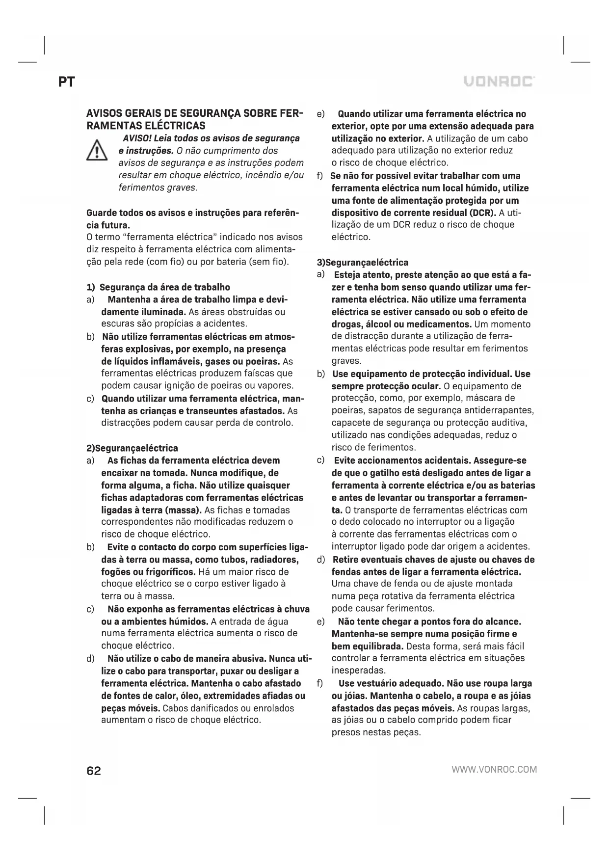 Antes de efectuar a limpeza e a manuten- ção, desligue sempre a máquina e retire aficha de alimentação da tomada decorrente. Limpe a caixa da máquina com regularidade com um pano macio, de preferência após cada utili- zação. Certifique-se de que as aberturas de ventila- ção não têm pó ou sujidade. Retire a sujidade muito persistente com um pano macio humedecido com água de sabão. Não utilize solventes, como gasolina, álcool, amoníaco, etc. Este tipo de produ- tos químicos danificam os componentes sintéticos. AMBIENTE Os equipamentos eléctricos ou electrónicos defeituosos e/ou eliminados devem serrecolhidos em locais de reciclagem adequados. Apenas para os países da CE Não elimine as ferramentas eléctricas em conjunto com os resíduos domésticos. De acordo com adirectiva europeia 2012/19/CE sobre resíduos de equipamentos eléctricos e electrónicos e a res- pectiva implementação na legislação nacional, as ferramentas eléctricas que já não sejam utilizadas devem ser recolhidas em separado e eliminadas de maneira ecológica. GARANTIA Os produtos da VONROC são desenvolvidos de acordo com os padrões de qualidade mais ele- vados e não apresentam quaisquer defeitos em termos de materiais e mão-de-obra em relação ao período estipulado por lei, cujo início é a partir da data de compra original. Se o produto apresen- tar qualquer falha durante este período devido a qualquer defeito no material e/ou de mão-de-obra, contacte a VONROC directamente. As seguintes circunstâncias estão excluídas desta garantia: