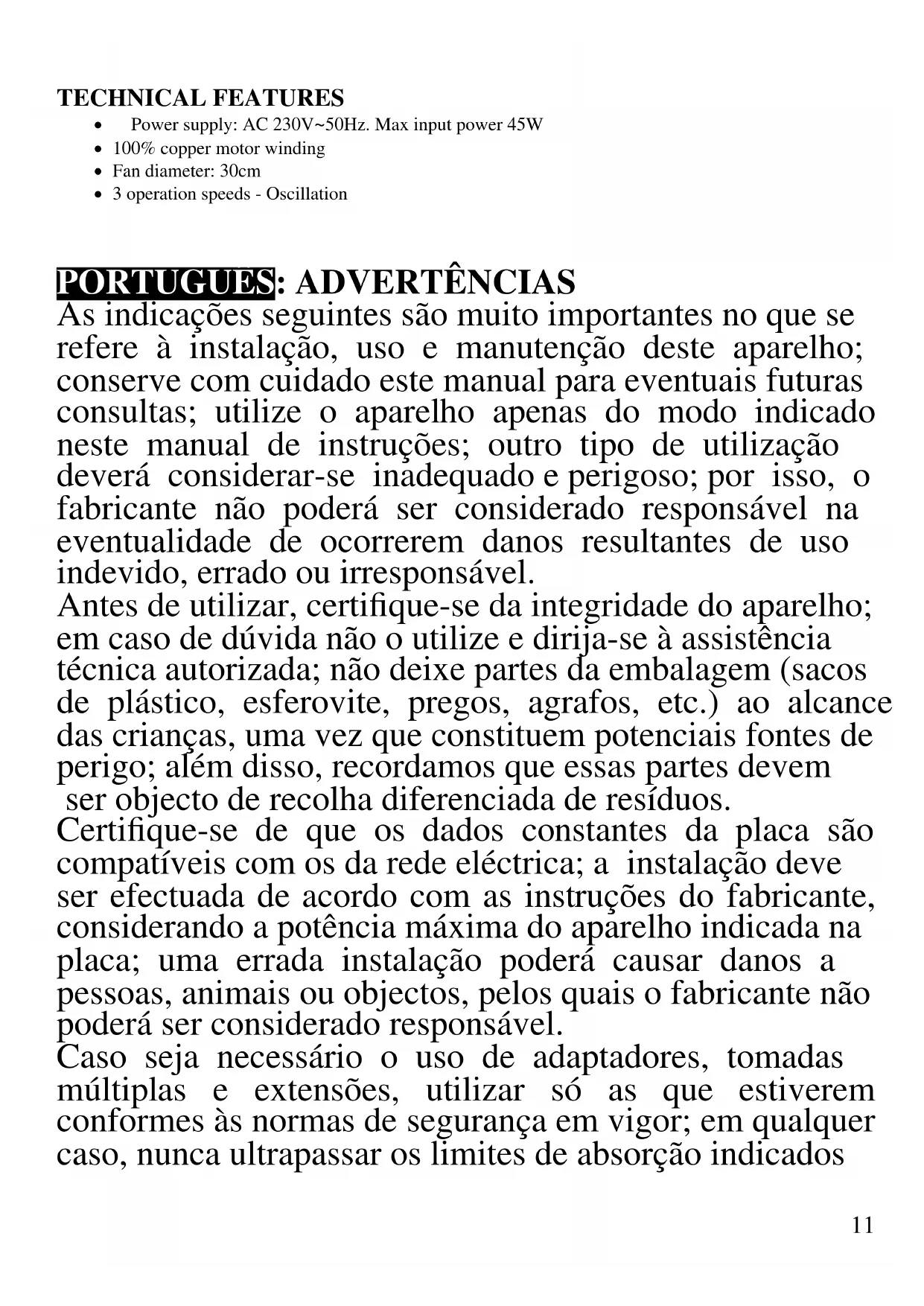 A instalação do ventilador está concluída. FUNCIONAMENTO No painel de controlo (10) ajuste a velocidade de rotação do ventilador e, por conseguinte, a força de ventilação. - 0: desligado - 1: velocidade baixa - 2: velocidade média - 3: velocidade alta OSCILAÇÃO A oscilação horizontal do ventilador só é possível quando o ventilador está desligado e é activado pressionando o pino (7) para baixo até que se encaixe. Levantando o pino (7) a função fica desactivada15 LIMPEZA Desligue a fixa da tomada antes de efectuar qualquer operação de limpeza. Não mergulhe em água. Em todo o caso evitar salpicos de água ou outros líquidos de alcançar o corpo do motor. Não limpe com uma esponja de limpeza ou abrasivos, use um detergente neutro e um pano macio humedecido com água para limpar as peças. Seque o produto antes de colocá-lo novamente em funcionamento