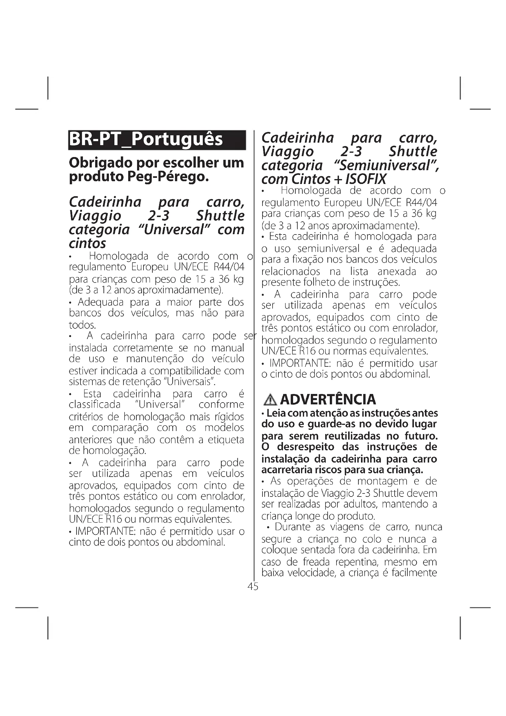 - Número progressivo de fabricação: personaliza cada cadeirinha, desde a emissão da homologação, cada uma é identificada pelo próprio número. Peg-Pérego S.p.A. Peg-Pérego SpA é uma empresa com sistema de gestão de qualidade certificado pela TÜV Italia Srl, de acordo com a norma ISO 9001. Peg Pérego poderá realizar em qualquer momento alterações nos modelos descritos nesta publicação, por motivos técnicos ou comerciais. Serviço de assistência Peg-Pérego Se, por acaso, partes do modelo forem perdidas ou danificadas, use apenas peças de reposição originais da Peg- Pérego. Para eventuais reparações, substituições, informações sobre os produtos, venda de peças originais e acessórios, contate o Serviço de Assistência Peg-Pérego indicando, se estiver presente, o número de série do produto. tel. 0039/039/60.88.213 chamada gratuita: 800/147.414 (com telefone fixo) fax 0039/039/33.09.992 e-mail assistenza@pegperego.it site internet www.pegperego.com Todos os direitos de propriedade intelectual relativos aos conteúdos deste manual de instruções pertencem à PEG-PEREGO S.p.A. e estão protegidos pelas leis vigentes.51 NL_Nederlands Hartelijk dank voor het kiezen voor een product van Peg-Pérego. Autozitje,Viaggio 2-3 Shuttle categorie "Universeel" met veiligheidsgordels