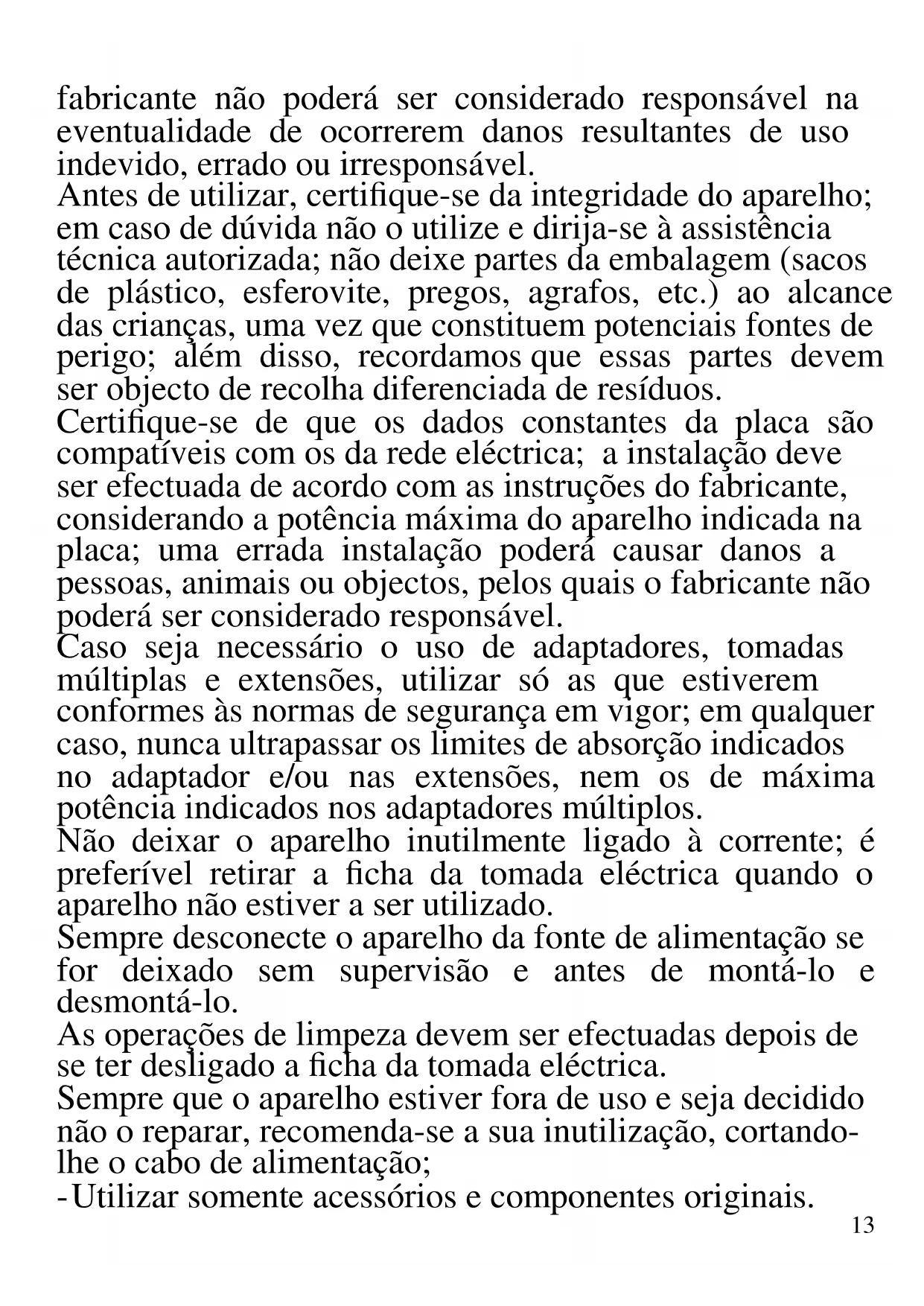 As indicações seguintes são muito importantes no que se refere à instalação, uso e manutenção deste aparelho; conserve com cuidado este manual para eventuais futuras consultas; utilize o aparelho apenas do modo indicado neste manual de instruções; outro tipo de utilização deverá considerar-se inadequado e perigoso; por isso, o13 fabricante não poderá ser considerado responsável na eventualidade de ocorrerem danos resultantes de uso indevido, errado ou irresponsável. Antes de utilizar, certifique-se da integridade do aparelho; em caso de dúvida não o utilize e dirija-se à assistência técnica autorizada; não deixe partes da embalagem (sacos de plástico, esferovite, pregos, agrafos, etc.) ao alcance das crianças, uma vez que constituem potenciais fontes de perigo; além disso, recordamos que essas partes devem ser objecto de recolha diferenciada de resíduos. Certifique-se de que os dados constantes da placa são compatíveis com os da rede eléctrica; a instalação deve ser efectuada de acordo com as instruções do fabricante, considerando a potência máxima do aparelho indicada na placa; uma errada instalação poderá causar danos a pessoas, animais ou objectos, pelos quais o fabricante não poderá ser considerado responsável. Caso seja necessário o uso de adaptadores, tomadas múltiplas e extensões, utilizar só as que estiverem conformes às normas de segurança em vigor; em qualquer caso, nunca ultrapassar os limites de absorção indicados no adaptador e/ou nas extensões, nem os de máxima potência indicados nos adaptadores múltiplos. Não deixar o aparelho inutilmente ligado à corrente; é preferível retirar a ficha da tomada eléctrica quando o aparelho não estiver a ser utilizado. Sempre desconecte o aparelho da fonte de alimentação se for deixado sem supervisão e antes de montá-lo e desmontá-lo. As operações de limpeza devem ser efectuadas depois de se ter desligado a ficha da tomada eléctrica. Sempre que o aparelho estiver fora de uso e seja decidido não o reparar, recomenda-se a sua inutilização, cortando- lhe o cabo de alimentação; - Utilizar somente acessórios e componentes originais.14 - Não aproximar o cabo de alimentação de objectos cortantes ou de superfícies quentes, e não o puxar para arrancar a ficha da tomada eléctrica. Não deixe que ele fique pendurado na bancada onde a criança pode segurá- lo. Não utilizar o aparelho no caso de o cabo de alimentação ou a ficha se encontrarem danificados, ou em caso de curto-circuitos; Nessa eventualidade, leve o aparelho a um centro de assistência autorizado. - Não expor o aparelho a condições atmosféricas adversas, como chuva, humidade, gelo, etc. Conserve-o em lugares secos. - Não manusear ou tocar o aparelho com as mãos molhadas ou os pés descalços. - Este aparelho não pode ser usado por crianças, mesmo com mais de 8 anos. - Este aparelho pode ser por pessoas com reduzida capacidade física, sensorial ou mental, ou ainda com falta de experiência na sua utilização, desde que lhes seja assegurada uma adequada supervisão ou se tiverem sido instruídas no uso do aparelho em segurança. - Mantenha o aparelho e o cabo de alimentação fora do alcance de crianças com menos de 8 anos de idade. - As crianças não devem brincar com o aparelho. - Não indicado para uso comercial. Só para uso doméstico. Em caso de avaria e/ou de mau funcionamento, não intervenha sobre o aparelho. Para uma eventual reparação dirija-se unicamente a um centro autorizado pelo fabricante e solicite peças de substituição originais. A não observância destas indicações pode comprometer a segurança do aparelho e tornar inválidos os termos da garantia. ATENÇÃO: este aparelho inclui uma função de aquecimento. Algumas superfícies, mesmo que não a placa propriamente dita, poderão atingir temperaturas15 elevadas. Uma vez que a sensibilidade à temperatura difere de pessoa para pessoa, este aparelho deverá ser usado com CUIDADO. Coloque o aparelho exclusivamente sobre superfícies com aderência e preparadas para o efeito, e use as necessárias medidas de protecção contra o calor, como pegas ou luvas. - Este aparelho foi concebido para uso doméstico ou equivalente, em situações como as de refeitórios em pequenas empresas ou outros ambientes de natureza laboral; por clientes de hotéis, motéis ou acomodação turística, como turismo rural ou residencial. - Este aparelho não foi concebido para ser utilizado por intermédio de um temporizador externo ou de um sistema de comando à distância autónomo. - Antes de cada utilização, soltar o cabo de alimentação. - Manter o aparelho afastado de materiais inflamáveis, fontes de calor, zonas frias e vapor. Não sujeite produto a impactos, pois isso pode danificá-lo