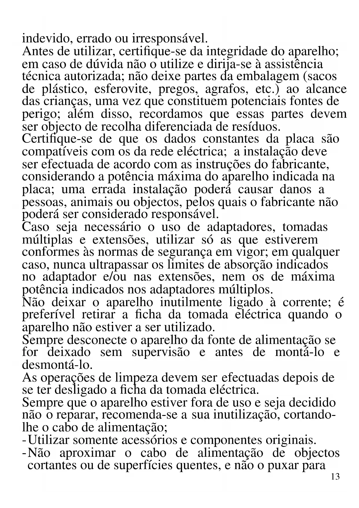 As indicações seguintes são muito importantes no que se refere à instalação, uso e manutenção deste aparelho; conserve com cuidado este manual para eventuais futuras consultas; utilize o aparelho apenas do modo indicado neste manual de instruções; outro tipo de utilização deverá considerar-se inadequado e perigoso; por isso, o fabricante não poderá ser considerado responsável na eventualidade de ocorrerem danos resultantes de uso13 indevido, errado ou irresponsável. Antes de utilizar, certifique-se da integridade do aparelho; em caso de dúvida não o utilize e dirija-se à assistência técnica autorizada; não deixe partes da embalagem (sacos de plástico, esferovite, pregos, agrafos, etc.) ao alcance das crianças, uma vez que constituem potenciais fontes de perigo; além disso, recordamos que essas partes devem ser objecto de recolha diferenciada de resíduos. Certifique-se de que os dados constantes da placa são compatíveis com os da rede eléctrica; a instalação deve ser efectuada de acordo com as instruções do fabricante, considerando a potência máxima do aparelho indicada na placa; uma errada instalação poderá causar danos a pessoas, animais ou objectos, pelos quais o fabricante não poderá ser considerado responsável. Caso seja necessário o uso de adaptadores, tomadas múltiplas e extensões, utilizar só as que estiverem conformes às normas de segurança em vigor; em qualquer caso, nunca ultrapassar os limites de absorção indicados no adaptador e/ou nas extensões, nem os de máxima potência indicados nos adaptadores múltiplos. Não deixar o aparelho inutilmente ligado à corrente; é preferível retirar a ficha da tomada eléctrica quando o aparelho não estiver a ser utilizado. Sempre desconecte o aparelho da fonte de alimentação se for deixado sem supervisão e antes de montá-lo e desmontá-lo. As operações de limpeza devem ser efectuadas depois de se ter desligado a ficha da tomada eléctrica. Sempre que o aparelho estiver fora de uso e seja decidido não o reparar, recomenda-se a sua inutilização, cortando- lhe o cabo de alimentação; - Utilizar somente acessórios e componentes originais. - Não aproximar o cabo de alimentação de objectos cortantes ou de superfícies quentes, e não o puxar para14 arrancar a ficha da tomada eléctrica. Não deixe que ele fique pendurado na bancada onde a criança pode segurá- lo. Não utilizar o aparelho no caso de o cabo de alimentação ou a ficha se encontrarem danificados, ou em caso de curto-circuitos; Nessa eventualidade, leve o aparelho a um centro de assistência autorizado. - Não expor o aparelho a condições atmosféricas adversas, como chuva, humidade, gelo, etc. Conserve-o em lugares secos. - Não manusear ou tocar o aparelho com as mãos molhadas ou os pés descalços. - Este aparelho não pode ser usado por crianças, mesmo com mais de 8 anos. - Este aparelho pode ser por pessoas com reduzida capacidade física, sensorial ou mental, ou ainda com falta de experiência na sua utilização, desde que lhes seja assegurada uma adequada supervisão ou se tiverem sido instruídas no uso do aparelho em segurança. - Mantenha o aparelho e o cabo de alimentação fora do alcance de crianças com menos de 8 anos de idade. - As crianças não devem brincar com o aparelho. - Não indicado para uso comercial. Só para uso doméstico. Em caso de avaria e/ou de mau funcionamento, não intervenha sobre o aparelho. Para uma eventual reparação dirija-se unicamente a um centro autorizado pelo fabricante e solicite peças de substituição originais. A não observância destas indicações pode comprometer a segurança do aparelho e tornar inválidos os termos da garantia. ATENÇÃO: este aparelho inclui uma função de aquecimento. Algumas superfícies, mesmo que não a placa propriamente dita, poderão atingir temperaturas elevadas. Uma vez que a sensibilidade à temperatura difere de pessoa para pessoa, este aparelho deverá ser15 usado com CUIDADO. Coloque o aparelho exclusivamente sobre superfícies com aderência e preparadas para o efeito, e use as necessárias medidas de protecção contra o calor, como pegas ou luvas. - Este aparelho foi concebido para uso doméstico ou equivalente, em situações como as de refeitórios em pequenas empresas ou outros ambientes de natureza laboral; por clientes de hotéis, motéis ou acomodação turística, como turismo rural ou residencial. - Este aparelho não foi concebido para ser utilizado por intermédio de um temporizador externo ou de um sistema de comando à distância autónomo. - Antes de cada utilização, soltar o cabo de alimentação. - Manter o aparelho afastado de materiais inflamáveis, fontes de calor, zonas frias e vapor. Não sujeite produto a impactos, pois isso pode danificá-lo