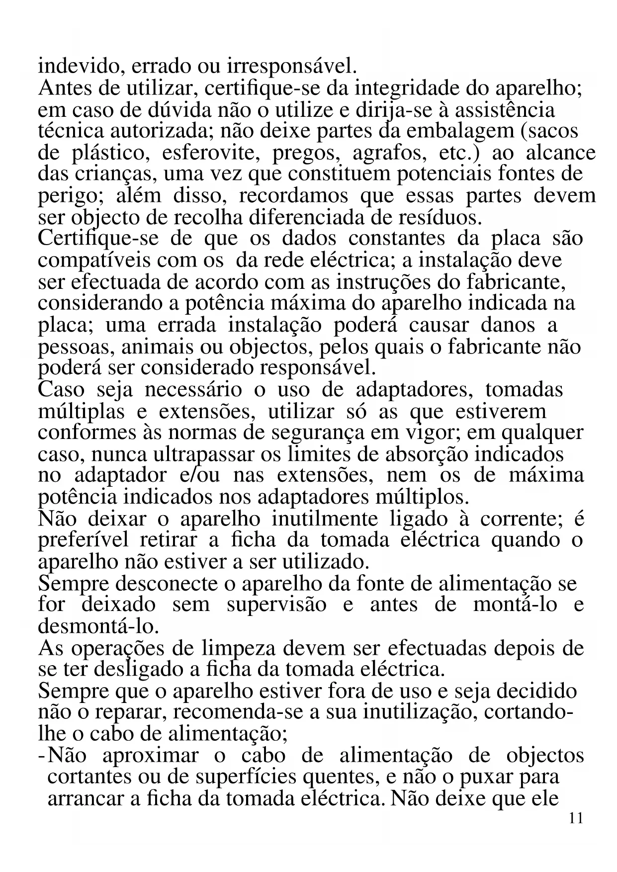 As indicações seguintes são muito importantes no que se refere à instalação, uso e manutenção deste aparelho; conserve com cuidado este manual para eventuais futuras consultas; utilize o aparelho apenas do modo indicado neste manual de instruções; outro tipo de utilização deverá considerar-se inadequado e perigoso; por isso, o fabricante não poderá ser considerado responsável na eventualidade de ocorrerem danos resultantes de uso11 indevido, errado ou irresponsável. Antes de utilizar, certifique-se da integridade do aparelho; em caso de dúvida não o utilize e dirija-se à assistência técnica autorizada; não deixe partes da embalagem (sacos de plástico, esferovite, pregos, agrafos, etc.) ao alcance das crianças, uma vez que constituem potenciais fontes de perigo; além disso, recordamos que essas partes devem ser objecto de recolha diferenciada de resíduos. Certifique-se de que os dados constantes da placa são compatíveis com os da rede eléctrica; a instalação deve ser efectuada de acordo com as instruções do fabricante, considerando a potência máxima do aparelho indicada na placa; uma errada instalação poderá causar danos a pessoas, animais ou objectos, pelos quais o fabricante não poderá ser considerado responsável. Caso seja necessário o uso de adaptadores, tomadas múltiplas e extensões, utilizar só as que estiverem conformes às normas de segurança em vigor; em qualquer caso, nunca ultrapassar os limites de absorção indicados no adaptador e/ou nas extensões, nem os de máxima potência indicados nos adaptadores múltiplos. Não deixar o aparelho inutilmente ligado à corrente; é preferível retirar a ficha da tomada eléctrica quando o aparelho não estiver a ser utilizado. Sempre desconecte o aparelho da fonte de alimentação se for deixado sem supervisão e antes de montá-lo e desmontá-lo. As operações de limpeza devem ser efectuadas depois de se ter desligado a ficha da tomada eléctrica. Sempre que o aparelho estiver fora de uso e seja decidido não o reparar, recomenda-se a sua inutilização, cortando- lhe o cabo de alimentação; - Não aproximar o cabo de alimentação de objectos cortantes ou de superfícies quentes, e não o puxar para arrancar a ficha da tomada eléctrica. Não deixe que ele12 fique pendurado na bancada onde a criança pode segurá- lo. Não utilizar o aparelho no caso de o cabo de alimentação ou a ficha se encontrarem danificados, ou em caso de curto-circuitos; Nessa eventualidade, leve o aparelho a um centro de assistência autorizado. - Não expor o aparelho a condições atmosféricas adversas, como chuva, humidade, gelo, etc. Conserve-o em lugares secos. Não manusear ou tocar o aparelho com as mãos molhadas ou os pés descalços. - Este aparelho pode ser utilizado por crianças com mais de 8 anos e por pessoas com reduzida capacidade física, sensorial ou mental, ou ainda com falta de experiência na sua utilização, desde que lhes seja assegurada uma adequada supervisão ou se tiverem sido instruídas no uso do aparelho em segurança; as operações de limpeza e de manutenção não devem ser efectuadas por crianças, a menos que tenham mais de 8 anos e sejam supervisionadas. - As crianças não devem brincar com o aparelho. - Mantenha o aparelho e o cabo de alimentação fora do alcance de crianças com menos de 8 anos de idade. - Não indicado para uso comercial. Só para uso doméstico Em caso de avaria e/ou de mau funcionamento, não intervenha sobre o aparelho. Para uma eventual reparação dirija-se a um centro autorizado pelo fabricante e solicite peças de substituição originais. A não observância destas indicações pode comprometer a segurança do aparelho e tornar inválidos os termos da garantia ATENÇÃO: este aparelho inclui uma função de aquecimento. Algumas superfícies, mesmo que não a placa propriamente dita, poderão atingir temperaturas elevadas. Uma vez que a sensibilidade à temperatura difere de pessoa para pessoa, este aparelho deverá ser usado com CUIDADO. Coloque o aparelho exclusivamente sobre superfícies com aderência e13 preparadas para o efeito, e use as necessárias medidas de protecção contra o calor, como pegas ou luvas. - Este aparelho foi concebido para uso doméstico ou equivalente, em situações como as de refeitórios em pequenas empresas ou outros ambientes de natureza laboral; por clientes de hotéis, motéis ou acomodação turística, como turismo rural ou residencial. - Este aparelho não foi concebido para ser utilizado por intermédio de um temporizador externo ou de um sistema de comando à distância autónomo. - Antes de cada utilização, soltar o cabo de alimentação. - Utilizar somente acessórios e componentes originais. Não sujeite produto a impactos, pois isso pode danificá-lo - Manter o aparelho afastado de materiais inflamáveis, fontes de calor, zonas frias e vapor.