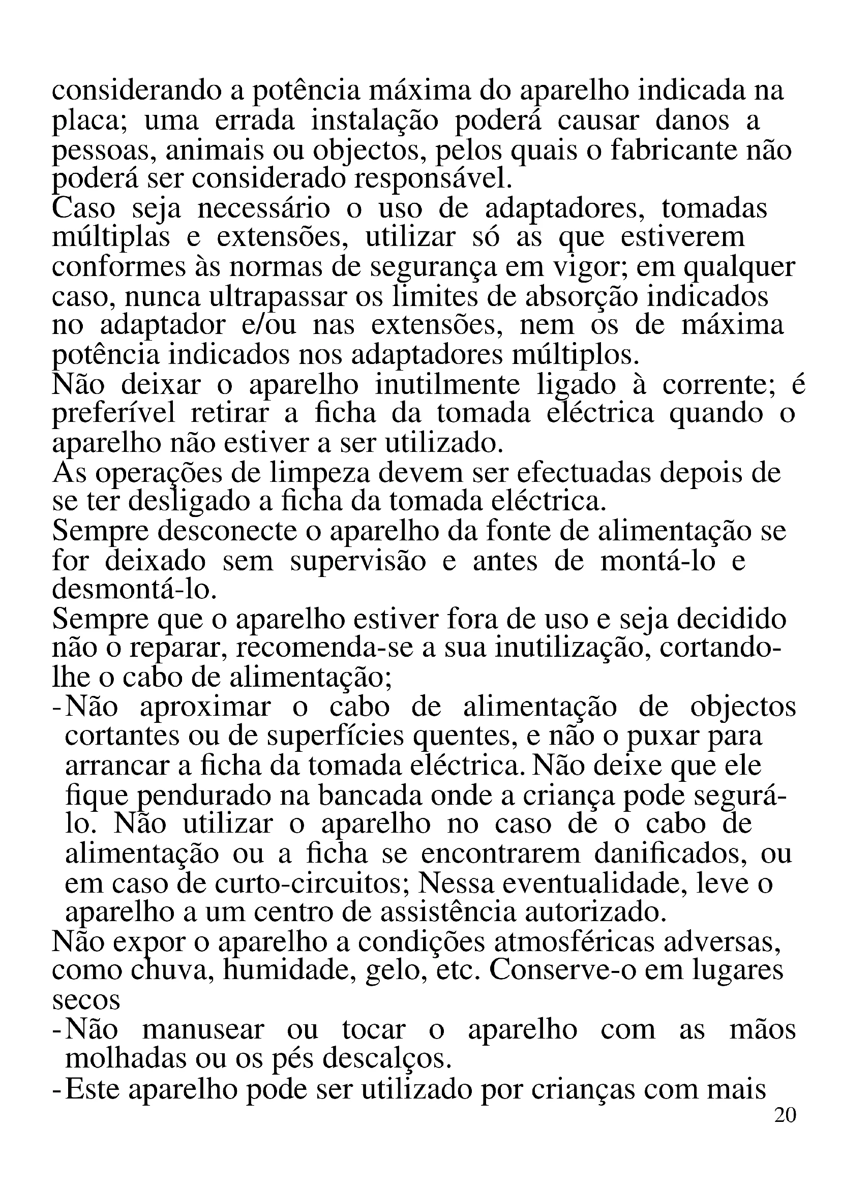 As indicações seguintes são muito importantes no que se refere à instalação, uso e manutenção deste aparelho; conserve com cuidado este manual para eventuais futuras consultas; utilize o aparelho apenas do modo indicado neste manual de instruções; outro tipo de utilização deverá considerar-se inadequado e perigoso; por isso, o fabricante não poderá ser considerado responsável na eventualidade de ocorrerem danos resultantes de uso indevido, errado ou irresponsável. Antes de utilizar, certifique-se da integridade do aparelho; em caso de dúvida não o utilize e dirija-se à assistência técnica autorizada; não deixe partes da embalagem (sacos de plástico, esferovite, pregos, agrafos, etc.) ao alcance das crianças, uma vez que constituem potenciais fontes de perigo; além disso, recordamos que essas partes devem ser objecto de recolha diferenciada de resíduos. Certifique-se de que os dados constantes da placa são compatíveis com os da rede eléctrica; a instalação deve ser efectuada de acordo com as instruções do fabricante,20 considerando a potência máxima do aparelho indicada na placa; uma errada instalação poderá causar danos a pessoas, animais ou objectos, pelos quais o fabricante não poderá ser considerado responsável. Caso seja necessário o uso de adaptadores, tomadas múltiplas e extensões, utilizar só as que estiverem conformes às normas de segurança em vigor; em qualquer caso, nunca ultrapassar os limites de absorção indicados no adaptador e/ou nas extensões, nem os de máxima potência indicados nos adaptadores múltiplos. Não deixar o aparelho inutilmente ligado à corrente; é preferível retirar a ficha da tomada eléctrica quando o aparelho não estiver a ser utilizado. As operações de limpeza devem ser efectuadas depois de se ter desligado a ficha da tomada eléctrica. Sempre desconecte o aparelho da fonte de alimentação se for deixado sem supervisão e antes de montá-lo e desmontá-lo. Sempre que o aparelho estiver fora de uso e seja decidido não o reparar, recomenda-se a sua inutilização, cortando- lhe o cabo de alimentação; - Não aproximar o cabo de alimentação de objectos cortantes ou de superfícies quentes, e não o puxar para arrancar a ficha da tomada eléctrica. Não deixe que ele fique pendurado na bancada onde a criança pode segurá- lo. Não utilizar o aparelho no caso de o cabo de alimentação ou a ficha se encontrarem danificados, ou em caso de curto-circuitos; Nessa eventualidade, leve o aparelho a um centro de assistência autorizado. Não expor o aparelho a condições atmosféricas adversas, como chuva, humidade, gelo, etc. Conserve-o em lugares secos - Não manusear ou tocar o aparelho com as mãos molhadas ou os pés descalços. - Este aparelho pode ser utilizado por crianças com mais21 de 8 anos e por pessoas com reduzida capacidade física, sensorial ou mental, ou ainda com falta de experiência na sua utilização, desde que lhes seja assegurada uma adequada supervisão ou se tiverem sido instruídas no uso do aparelho em segurança; as operações de limpeza e de manutenção não devem ser efectuadas por crianças, a menos que tenham mais de 8 anos e sejam supervisionadas. - As crianças não devem brincar com o aparelho. - Mantenha o aparelho e o cabo de alimentação fora do alcance de crianças com menos de 8 anos de idade. Não indicado para uso comercial. Só para uso doméstico. Em caso de avaria e/ou de mau funcionamento, não intervenha sobre o aparelho. Para uma eventual reparação dirija-se unicamente a um centro autorizado pelo fabricante e solicite peças de substituição originais. A não observância destas indicações pode comprometer a segurança do aparelho e tornar inválidos os termos da garantia. ATENÇÃO: este aparelho inclui uma função de aquecimento. Algumas superfícies, mesmo que não a placa propriamente dita, poderão atingir temperaturas elevadas. Uma vez que a sensibilidade à temperatura difere de pessoa para pessoa, este aparelho deverá ser usado com CUIDADO. Coloque o aparelho exclusivamente sobre superfícies com aderência e preparadas para o efeito, e use as necessárias medidas de protecção contra o calor, como pegas ou luvas. - Este aparelho foi concebido para uso doméstico ou equivalente, em situações como as de refeitórios em pequenas empresas ou outros ambientes de natureza laboral; por clientes de hotéis, motéis ou acomodação turística, como turismo rural ou residencial. - Este aparelho não foi concebido para ser utilizado por22 intermédio de um temporizador externo ou de um sistema de comando à distância autónomo. - Antes de cada utilização, soltar o cabo de alimentação. - Utilizar somente acessórios e componentes originais. Não sujeite produto a impactos, pois isso pode danificá-lo - Manter o aparelho afastado de materiais inflamáveis, fontes de calor, zonas frias e vapor.