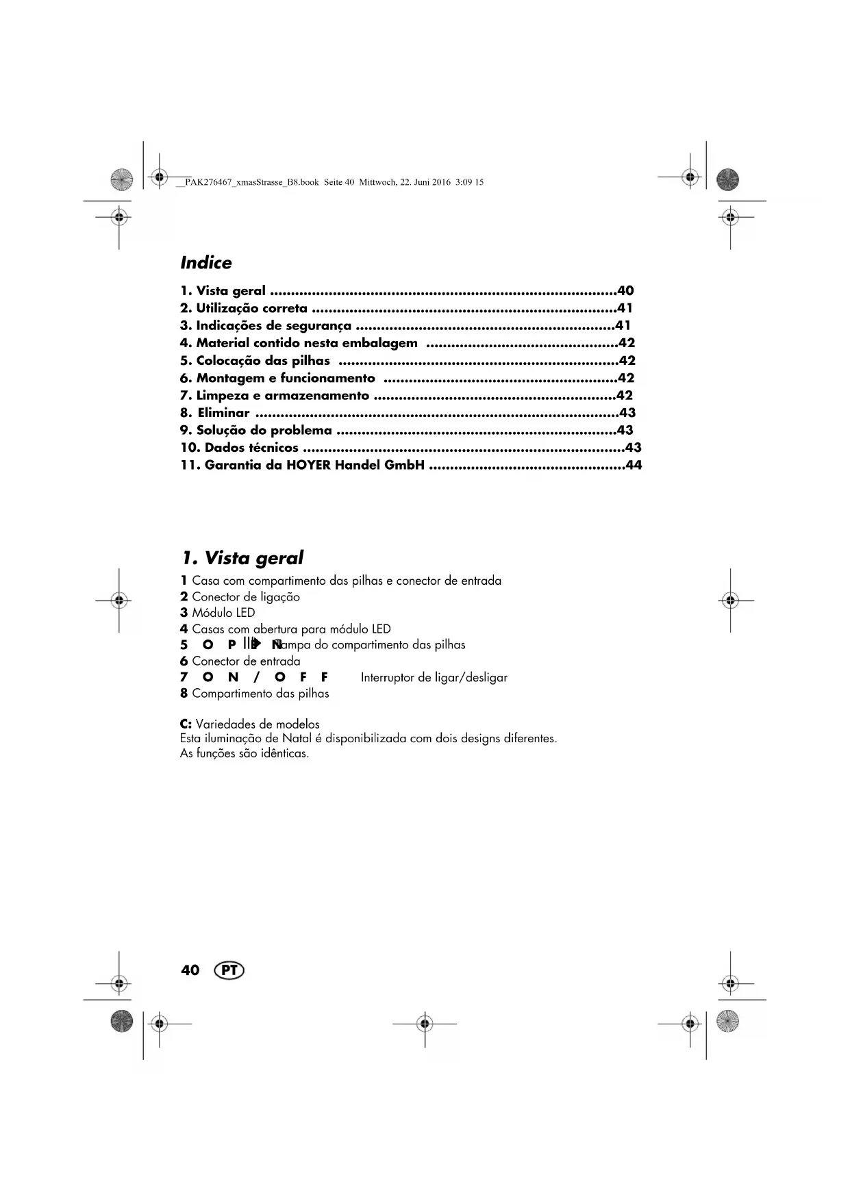 Tampa do compartimento das pilhas 6 Conector de entrada 7ON/OFF Interruptor de ligar/desligar 8 Compartimento das pilhas C: Variedades de modelos Esta iluminação de Natal é disponibilizada com dois designs diferentes. As funções são idênticas. __PAK276467_xmasStrasse_B8.book Seite 40 Mittwoch, 22. Juni 2016 3:09 1541