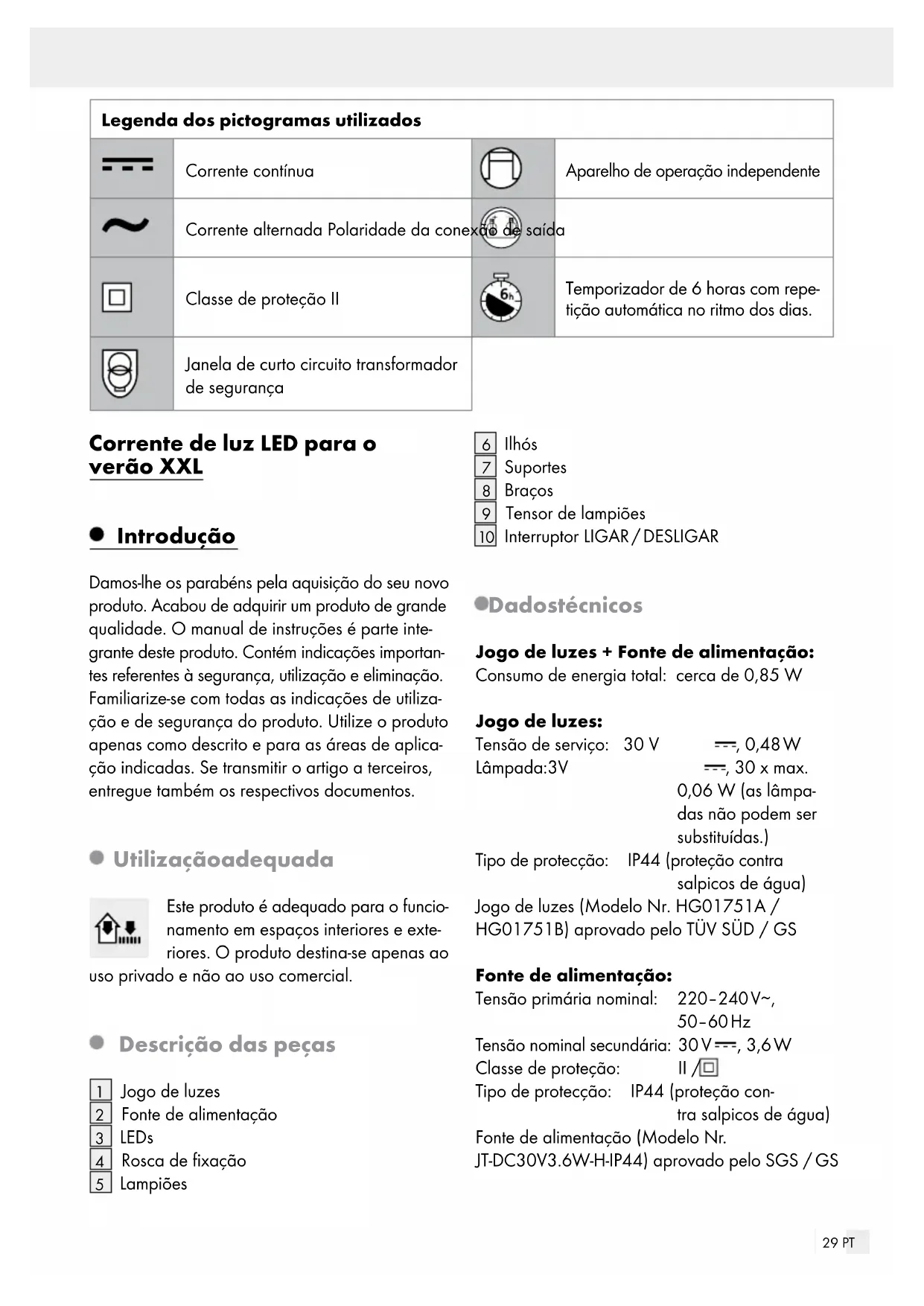 Interruptor LIGAR / DESLIGAR Dados técnicos Jogo de luzes + Fonte de alimentação: Consumo de energia total: cerca de 0,85 W Jogo de luzes: Tensão de serviço: 30 V , 0,48 W Lâmpada: 3 V , 30 x max. 0,06 W (as lâmpa- das não podem ser substituídas.) Tipo de protecção: IP44 (proteção contra salpicos de água) Jogo de luzes (Modelo Nr. HG01751A / HG01751B) aprovado pelo TÜV SÜD / GS Fonte de alimentação: Tensão primária nominal: 220–240 V∼, 50–60 Hz Tensão nominal secundária: 30 V , 3,6 W Classe de proteção: II / Tipo de protecção: IP44 (proteção con- tra salpicos de água) Fonte de alimentação (Modelo Nr. JT-DC30V3.6W-H-IP44) aprovado pelo SGS / GS30 PT Material fornecido 1 corrente de luz LED para o verão XXL 15 Laternas 1 fonte de alimentação 1 manual de instruções Indicações de segurança