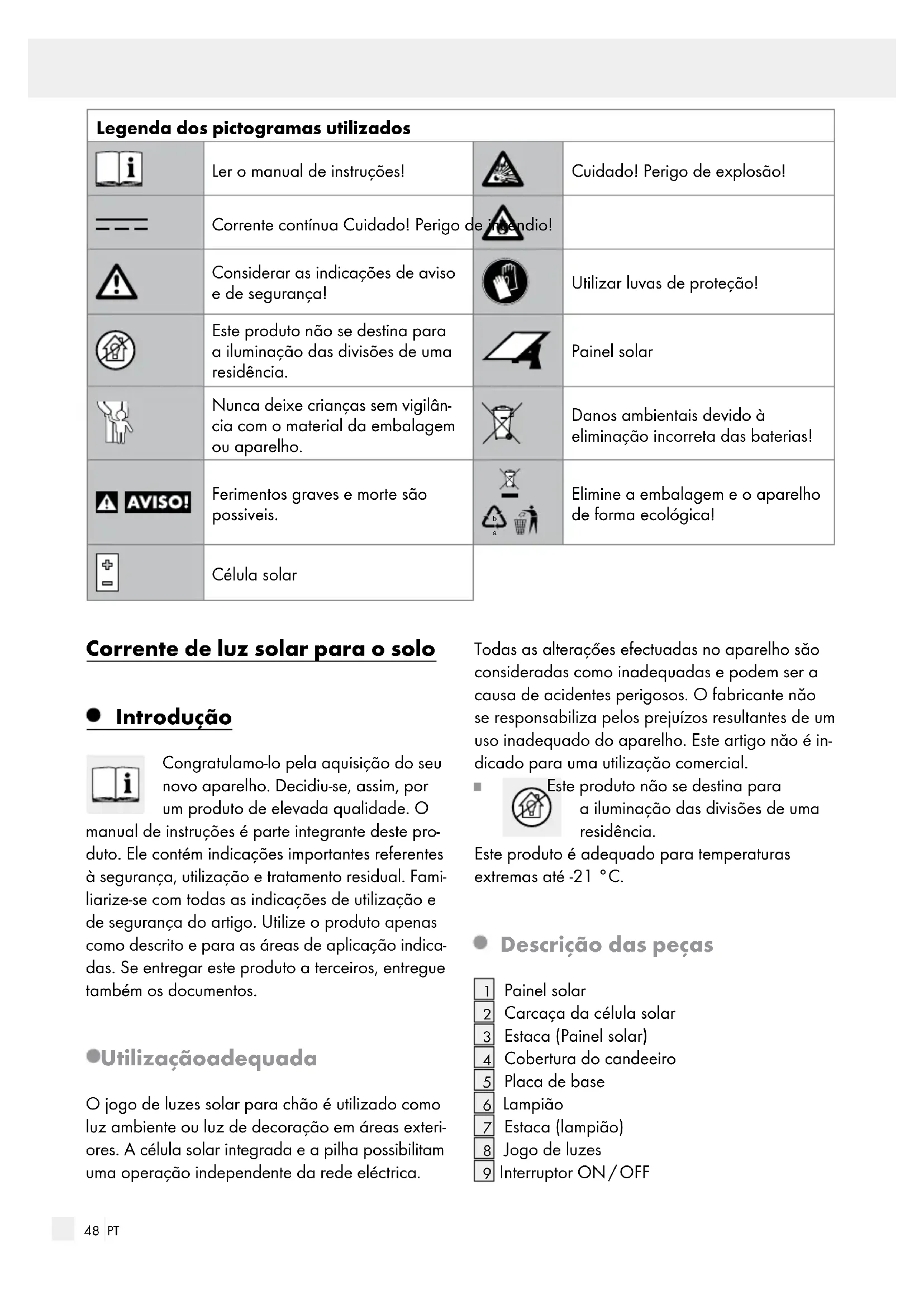 Elimine a embalagem e o aparelho de forma ecológica! Célula solar Corrente de luz solar para o solo Introdução Congratulamo-lo pela aquisição do seu novo aparelho. Decidiu-se, assim, por um produto de elevada qualidade. O manual de instruções é parte integrante deste pro- duto. Ele contém indicações importantes referentes à segurança, utilização e tratamento residual. Fami- liarize-se com todas as indicações de utilização e de segurança do artigo. Utilize o produto apenas como descrito e para as áreas de aplicação indica- das. Se entregar este produto a terceiros, entregue também os documentos. Utilização adequada O jogo de luzes solar para chão é utilizado como luz ambiente ou luz de decoração em áreas exteri- ores. A célula solar integrada e a pilha possibilitam uma operação independente da rede eléctrica. Todas as alteraçőes efectuadas no aparelho săo consideradas como inadequadas e podem ser a causa de acidentes perigosos. O fabricante năo se responsabiliza pelos prejuízos resultantes de um uso inadequado do aparelho. Este artigo năo é in- dicado para uma utilizaçăo comercial. Este produto não se destina para a iluminação das divisões de uma residência. Este produto é adequado para temperaturas extremas até -21 °C. Descrição das peças