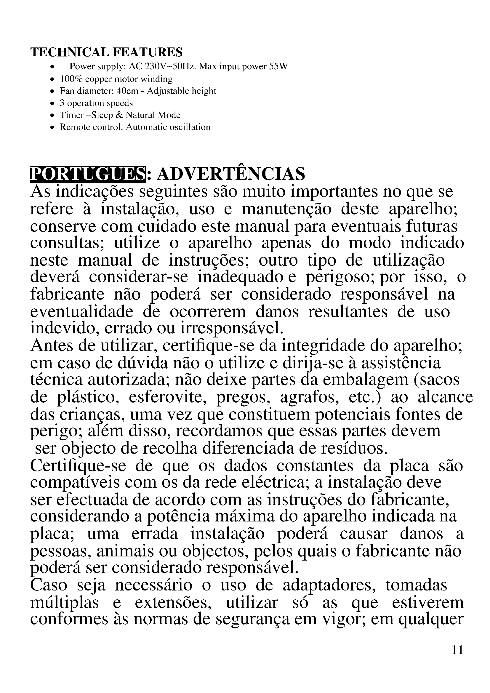 Pressionando uma vez o botão MODE no telecomando, ativa-se a função NATURAL e o indicador NTRL irá acender no display. Este modo reproduz o sopro natural do vento, seguindo um ciclo predefinido, onde a força se regula automaticamente desde um sopro ligeiro até rajadas mais potentes. Pressionando novamente o botão MODE irá se ativar a função SLEEP e o indicador SLP no display irá se acender. Este modo é ideal para a noite; o ciclo predefinido alterna a cada 30 minutos entre rajadas mais potentes e ligeiras com momentos de calma para um maior conforto durante o sono.15 TELECOMANDO Abrir a tampa localizada na parte traseira do telecomando e insira 2 pilhas de 1,5V tipo AAA, certificando-se que a polaridade da pilha corresponde ao desenho no interior do compartimento. Fechar a tampa antes de usar o telecomando. - Nunca usar uma pilha nova e uma velha ao mesmo tempo. - Sempre que seja previsível a não utilização do telecomando durante um longo período de tempo, proceda a remoção das pilhas do mesmo - O período recomendado da eficiência de umas pilhas é de acordo com as normas IEC é de aproximadamente 6 – 12 meses de utilização normal. O período de efetividade recomendado encontra-se nas pilhas ou na embalagem das mesmas. Se ultrapassar esse período ou se usar pilhas não recomendadas, o ácido da pilha pode derramar-se e danificar o telecomando. - Ao terminar a período de duração das pilhas, estas devem ser eliminadas separadamente do restante lixo domestico, Recomenda-se que disponha das pilhas de forma correta e de acordo com as normas legais em vigor, entregando num centro de recolha de resíduos diferenciados, ou um centro de reciclagem. LIMPEZA Desligar a fixa da tomada antes de efetuar qualquer operação de limpeza. Não mergulhe em água. Em todo o caso evitar que salpicos de água ou outros líquidos possam alcançar o corpo do motor. Nunca limpar com uma esponja ou produtos abrasivos, use um detergente neutro e um pano macio humedecido com água para limpar as peças. - Seque o produto antes de colocá-lo novamente em funcionamento Características Técnicas