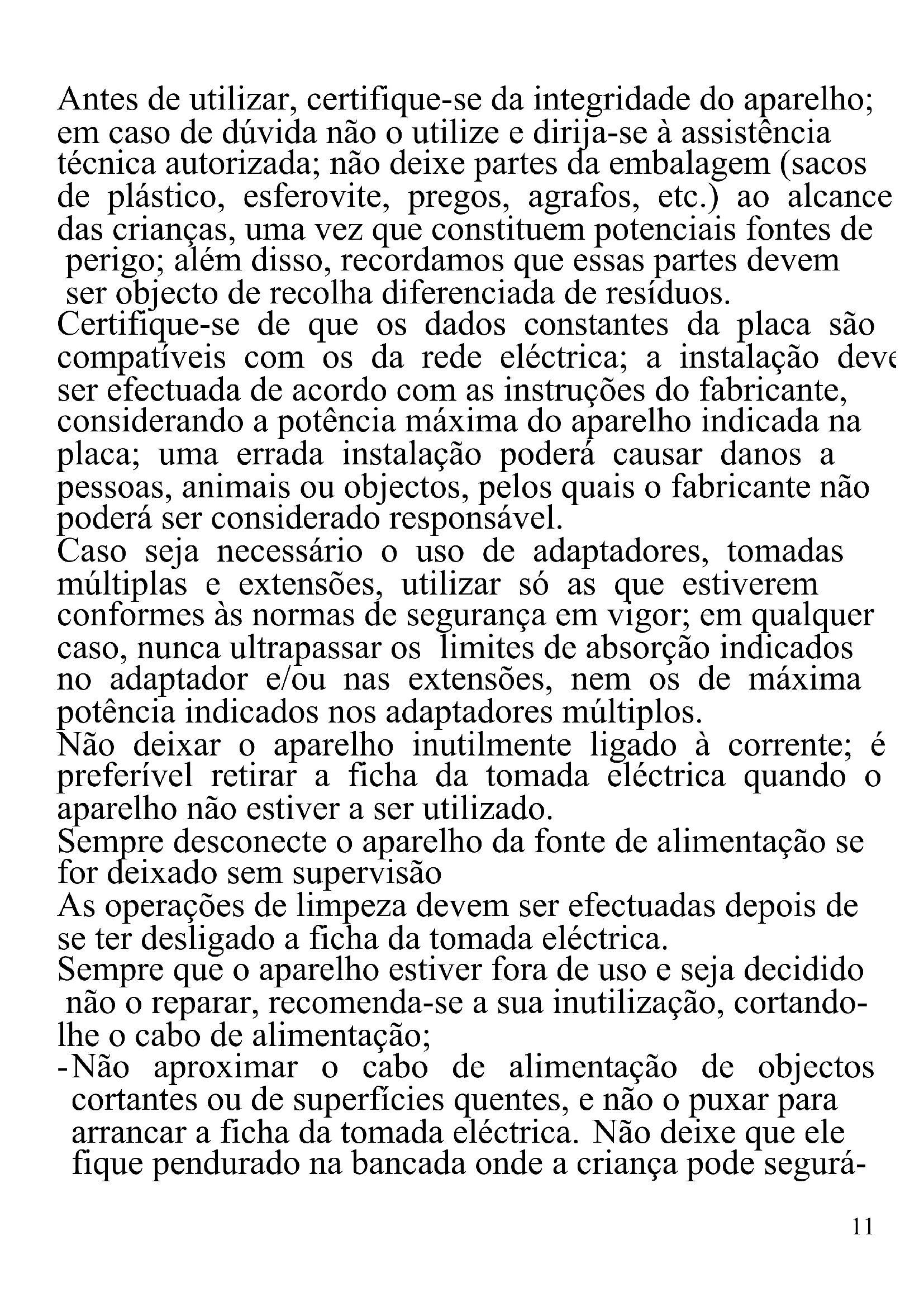 As indicações seguintes são muito importantes no que se refere à instalação, uso e manutenção deste aparelho; conserve com cuidado este manual para eventuais futuras consultas; utilize o aparelho apenas do modo indicado neste manual de instruções; outro tipo de utilização deverá considerar-se inadequado e perigoso; por isso, o fabricante não poderá ser considerado responsável na eventualidade de ocorrerem danos resultantes de uso indevido, errado ou irresponsável.11 Antes de utilizar, certifique-se da integridade do aparelho; em caso de dúvida não o utilize e dirija-se à assistência técnica autorizada; não deixe partes da embalagem (sacos de plástico, esferovite, pregos, agrafos, etc.) ao alcance das crianças, uma vez que constituem potenciais fontes de perigo; além disso, recordamos que essas partes devem ser objecto de recolha diferenciada de resíduos. Certifique-se de que os dados constantes da placa são compatíveis com os da rede eléctrica; a instalação deve ser efectuada de acordo com as instruções do fabricante, considerando a potência máxima do aparelho indicada na placa; uma errada instalação poderá causar danos a pessoas, animais ou objectos, pelos quais o fabricante não poderá ser considerado responsável. Caso seja necessário o uso de adaptadores, tomadas múltiplas e extensões, utilizar só as que estiverem conformes às normas de segurança em vigor; em qualquer caso, nunca ultrapassar os limites de absorção indicados no adaptador e/ou nas extensões, nem os de máxima potência indicados nos adaptadores múltiplos. Não deixar o aparelho inutilmente ligado à corrente; é preferível retirar a ficha da tomada eléctrica quando o aparelho não estiver a ser utilizado. Sempre desconecte o aparelho da fonte de alimentação se for deixado sem supervisão As operações de limpeza devem ser efectuadas depois de se ter desligado a ficha da tomada eléctrica. Sempre que o aparelho estiver fora de uso e seja decidido não o reparar, recomenda-se a sua inutilização, cortando- lhe o cabo de alimentação; - Não aproximar o cabo de alimentação de objectos cortantes ou de superfícies quentes, e não o puxar para arrancar a ficha da tomada eléctrica. Não deixe que ele fique pendurado na bancada onde a criança pode segurá-12 lo. Não utilizar o aparelho no caso de o cabo de alimentação ou a ficha se encontrarem danificados, ou em caso de curto-circuitos; Nessa eventualidade, leve o aparelho a um centro de assistência autorizado. - Não expor o aparelho a condições atmosféricas adversas, como chuva, humidade, gelo, etc. Conserve-o em lugares secos. Não manusear ou tocar o aparelho com as mãos molhadas ou os pés descalços. - Este aparelho pode ser utilizado por crianças com mais de 8 anos e por pessoas com reduzida capacidade física, sensorial ou mental, ou ainda com falta de experiência na sua utilização, desde que lhes seja assegurada uma adequada supervisão ou se tiverem sido instruídas no uso do aparelho em segurança; as operações de limpeza e de manutenção não devem ser efectuadas por crianças, a menos que tenham mais de 8 anos e sejam supervisionadas. - As crianças não devem brincar com o aparelho. - Mantenha o aparelho e o cabo de alimentação fora do alcance de crianças com menos de 8 anos de idade. Se o cabo de alimentação estiver danificado, ou em caso de falha e / ou avaria, não mexa no aparelho. Qualquer reparação deve ser realizada pelo fabricante ou pelo seu serviço de assistência técnica ou, em qualquer caso, por uma pessoa com qualificação semelhante, a fim de evitar qualquer risco. O não cumprimento dos itens acima pode comprometer a segurança do equipamento e invalidar os termos da garantia. - Este aparelho foi concebido para uso doméstico ou equivalente, em situações como as de refeitórios em pequenas empresas ou outros ambientes de natureza laboral; por clientes de hotéis, motéis ou acomodação turística, como turismo rural ou residencial. - Este aparelho não foi concebido para ser utilizado por13 intermédio de um temporizador externo ou de um sistema de comando à distância autónomo. - Antes de cada utilização, soltar o cabo de alimentação. - Utilizar somente acessórios e componentes originais. Não sujeite produto a impactos, pois isso pode danificá-lo