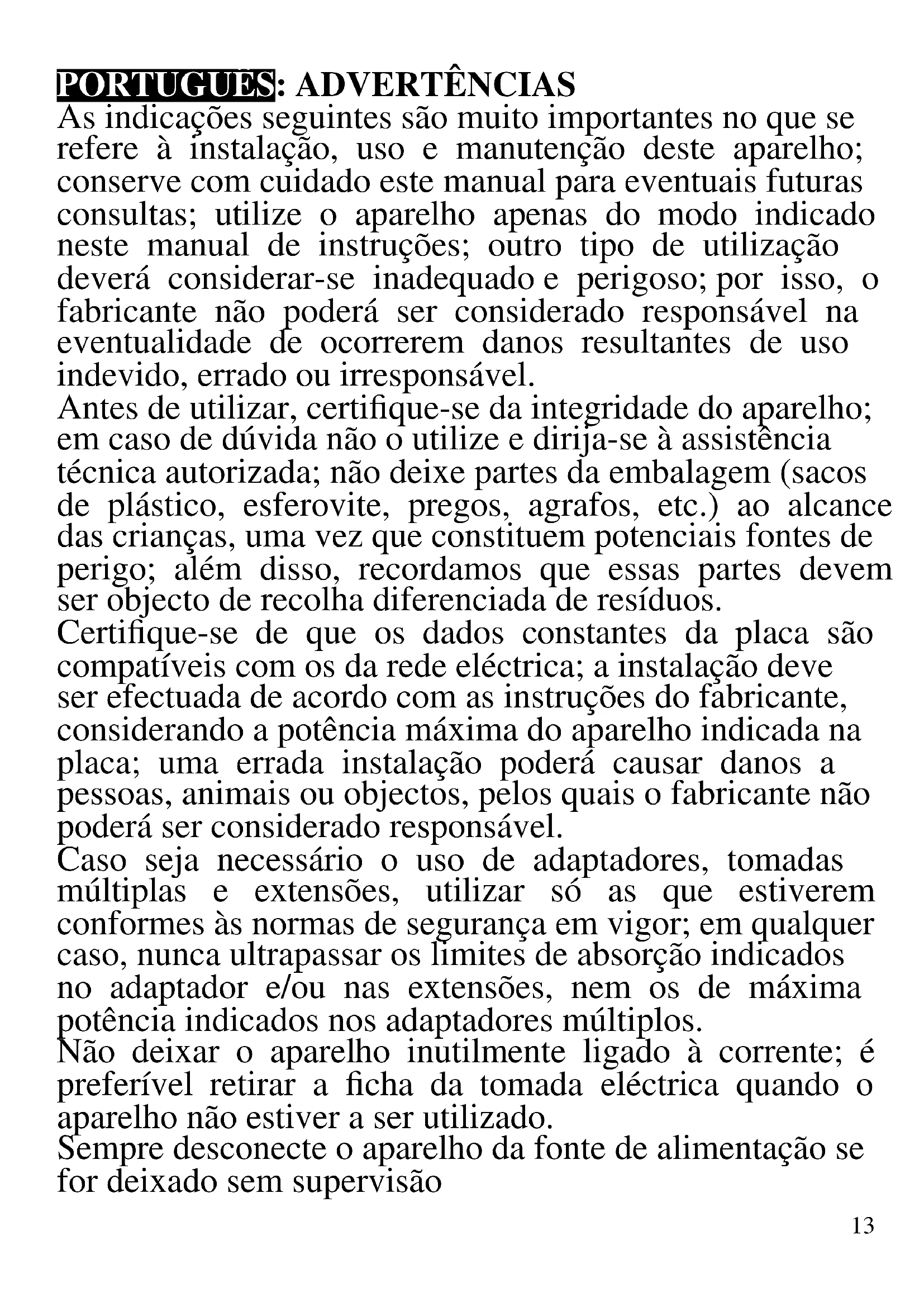 As indicações seguintes são muito importantes no que se refere à instalação, uso e manutenção deste aparelho; conserve com cuidado este manual para eventuais futuras consultas; utilize o aparelho apenas do modo indicado neste manual de instruções; outro tipo de utilização deverá considerar-se inadequado e perigoso; por isso, o fabricante não poderá ser considerado responsável na eventualidade de ocorrerem danos resultantes de uso indevido, errado ou irresponsável. Antes de utilizar, certifique-se da integridade do aparelho; em caso de dúvida não o utilize e dirija-se à assistência técnica autorizada; não deixe partes da embalagem (sacos de plástico, esferovite, pregos, agrafos, etc.) ao alcance das crianças, uma vez que constituem potenciais fontes de perigo; além disso, recordamos que essas partes devem ser objecto de recolha diferenciada de resíduos. Certifique-se de que os dados constantes da placa são compatíveis com os da rede eléctrica; a instalação deve ser efectuada de acordo com as instruções do fabricante, considerando a potência máxima do aparelho indicada na placa; uma errada instalação poderá causar danos a pessoas, animais ou objectos, pelos quais o fabricante não poderá ser considerado responsável. Caso seja necessário o uso de adaptadores, tomadas múltiplas e extensões, utilizar só as que estiverem conformes às normas de segurança em vigor; em qualquer caso, nunca ultrapassar os limites de absorção indicados no adaptador e/ou nas extensões, nem os de máxima potência indicados nos adaptadores múltiplos. Não deixar o aparelho inutilmente ligado à corrente; é preferível retirar a ficha da tomada eléctrica quando o aparelho não estiver a ser utilizado. Sempre desconecte o aparelho da fonte de alimentação se for deixado sem supervisão14 As operações de limpeza devem ser efectuadas depois de se ter desligado a ficha da tomada eléctrica. Sempre que o aparelho estiver fora de uso e seja decidido não o reparar, recomenda-se a sua inutilização, cortando- lhe o cabo de alimentação; - Não aproximar o cabo de alimentação de objectos cortantes ou de superfícies quentes, e não o puxar para arrancar a ficha da tomada eléctrica. Não deixe que ele fique pendurado na bancada onde a criança pode segurá- lo. Não utilizar o aparelho no caso de o cabo de alimentação ou a ficha se encontrarem danificados, ou em caso de curto-circuitos; Nessa eventualidade, leve o aparelho a um centro de assistência autorizado. - Não expor o aparelho a condições atmosféricas adversas, como chuva, humidade, gelo, etc. Conserve-o em lugares secos. - Não manusear ou tocar o aparelho com as mãos molhadas ou os pés descalços. - Este aparelho não pode ser usado por crianças, mesmo com mais de 8 anos. - Este aparelho pode ser por pessoas com reduzida capacidade física, sensorial ou mental, ou ainda com falta de experiência na sua utilização, desde que lhes seja assegurada uma adequada supervisão ou se tiverem sido instruídas no uso do aparelho em segurança. - As crianças não devem brincar com o aparelho. - Mantenha o aparelho e o cabo de alimentação fora do alcance de crianças com menos de 8 anos de idade. Se o cabo de alimentação estiver danificado, ou em caso de falha e / ou avaria, não mexa no aparelho. Qualquer reparação deve ser realizada pelo fabricante ou pelo seu serviço de assistência técnica ou, em qualquer caso, por uma pessoa com qualificação semelhante, a fim de evitar qualquer risco. O não cumprimento dos itens acima pode15 comprometer a segurança do equipamento e invalidar os termos da garantia. ATENÇÃO: este aparelho inclui uma função de aquecimento. Algumas superfícies, mesmo que não a placa propriamente dita, poderão atingir temperaturas elevadas. Uma vez que a sensibilidade à temperatura difere de pessoa para pessoa, este aparelho deverá ser usado com CUIDADO. Coloque o aparelho exclusivamente sobre superfícies com aderência e preparadas para o efeito, - Este aparelho foi concebido para uso doméstico ou equivalente, em situações como as de refeitórios em pequenas empresas ou outros ambientes de natureza laboral; por clientes de hotéis, motéis ou acomodação turística, como turismo rural ou residencial. - Este aparelho não foi concebido para ser utilizado por intermédio de um temporizador externo ou de um sistema de comando à distância autónomo. - Antes de cada utilização, soltar o cabo de alimentação. - Utilizar somente acessórios e componentes originais. Não sujeite produto a impactos, pois isso pode danificá-lo - Manter o aparelho afastado de materiais inflamáveis, fontes de calor, zonas frias e vapor.