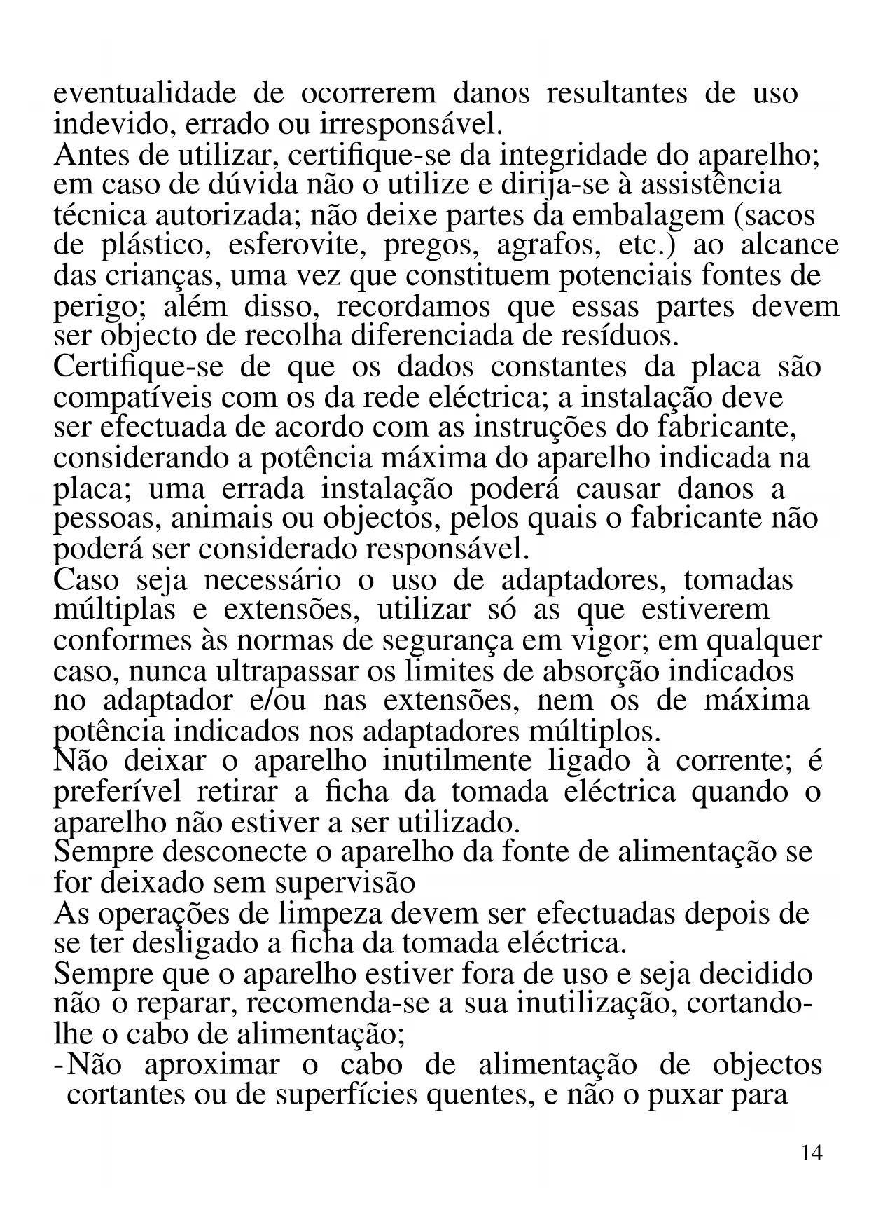 As indicações seguintes são muito importantes no que se refere à instalação, uso e manutenção deste aparelho; conserve com cuidado este manual para eventuais futuras consultas; utilize o aparelho apenas do modo indicado neste manual de instruções; outro tipo de utilização deverá considerar-se inadequado e perigoso; por isso, o fabricante não poderá ser considerado responsável na Fig. C14 eventualidade de ocorrerem danos resultantes de uso indevido, errado ou irresponsável. Antes de utilizar, certifique-se da integridade do aparelho; em caso de dúvida não o utilize e dirija-se à assistência técnica autorizada; não deixe partes da embalagem (sacos de plástico, esferovite, pregos, agrafos, etc.) ao alcance das crianças, uma vez que constituem potenciais fontes de perigo; além disso, recordamos que essas partes devem ser objecto de recolha diferenciada de resíduos. Certifique-se de que os dados constantes da placa são compatíveis com os da rede eléctrica; a instalação deve ser efectuada de acordo com as instruções do fabricante, considerando a potência máxima do aparelho indicada na placa; uma errada instalação poderá causar danos a pessoas, animais ou objectos, pelos quais o fabricante não poderá ser considerado responsável. Caso seja necessário o uso de adaptadores, tomadas múltiplas e extensões, utilizar só as que estiverem conformes às normas de segurança em vigor; em qualquer caso, nunca ultrapassar os limites de absorção indicados no adaptador e/ou nas extensões, nem os de máxima potência indicados nos adaptadores múltiplos. Não deixar o aparelho inutilmente ligado à corrente; é preferível retirar a ficha da tomada eléctrica quando o aparelho não estiver a ser utilizado. Sempre desconecte o aparelho da fonte de alimentação se for deixado sem supervisão As operações de limpeza devem ser efectuadas depois de se ter desligado a ficha da tomada eléctrica. Sempre que o aparelho estiver fora de uso e seja decidido não o reparar, recomenda-se a sua inutilização, cortando- lhe o cabo de alimentação; - Não aproximar o cabo de alimentação de objectos cortantes ou de superfícies quentes, e não o puxar para15 arrancar a ficha da tomada eléctrica. Não deixe que ele fique pendurado na bancada onde a criança pode segurá- lo. Não utilizar o aparelho no caso de o cabo de alimentação ou a ficha se encontrarem danificados, ou em caso de curto-circuitos; Nessa eventualidade, leve o aparelho a um centro de assistência autorizado. - Não expor o aparelho a condições atmosféricas adversas, como chuva, humidade, gelo, etc. Conserve-o em lugares secos. - Não manusear ou tocar o aparelho com as mãos molhadas ou os pés descalços. - Este aparelho pode ser utilizado por crianças com mais de 8 anos e por pessoas com reduzida capacidade física, sensorial ou mental, ou ainda com falta de experiência na sua utilização, desde que lhes seja assegurada uma adequada supervisão ou se tiverem sido instruídas no uso do aparelho em segurança; as operações de limpeza e de manutenção não devem ser efectuadas por crianças, a menos que tenham mais de 8 anos e sejam supervisionadas. - As crianças não devem brincar com o aparelho. - Mantenha o aparelho e o cabo de alimentação fora do alcance de crianças com menos de 8 anos de idade. Se o cabo de alimentação estiver danificado, ou em caso de falha e / ou avaria, não mexa no aparelho. Qualquer reparação deve ser realizada pelo fabricante ou pelo seu serviço de assistência técnica ou, em qualquer caso, por uma pessoa com qualificação semelhante, a fim de evitar qualquer risco. O não cumprimento dos itens acima pode comprometer a segurança do equipamento e invalidar os termos da garantia. ATENÇÃO: este aparelho inclui uma função de aquecimento. Algumas superfícies, mesmo que não a placa propriamente dita, poderão atingir temperaturas16 elevadas. Uma vez que a sensibilidade à temperatura difere de pessoa para pessoa, este aparelho deverá ser usado com CUIDADO. Coloque o aparelho exclusivamente sobre superfícies com aderência e preparadas para o efeito, - Este aparelho foi concebido para uso doméstico ou equivalente, em situações como as de refeitórios em pequenas empresas ou outros ambientes de natureza laboral; por clientes de hotéis, motéis ou acomodação turística, como turismo rural ou residencial. - Este aparelho não foi concebido para ser utilizado por intermédio de um temporizador externo ou de um sistema de comando à distância autónomo. - Antes de cada utilização, soltar o cabo de alimentação. - Utilizar somente acessórios e componentes originais. - Não sujeite o produto a impactos, pois isso pode danificá-lo. Manter o aparelho afastado de materiais inflamáveis, fontes de calor, zonas frias e vapor.
