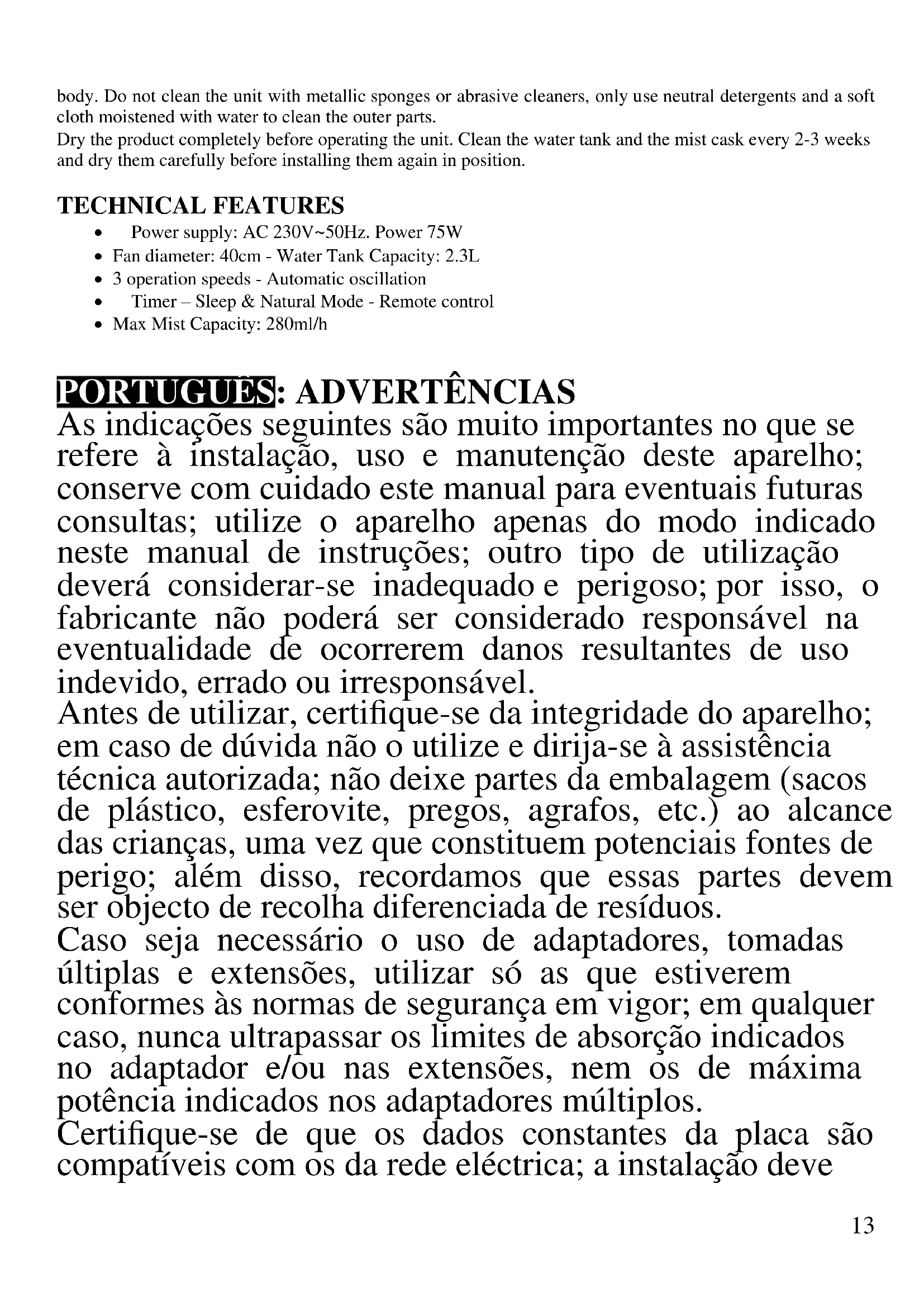 Quando você ligar o ventilador será ativada automaticamente para NORMAL. - Pressionando o botão MODE no controle remoto é possível ativar a função BRISA/NATURAL e o indicador acende-se no visor. Este modo reproduz a ação natural do vento, de acordo com ciclos que regulam o poder automaticamente a partir de um sopro leve até rajadas mais fortes. - Pressionando mais uma vez o botão MODE irá ativar a função SLEEP e o indicador acende-se no visor. Este recurso é ideal para a noite; os ciclos de ventilação estão pré-definidos e mudam a cada 30 minutos, alternando entre rajadas potentes e leves, com momentos de pausa e desligado para um maior conforto durante o sono. LIMPEZA Retire a ficha da tomada elétrica antes de realizar qualquer operação de limpeza. Não mergulhe na água. Em qualquer caso evitar salpicos de água ou de outros líquidos no corpo. Não limpe o equipamento com esponjas ou produtos abrasivos; utilize um detergente neutro e um pano macio humedecido com água para limpar as peças. Seque bem antes de colocá-la em funcionamento. Limpar o tanque de água e a bomba de pulverização pulverizador ligado a ela, a cada 2 ou 3 semanas e seque- os cuidadosamente antes de instalá-los novamente no seu lugar. CARATERISTICAS TECNICAS