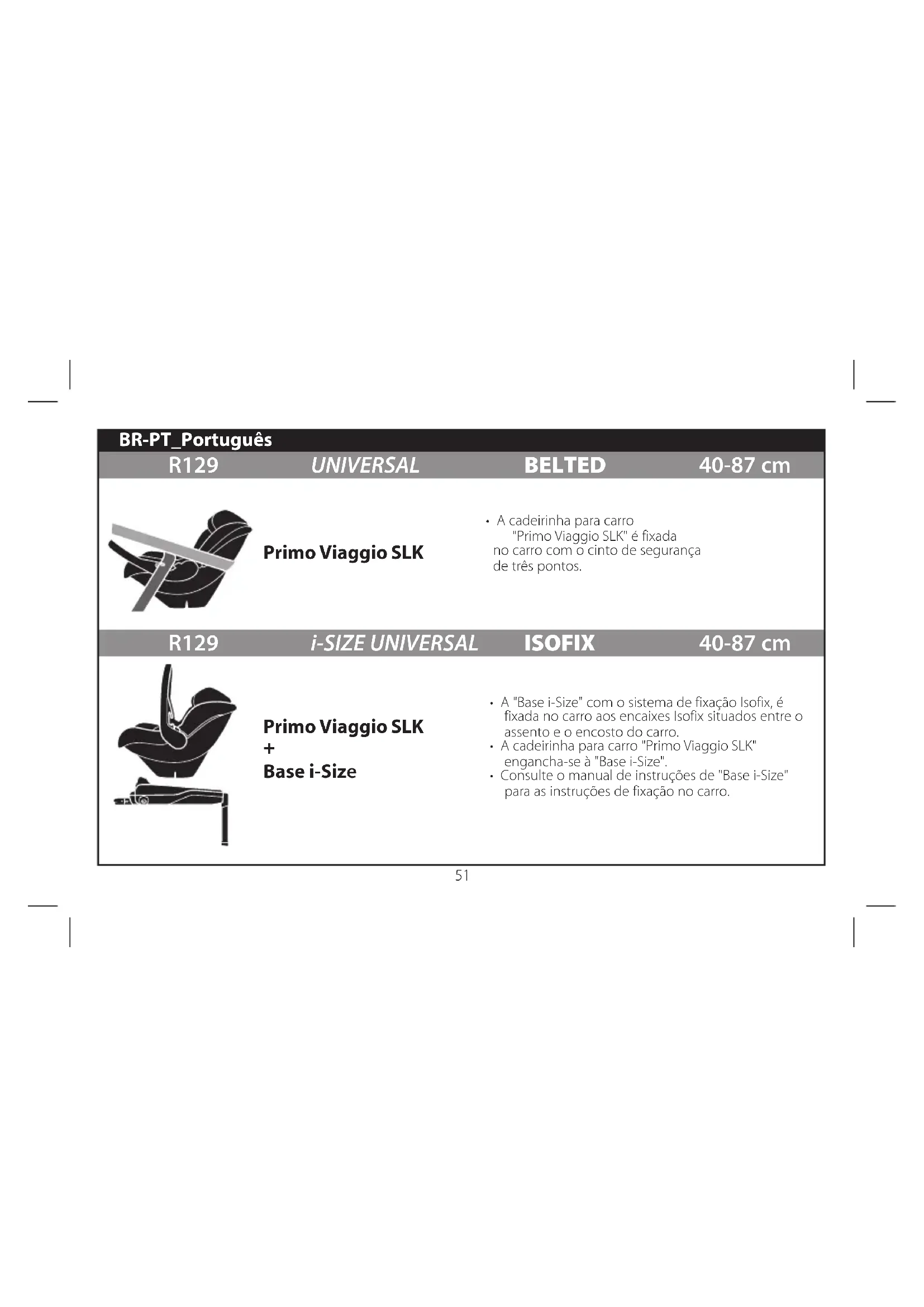 E-mail: info@burigotto.com.br - www.burigotto.com.br tel. 0039/039/60.88.213 e-mail: customer.service@pegperego.com sítio internet: www.pegperego.com Todos os direitos de propriedade intelectual relativos aos conteúdos deste manual de instruções pertencem à Peg Perego S.p.A. e estão protegidos pelas leis vigentes.59 R129 UNIVERSAL BELTED 40-87 cm R129 i-SIZE UNIVERSAL ISOFIX 40-87 cm Primo Viaggio SLK Primo Viaggio SLK