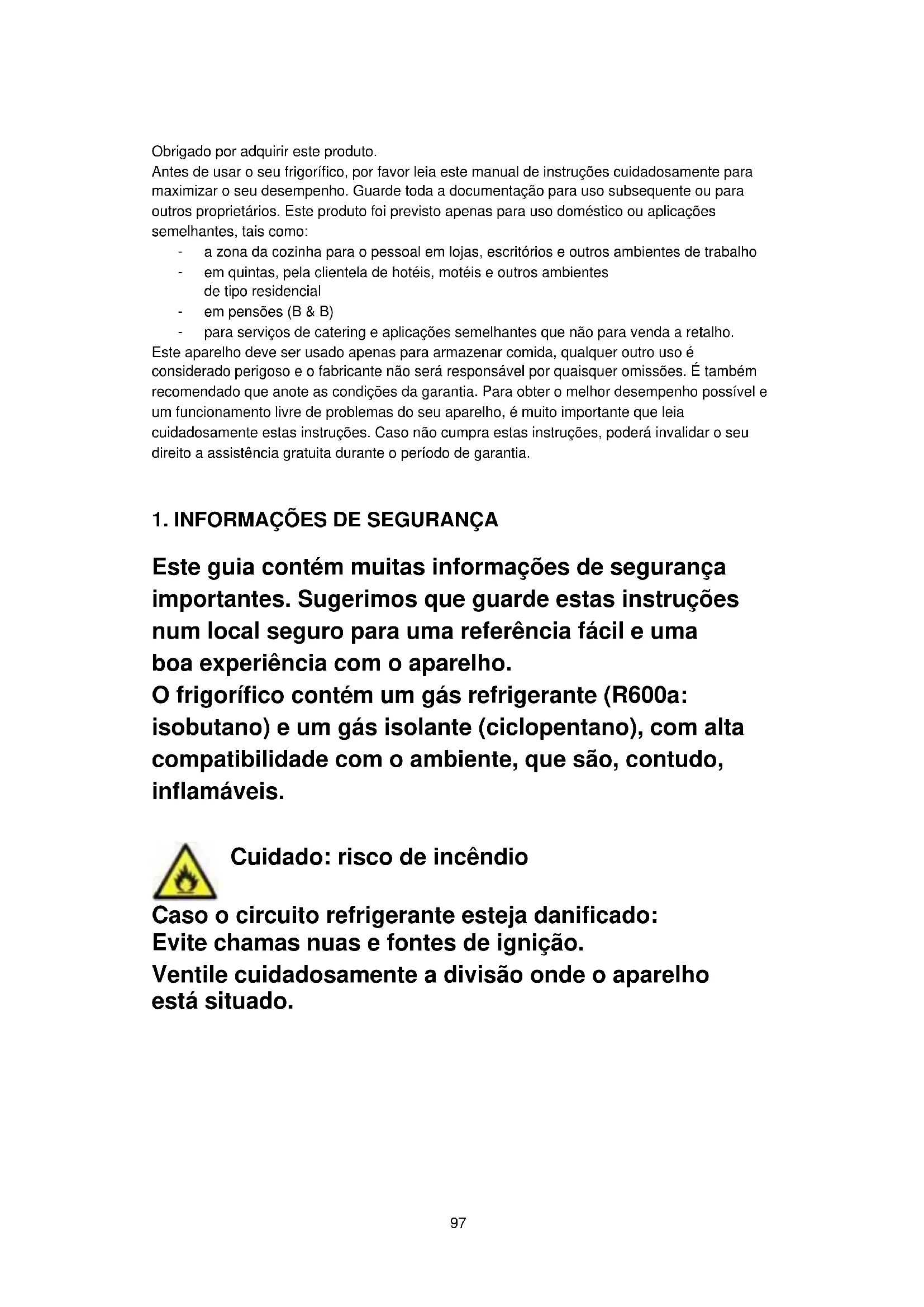 Obrigado por adquirir este produto. Antes de usar o seu frigorífico, por favor leia este manual de instruções cuidadosamente para maximizar o seu desempenho. Guarde toda a documentação para uso subsequente ou para outros proprietários. Este produto foi previsto apenas para uso doméstico ou aplicações semelhantes, tais como: