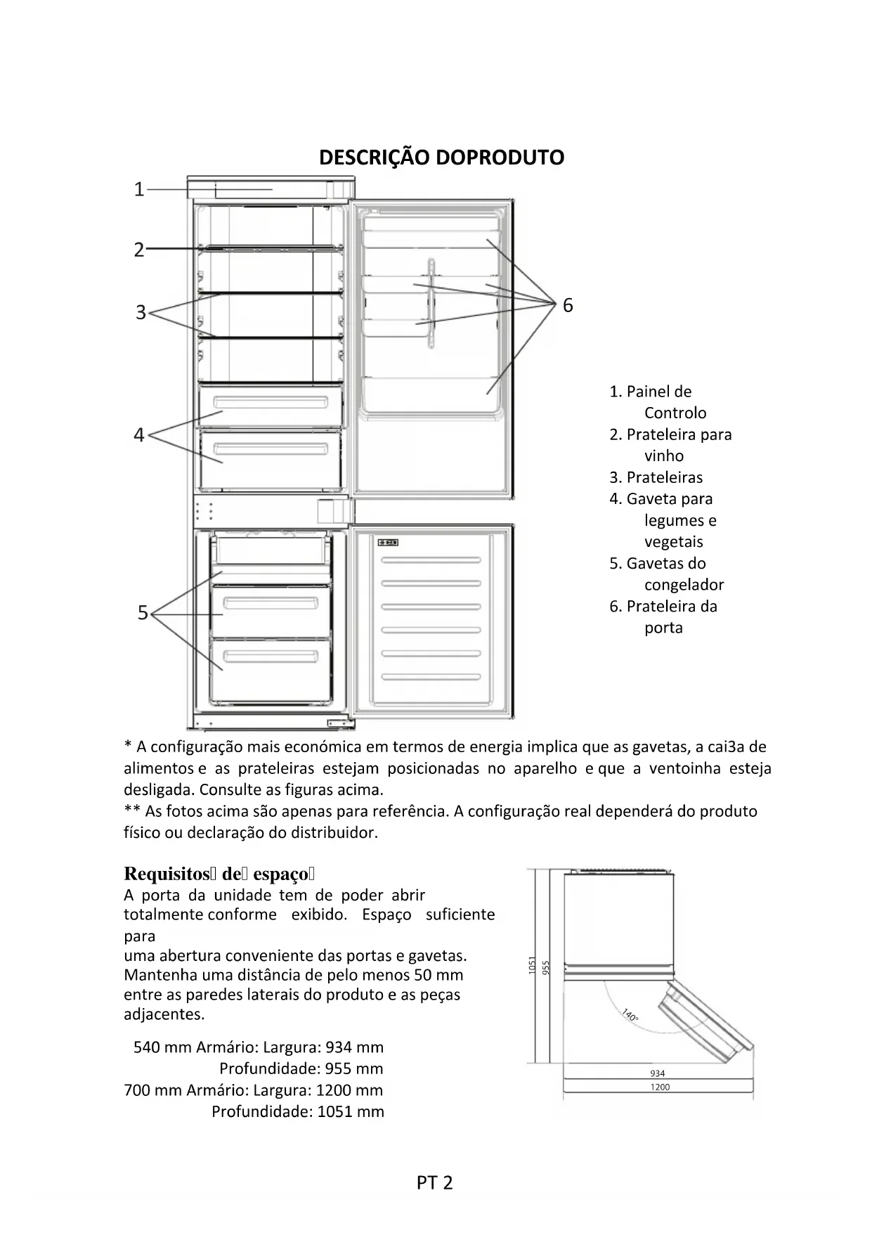 1. Painel deControlo2. Prateleira paravinho3. Prateleiras4. Gaveta paralegumes evegetais5. Gavetas docongelador6. Prateleira daporta* A configuração mais económica em termos de energia implica que as gavetas, a cai3a dealimentos e as prateleiras estejam posicionadas no aparelho e que a ventoinha estejadesligada. Consulte as figuras acima.** As fotos acima são apenas para referência. A configuração real dependerá do produtofísico ou declaração do distribuidor.Requisitos de espaço A porta da unidade tem de poder abrir totalmente conforme exibido. Espaço suficiente para uma abertura conveniente das portas e gavetas. Mantenha uma distância de pelo menos 50 mm entre as paredes laterais do produto e as peças adjacentes.540 mm Armário: Largura: 934 mmProfundidade: 955 mm700 mm Armário: Largura: 1200 mmProfundidade: 1051 mm