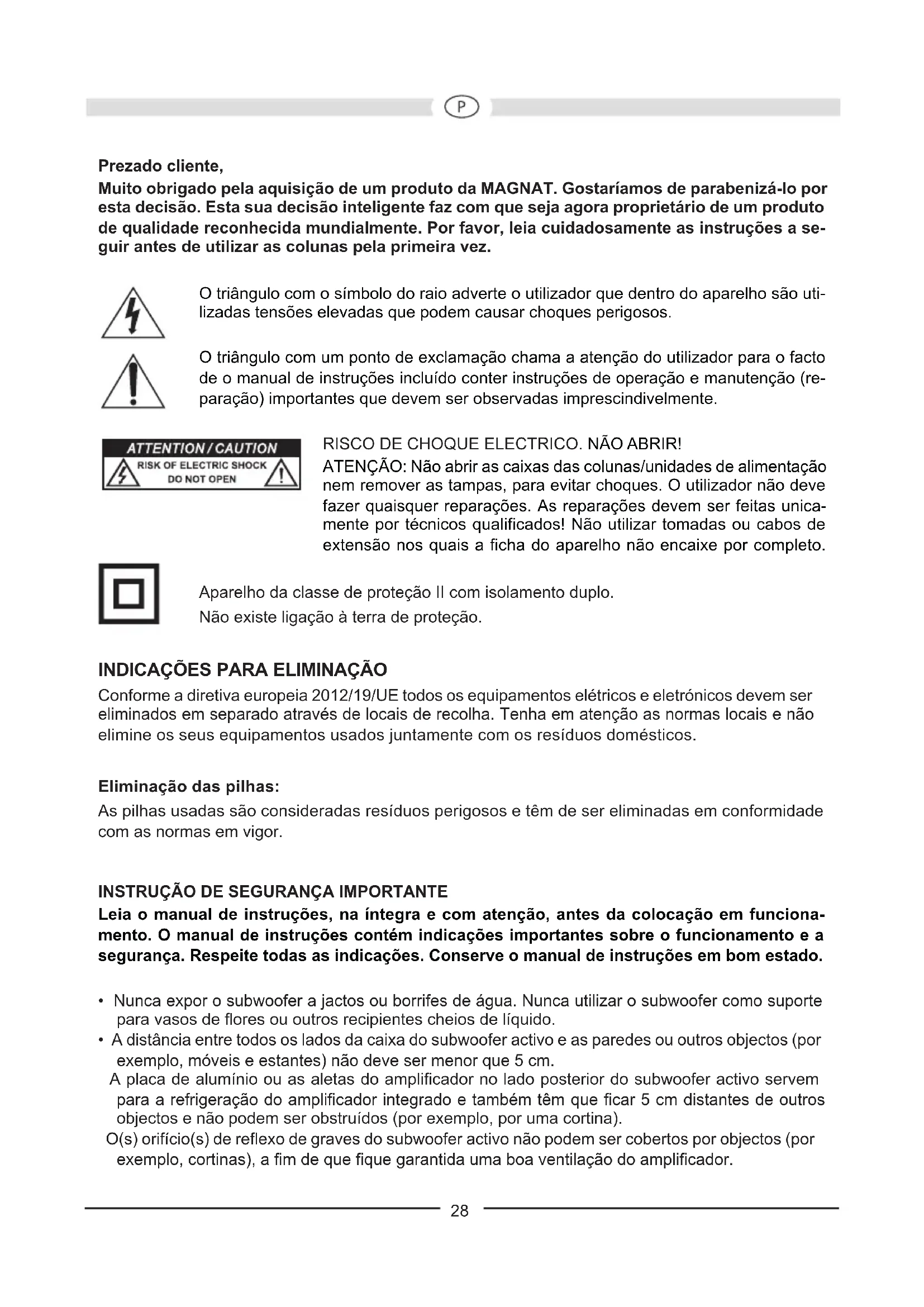 Omega CS 12 Conguración: Subwoofer activo cerrado, Front-Fire Componentes: 300 mm woofer Potencia de salida RMS/Máx.: 500 / 1150 vatios Gama de frecuencias: 18 – 200 Hz Frecuencia de separación: 50 – 150 Hz, regulable Dimensiones (an x al x pr): 385 x 400 x 465 mm Accesorios: Cable de la red Mando a distancia con batería incluída (2 x AAA) Reservados los derechos de realizar cambios técnicos.28 Prezado cliente, Muito obrigado pela aquisição de um produto da MAGNAT. Gostaríamos de parabenizá-lo por esta decisão. Esta sua decisão inteligente faz com que seja agora proprietário de um produto de qualidade reconhecida mundialmente. Por favor, leia cuidadosamente as instruções a se- guir antes de utilizar as colunas pela primeira vez. O triângulo com o símbolo do raio adverte o utilizador que dentro do aparelho são uti- lizadas tensões elevadas que podem causar choques perigosos. O triângulo com um ponto de exclamação chama a atenção do utilizador para o facto de o manual de instruções incluído conter instruções de operação e manutenção (re- paração) importantes que devem ser observadas imprescindivelmente. RISCO DE CHOQUE ELECTRICO. NÃO ABRIR! ATENÇÃO: Não abrir as caixas das colunas/unidades de alimentação nem remover as tampas, para evitar choques. O utilizador não deve fazer quaisquer reparações. As reparações devem ser feitas unica- mente por técnicos qualificados! Não utilizar tomadas ou cabos de extensão nos quais a ficha do aparelho não encaixe por completo. Aparelho da classe de proteção II com isolamento duplo. Não existe ligação à terra de proteção.