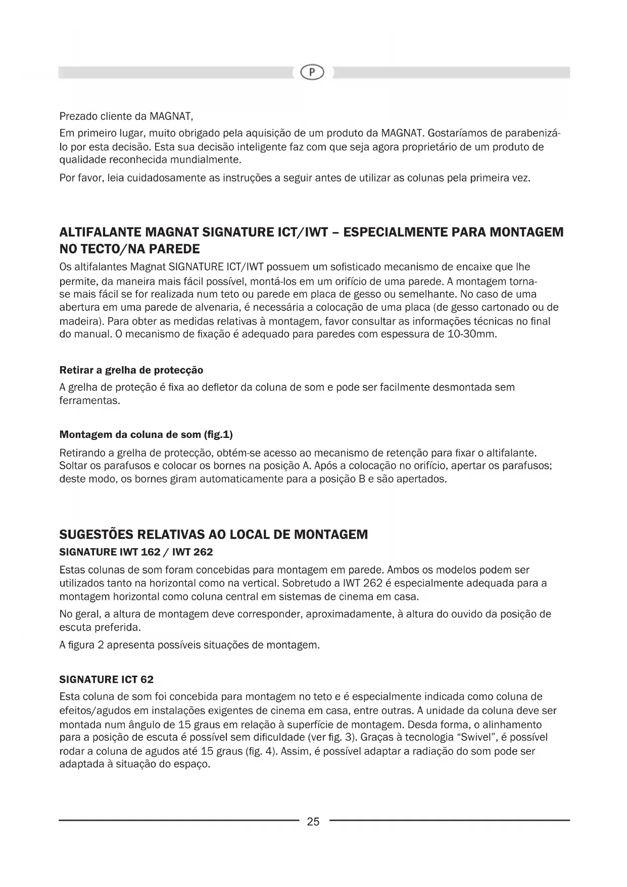 Estas colunas de som foram concebidas para montagem em parede. Ambos os modelos podem ser utilizados tanto na horizontal como na vertical. Sobretudo a IWT 262 é especialmente adequada para a montagem horizontal como coluna central em sistemas de cinema em casa. No geral, a altura de montagem deve corresponder, aproximadamente, à altura do ouvido da posição de escuta preferida. A gura 2 apresenta possíveis situações de montagem. SIGNATURE ICT 62 Esta coluna de som foi concebida para montagem no teto e é especialmente indicada como coluna de efeitos/agudos em instalações exigentes de cinema em casa, entre outras. A unidade da coluna deve ser montada num ângulo de 15 graus em relação à superfície de montagem. Desda forma, o alinhamento para a posição de escuta é possível sem diculdade (ver g. 3). Graças à tecnologia “Swivel”, é possível rodar a coluna de agudos até 15 graus (g. 4). Assim, é possível adaptar a radiação do som pode ser adaptada à situação do espaço.26 INFORMAÇÕES GERAIS SOBRE A LIGAÇÃO DAS SUAS COLUNAS MAGNAT Para a ligação das colunas é necessário um cabo especial, que pode ser adquirido numa loja especializada. A z de evitar perdas na qualidade do som, recomendamos para cabos de comprimento até 3 m uma secção transversal de pelo menos 1 mm². Para cabos mais compridos, pelo menos 1,5 mm². O amplicador e o receptor devem sempre permanecer desligados até que tenham sido estabelecidas todas as ligações. Para que se possa medir correctamente o comprimento do cabo, as colunas deveriam se encontrar na posição prevista. Deve-se usar para ambos os canais cabos com o mesmo comprimento. Decapar as extremidades dos cabos em um comprimento de 10 a 15 mm e torcê-las. As ligações para os altifalantes possuem um mecanismo de xação (g. 5). Premer o botão de xação e introduzir a extremidade decapada do o no orifício lateral. Quando o botão de xação é solto, o o é xado rmemente e ca assegurado o melhor contacto possível. Ao ligar os cabos, observar impreterivelmente a polaridade correcta, ou seja, os terminais pretos (-) das colunas devem ser ligados aos terminais (-) do amplicador e os terminais vermelhos (+) das colunas com os respectivos terminais (+) do amplicador. Para facilitar a ligação com a polaridade correcta, os cabos comuns para altifalantes têm um dos os marcados por uma estria ou por uma listra colorida. Vericar mais uma vez se os cabos estão rmemente xados e se não há curto-circuito formado por os expostos. Isto seria muito perigoso para o amplicador. REGULAÇÃO DO NÍVEL DE AGUDOS (FIG. 6) O crossover oferece uma adaptação personalizada da sonoridade do sistema de colunas de som através do comutador de alta qualidade situado na dianteira. A regulação deve ser feita de acordo com o gosto de cada um. Como denição básica para as várias salas de audição, recomendamos as seguintes posições de interruptor: Sala de audição Exemplo Posição do interruptor Instalação com pouco amortecimento de som Superfícies reectoras duras, ladrilhos, superfícies de vidro grandes, espaços com pouca mobília -3dB Instalação com amortecimento de som normal Carpetes, superfícies de vidro com cortinas, móveis em cabedal, espaços mobilados normalmente 0dB Instalação com muito amortecimento de som Alcatifas, móveis almofadados, cortinas pesadas, espaços com muita mobília +3dB LIGAÇÃO A UM AMPLIFICADOR ESTÉREO Na gura 7 está representada a ligação dos altifalantes em um amplicador stereo.
