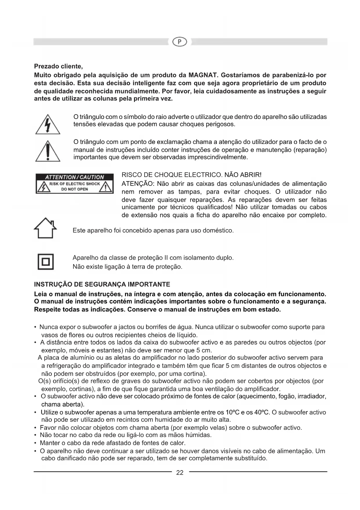 Configuración: Bassreflex subwoofer, ‘Frontfire’ Componentes: Unidad de largo recorrido de 30 cm Potencia de salida RMS/Máx.: 220 / 440 vatios Gama de frecuencias: 18 – 200 Hz Frecuencia de separación: 40 – 200 Hz regulable Dimensiones (an x al x pr): 400 x 570 x 510 mm Accesorios: Cable de la red RESERVADOS LOS DERECHOS DE REALIZAR CAMBIOS TÉCNICOS.22 Prezado cliente, Muito obrigado pela aquisição de um produto da MAGNAT. Gostaríamos de parabenizá-lo por esta decisão. Esta sua decisão inteligente faz com que seja agora proprietário de um produto de qualidade reconhecida mundialmente. Por favor, leia cuidadosamente as instruções a seguir antes de utilizar as colunas pela primeira vez. O triângulo com o símbolo do raio adverte o utilizador que dentro do aparelho são utilizadas tensões elevadas que podem causar choques perigosos. O triângulo com um ponto de exclamação chama a atenção do utilizador para o facto de o manual de instruções incluído conter instruções de operação e manutenção (reparação) importantes que devem ser observadas imprescindivelmente. RISCO DE CHOQUE ELECTRICO. NÃO ABRIR! ATENÇÃO: Não abrir as caixas das colunas/unidades de alimentação nem remover as tampas, para evitar choques. O utilizador não deve fazer quaisquer reparações. As reparações devem ser feitas unicamente por técnicos qualificados! Não utilizar tomadas ou cabos de extensão nos quais a ficha do aparelho não encaixe por completo. Este aparelho foi concebido apenas para uso doméstico. Aparelho da classe de proteção II com isolamento duplo. Não existe ligação à terra de proteção.