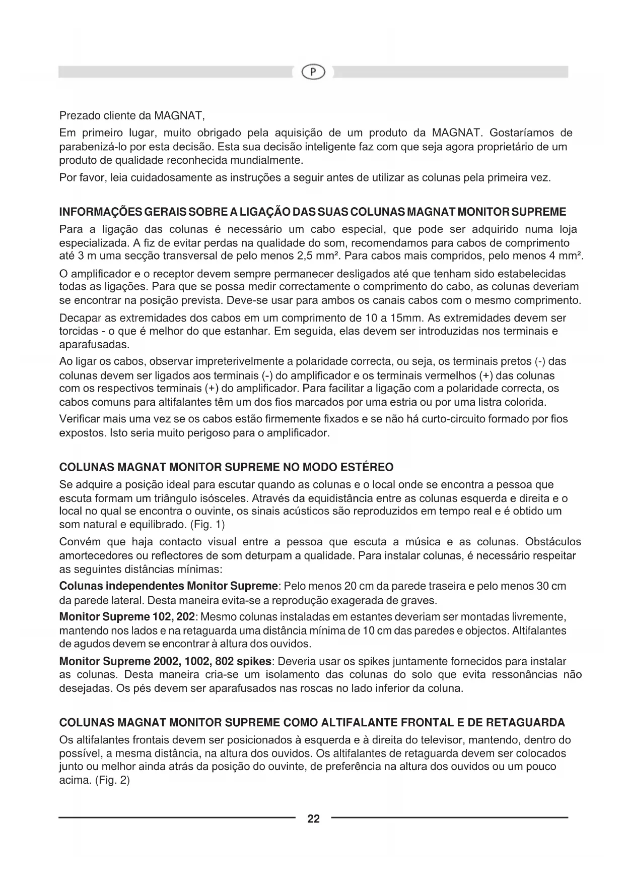 Monitor Supreme 2002 Monitor Supreme 1002 Conguración: Reejo bajo de 3 vías Reejo bajo de 3 vías Resistencia: 225 / 450 vatios 190 / 380 vatios Impedancia: 4 – 8 ohmios 4 – 8 ohmios Gama de frecuencias: 18 – 40 000 Hz 19 – 40 000 Hz Potencia recomendada del amplicador: 30 – 450 vatios 30 – 380 vatios Rendimiento (1 vatio/1 m): 93 dB 92 dB Dimensiones (an x al - pr): 267 x 1080 x 335 mm 215 x 950 x 313 mm Accesorios: Puntas de caucho endurecido Puntas de caucho endurecido Puntas de metal Puntas de metal Monitor Supreme 802 Monitor Supreme 202 Conguración: Reejo bajo de 2 ½ vías Reejo bajo de 2 vías Resistencia: 170 / 340 vatios 100 / 200 vatios Impedancia: 4 – 8 ohmios 4 – 8 ohmios Gama de frecuencias: 22 – 40 000 Hz 34 – 40 000 Hz Potencia recomendada del amplicador: 30 – 340 vatios 30 – 200 vatios Rendimiento (1 vatio/1 m): 92 dB 91 dB Dimensiones (an x al - pr): 215 x 850 x 273 mm 215 x 354 x 273 mm Accesorios: Puntas de caucho endurecido Puntas de caucho endurecido Puntas de metal Monitor Supreme 102 Monitor Supreme Center 252 Conguración: 2 vías 2 vías Resistencia: 60 / 120 vatios 75 / 150 vatios Impedancia: 4 – 8 ohmios 4 – 8 ohmios Gama de frecuencias: 42 – 36 000 Hz 40 – 34 000 Hz Potencia recomendada del amplicador: 20 – 110 vatios 20 – 150 vatios Rendimiento (1 vatio/1 m): 89 dB 90 dB Dimensiones (an x al - pr): 149 x 250 x 190 mm 420 x 145 x 190 mm Accesorios: Puntas de caucho endurecido Puntas de caucho endurecido RESERVADOS LOS DERECHOS DE REALIZAR CAMBIOS TÉCNICOS.22 Prezado cliente da MAGNAT, Em primeiro lugar, muito obrigado pela aquisição de um produto da MAGNAT. Gostaríamos de parabenizá-lo por esta decisão. Esta sua decisão inteligente faz com que seja agora proprietário de um produto de qualidade reconhecida mundialmente. Por favor, leia cuidadosamente as instruções a seguir antes de utilizar as colunas pela primeira vez. INFORMAÇÕES GERAIS SOBRE A LIGAÇÃO DAS SUAS COLUNAS MAGNAT MONITOR SUPREME Para a ligação das colunas é necessário um cabo especial, que pode ser adquirido numa loja especializada. A z de evitar perdas na qualidade do som, recomendamos para cabos de comprimento até 3 m uma secção transversal de pelo menos 2,5 mm². Para cabos mais compridos, pelo menos 4 mm². O amplicador e o receptor devem sempre permanecer desligados até que tenham sido estabelecidas todas as ligações. Para que se possa medir correctamente o comprimento do cabo, as colunas deveriam se encontrar na posição prevista. Deve-se usar para ambos os canais cabos com o mesmo comprimento. Decapar as extremidades dos cabos em um comprimento de 10 a 15mm. As extremidades devem ser torcidas - o que é melhor do que estanhar. Em seguida, elas devem ser introduzidas nos terminais e aparafusadas. Ao ligar os cabos, observar impreterivelmente a polaridade correcta, ou seja, os terminais pretos (-) das colunas devem ser ligados aos terminais (-) do amplicador e os terminais vermelhos (+) das colunas com os respectivos terminais (+) do amplicador. Para facilitar a ligação com a polaridade correcta, os cabos comuns para altifalantes têm um dos os marcados por uma estria ou por uma listra colorida. Vericar mais uma vez se os cabos estão rmemente xados e se não há curto-circuito formado por os expostos. Isto seria muito perigoso para o amplicador. COLUNAS MAGNAT MONITOR SUPREME NO MODO ESTÉREO Se adquire a posição ideal para escutar quando as colunas e o local onde se encontra a pessoa que escuta formam um triângulo isósceles. Através da equidistância entre as colunas esquerda e direita e o local no qual se encontra o ouvinte, os sinais acústicos são reproduzidos em tempo real e é obtido um som natural e equilibrado. (Fig. 1) Convém que haja contacto visual entre a pessoa que escuta a música e as colunas. Obstáculos amortecedores ou reectores de som deturpam a qualidade. Para instalar colunas, é necessário respeitar as seguintes distâncias mínimas: Colunas independentes Monitor Supreme: Pelo menos 20 cm da parede traseira e pelo menos 30 cm da parede lateral. Desta maneira evita-se a reprodução exagerada de graves. Monitor Supreme 102, 202: Mesmo colunas instaladas em estantes deveriam ser montadas livremente, mantendo nos lados e na retaguarda uma distância mínima de 10 cm das paredes e objectos. Altifalantes de agudos devem se encontrar à altura dos ouvidos. Monitor Supreme 2002, 1002, 802 spikes: Deveria usar os spikes juntamente fornecidos para instalar as colunas. Desta maneira cria-se um isolamento das colunas do solo que evita ressonâncias não desejadas. Os pés devem ser aparafusados nas roscas no lado inferior da coluna. COLUNAS MAGNAT MONITOR SUPREME COMO ALTIFALANTE FRONTAL E DE RETAGUARDA Os altifalantes frontais devem ser posicionados à esquerda e à direita do televisor, mantendo, dentro do possível, a mesma distância, na altura dos ouvidos. Os altifalantes de retaguarda devem ser colocados junto ou melhor ainda atrás da posição do ouvinte, de preferência na altura dos ouvidos ou um pouco acima. (Fig. 2)23 Monitor Supreme 102, 202: No setup do receptor AV, a frequência de transição dos canais frontal e de retaguarda deveriam ser, dentro do possível, ajustados em aproximadamente 80 Hz. Além disto, valem as recomendações do capítulo anterior.