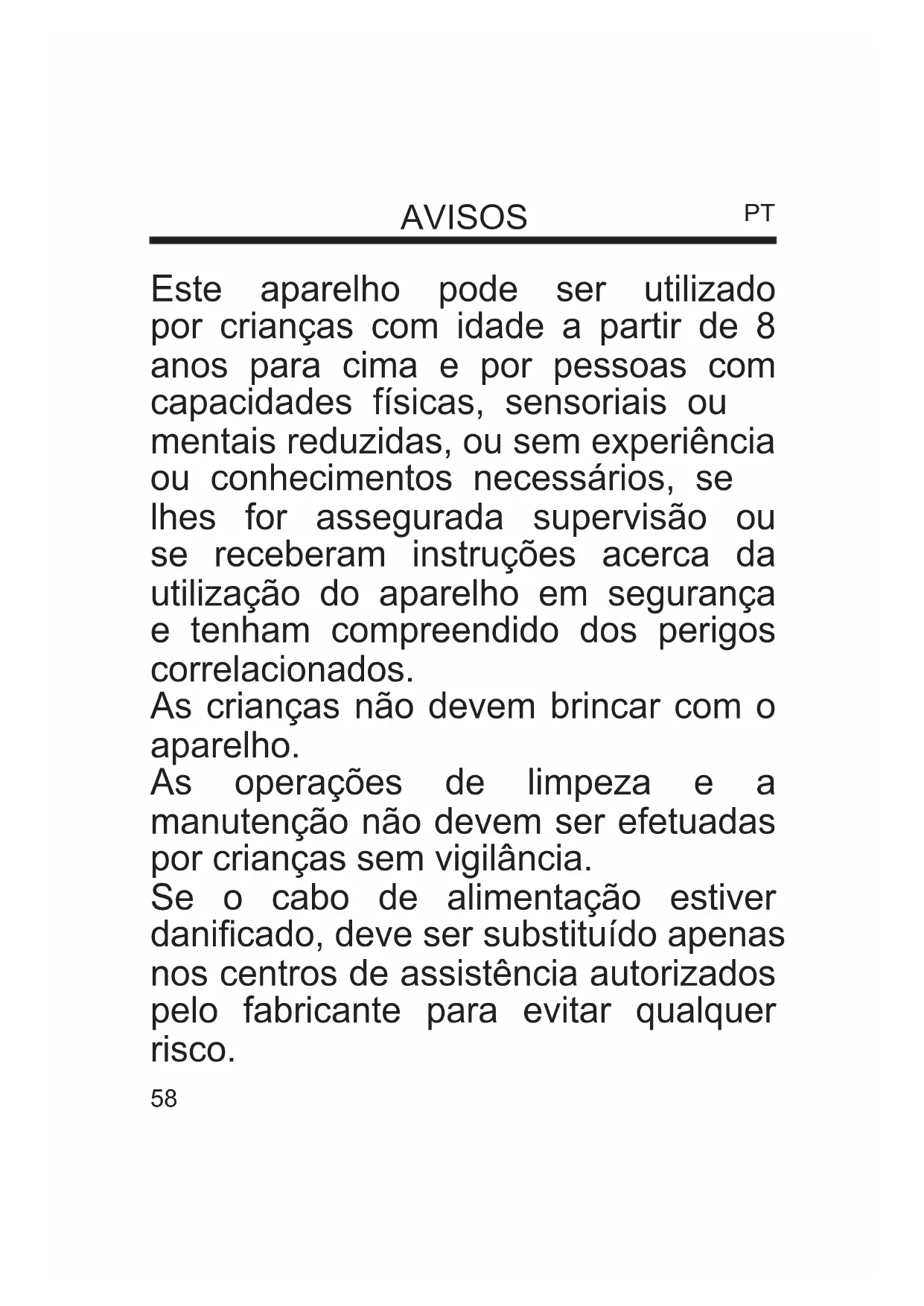 Este aparelho pode ser utilizado por crianças com idade a partir de 8 anos para cima e por pessoas com capacidades físicas, sensoriais ou mentais reduzidas, ou sem experiência ou conhecimentos necessários, se lhes for assegurada supervisão ou se receberam instruções acerca da utilização do aparelho em segurança e tenham compreendido dos perigos correlacionados. As crianças não devem brincar com o aparelho. As operações de limpeza e a manutenção não devem ser efetuadas por crianças sem vigilância. Se o cabo de alimentação estiver danicado, deve ser substituído apenas nos centros de assistência autorizados pelo fabricante para evitar qualquer risco.59 ATENÇÃO: leia este manual com atenção, pois contém instruções importantes para a segurança da instalação, utilização e manutenção. Instruções importantes a guardar para futuras consultas. As crianças não devem brincar com o dispositivo. Este aparelho deverá ser destinado apenas para o uso para o qual foi expressamente concebido; qualquer utilização em desacordo com as instruções contidas neste manual deve ser considerado impróprio e perigoso. O produtor não pode ser considerado responsável por eventuais danos resultantes de utilização imprópria e / ou irracional. Este aparelho NÃO é adequado para utilização em ambientes com atmosferas explosivas (com presença de substâncias inamáveis sob a forma de gás, vapor, névoa ou poeira, em condições atmosféricas nas quais, após a ignição, a combustão se propaga no ar). Os elementos da embalagem (sacos de plástico, poliestireno expandido etc.) não devem ser deixados ao alcance das crianças ou incapacitados, pois representam potenciais fontes de perigo. A instalação/montagem do dispositivo devem ser efetuadas segundo os requisitos do fabricante. Um procedimento incorreto pode causar danos a pessoas, animais ou coisas, pelos quais o fabricante não pode ser considerado responsável. Coloque e utilize o aparelho sobre uma superfície de apoio horizontal e estável. Antes de utilizar o aparelho, verique visualmente a integridade do mesmo e do seu cabo de alimentação. Em caso de dúvidas, entre em contacto com pessoal qualicado. Assegure-se de que a ventoinha está desligada da rede de alimentação elétrica antes de retirar as grelhas de proteção. Não ligue o aparelho à rede de alimentação elétrica e não o utilize se não estiver totalmente montado (veja as instruções de montagem).60 Antes de ligar o aparelho à eletricidade, certique-se de que os respetivos dados na placa (tensão e frequência) correspondem aos da rede de distribuição elétrica e que a tomada é adequada à cha do cabo com que o aparelho está equipado. Verique se o sistema elétrico utilizado para a alimentação está dotado das proteções adequadas em conformidade com as leis em vigor. NÃO ligue o aparelho por meio de tomadas múltiplas. Se possível, evite o uso de adaptadores e / ou extensões; se a sua utilização for imprescindível, utilize exclusivamente material que cumpra as normas de segurança em vigor e no respeito dos parâmetros elétricos dos adaptadores em questão. O aparelho não deve ser ligado por temporizadores externos e / ou outros dispositivos de controlo remoto não expressamente previstos neste manual. NÃO utilize ou guarde o dispositivo perto de fontes de calor localizadas (aquecedores, salamandras etc.). NÃO mergulhe o dispositivo em água ou noutros líquidos; em caso de queda acidental na água, NÃO tente recuperá-lo, mas antes de mais desligue imediatamente o cabo de alimentação da tomada elétrica. Ao utilizar o aparelho pela primeira vez, certique-se de ter retirado qualquer etiqueta ou folha de proteção que impeça o seu correto funcionamento. Ligue e desligue o cabo de alimentação com as mãos secas e segurando-o com rmeza. Antes de inserir a cha na tomada elétrica, certique-se de que o botão de arranque do aparelho está na posição "OFF” (desligado). Desenrole o cabo de alimentação sempre completamente para evitar sobreaquecimentos, em qualquer caso evite esticá-lo (não o puxe, sacuda, nem o utilize para arrastar o dispositivo ao qual está ligado). Evite colocar o cabo de alimentação sobre superfícies abrasivas ou cortantes ou em quaisquer outras posições onde possa ser facilmente danicado. NÃO obstrua as tomadas de ar total ou parcialmente, nem insira objetos no seu interior. Durante o funcionamento, não toque no dispositivo com partes do corpo molhadas ou húmidas, em qualquer caso aconselha-se a interpor um elemento isolante entre si e a superfície de apoio (por exemplo, calçar sapatos com sola de borracha). Durante a utilização, o aparelho deve ser mantido a uma distância segura de qualquer objeto e / ou substância inamável ou potencialmente explosiva. Em caso de funcionamento anómalo ou de anomalias durante o funcionamento, desligue imediatamente o aparelho, desligue-o da rede elétrica, verique as causas das anomalias encontradas, se necessário,61 com a ajuda de pessoal qualicado. Em qualquer caso, evite efetuar operações não previstas neste manual de utilização (como desmontá-lo e / ou modicá-lo). Lembre-se sempre de desligar o cabo de alimentação do dispositivo por períodos de inutilização prolongados, antes de o guardar e antes de realizar qualquer operação de limpeza ou manutenção. Conserve e utilize o dispositivo apenas em ambientes fechados ou em qualquer caso protegido de agentes atmosféricos como a chuva, luz solar direta ou poeira. O dispositivo não foi concebido para utilização ou permanência no exterior. A limpeza e a manutenção do dispositivo NÃO devem ser efetuadas por crianças sem a supervisão de um adulto. Antes de desconectar o aparelho, desligue-o usando o comando apropriado no painel de controlo. Quando se decidir não utilizar mais um aparelho deste tipo, é recomendável tornar inócuas aquelas partes do dispositivo que poss
