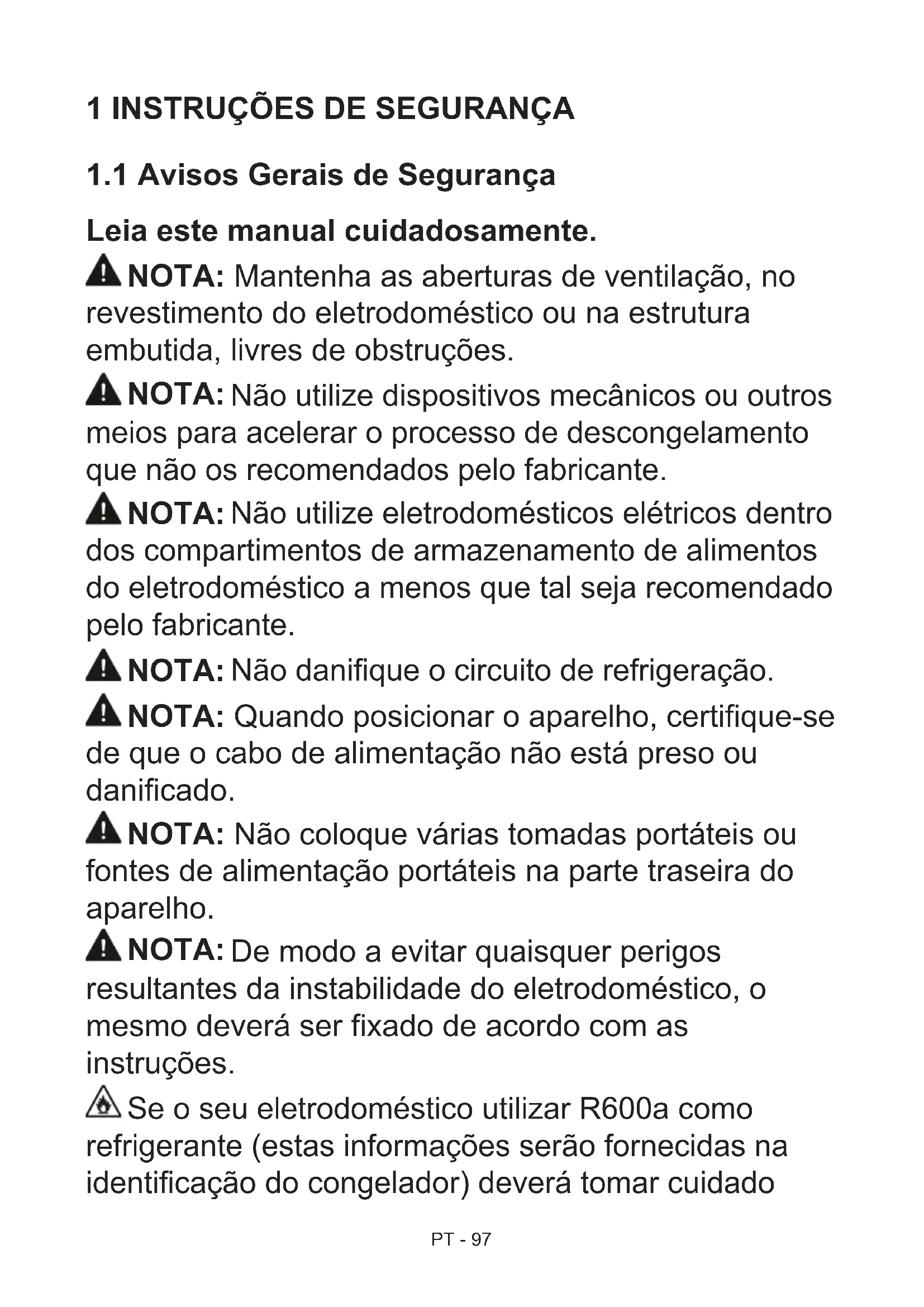 Leia este manual cuidadosamente. NOTA: Mantenha as aberturas de ventilação, no revestimento do eletrodoméstico ou na estrutura embutida, livres de obstruções. NOTA: Não utilize dispositivos mecânicos ou outros meios para acelerar o processo de descongelamento que não os recomendados pelo fabricante. NOTA: Não utilize eletrodomésticos elétricos dentro dos compartimentos de armazenamento de alimentos do eletrodoméstico a menos que tal seja recomendado pelo fabricante. NOTA: Não danique o circuito de refrigeração. NOTA: Quando posicionar o aparelho, certique-se de que o cabo de alimentação não está preso ou danicado. NOTA: Não coloque várias tomadas portáteis ou fontes de alimentação portáteis na parte traseira do aparelho. NOTA: De modo a evitar quaisquer perigos resultantes da instabilidade do eletrodoméstico, o mesmo deverá ser xado de acordo com as instruções. Se o seu eletrodoméstico utilizar R600a como refrigerante (estas informações serão fornecidas na identicação do congelador) deverá tomar cuidadoPT - 98 durante o transportee instalação para evitar que elementos do congelador quem danicados. O R600a é amigo do ambiente e um gás natural, no entanto, explosivo. Na eventualidade de uma fuga devido a danos dos elementos do congelador, afaste o seu frigoríco de chamas vivas ou fontes de calor e ventile, durante alguns minutos, a divisão onde se localiza o frigoríco.