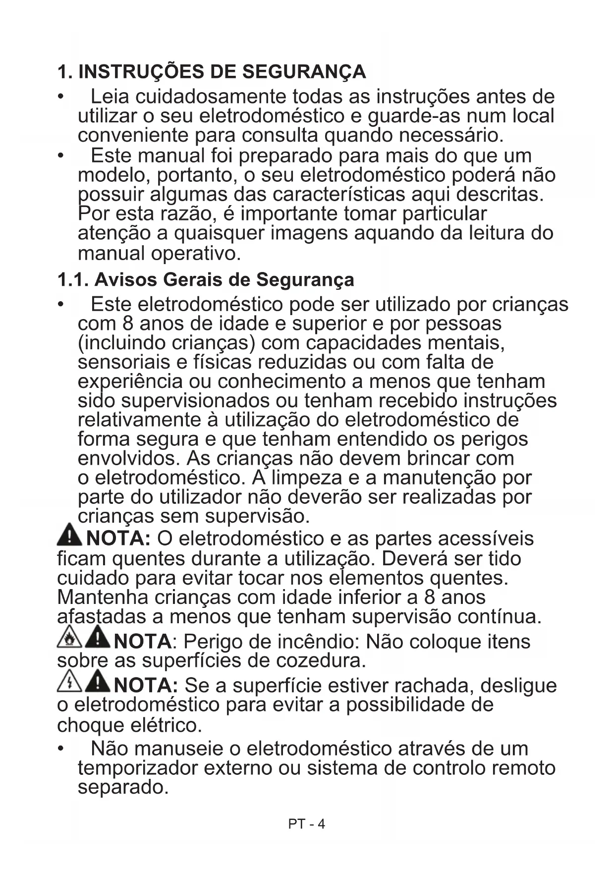 - Este eletrodoméstico pode ser utilizado por crianças com 8 anos de idade e superior e por pessoas (incluindo crianças) com capacidades mentais, sensoriais e físicas reduzidas ou com falta de experiência ou conhecimento a menos que tenham sido supervisionados ou tenham recebido instruções relativamente à utilização do eletrodoméstico de forma segura e que tenham entendido os perigos envolvidos. As crianças não devem brincar com o eletrodoméstico. A limpeza e a manutenção por parte do utilizador não deverão ser realizadas por crianças sem supervisão. NOTA: O eletrodoméstico e as partes acessíveis ficam quentes durante a utilização. Deverá ser tido cuidado para evitar tocar nos elementos quentes. Mantenha crianças com idade inferior a 8 anos afastadas a menos que tenham supervisão contínua. NOTA: Perigo de incêndio: Não coloque itens sobre as superfícies de cozedura. NOTA: Se a superfície estiver rachada, desligue o eletrodoméstico para evitar a possibilidade de choque elétrico.