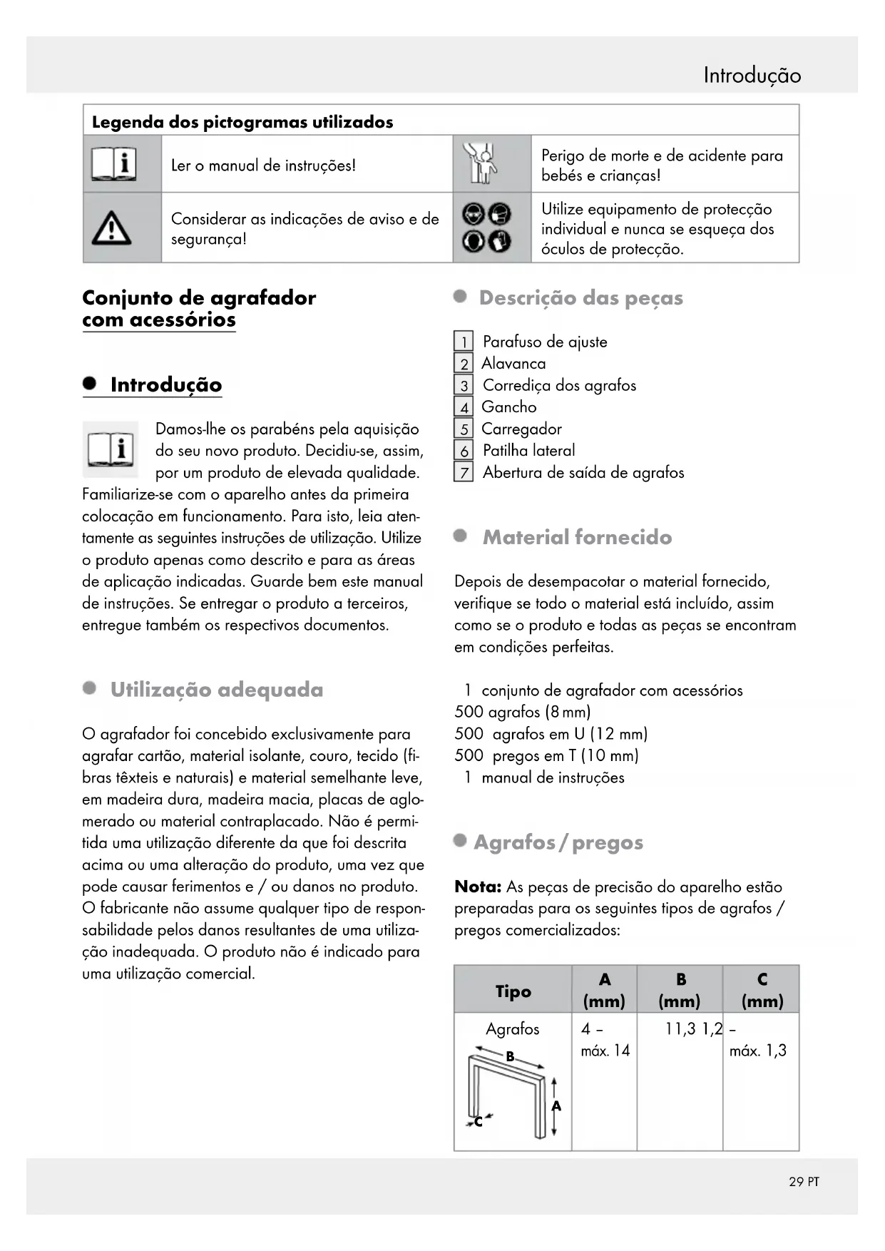 Abertura de saída de agrafos Material fornecido Depois de desempacotar o material fornecido, verifique se todo o material está incluído, assim como se o produto e todas as peças se encontram em condições perfeitas. 1 conjunto de agrafador com acessórios 500 agrafos (8 mm) 500 agrafos em U (12 mm) 500 pregos em T (10 mm) 1 manual de instruções Agrafos / pregos Nota: As peças de precisão do aparelho estão preparadas para os seguintes tipos de agrafos / pregos comercializados: Tipo