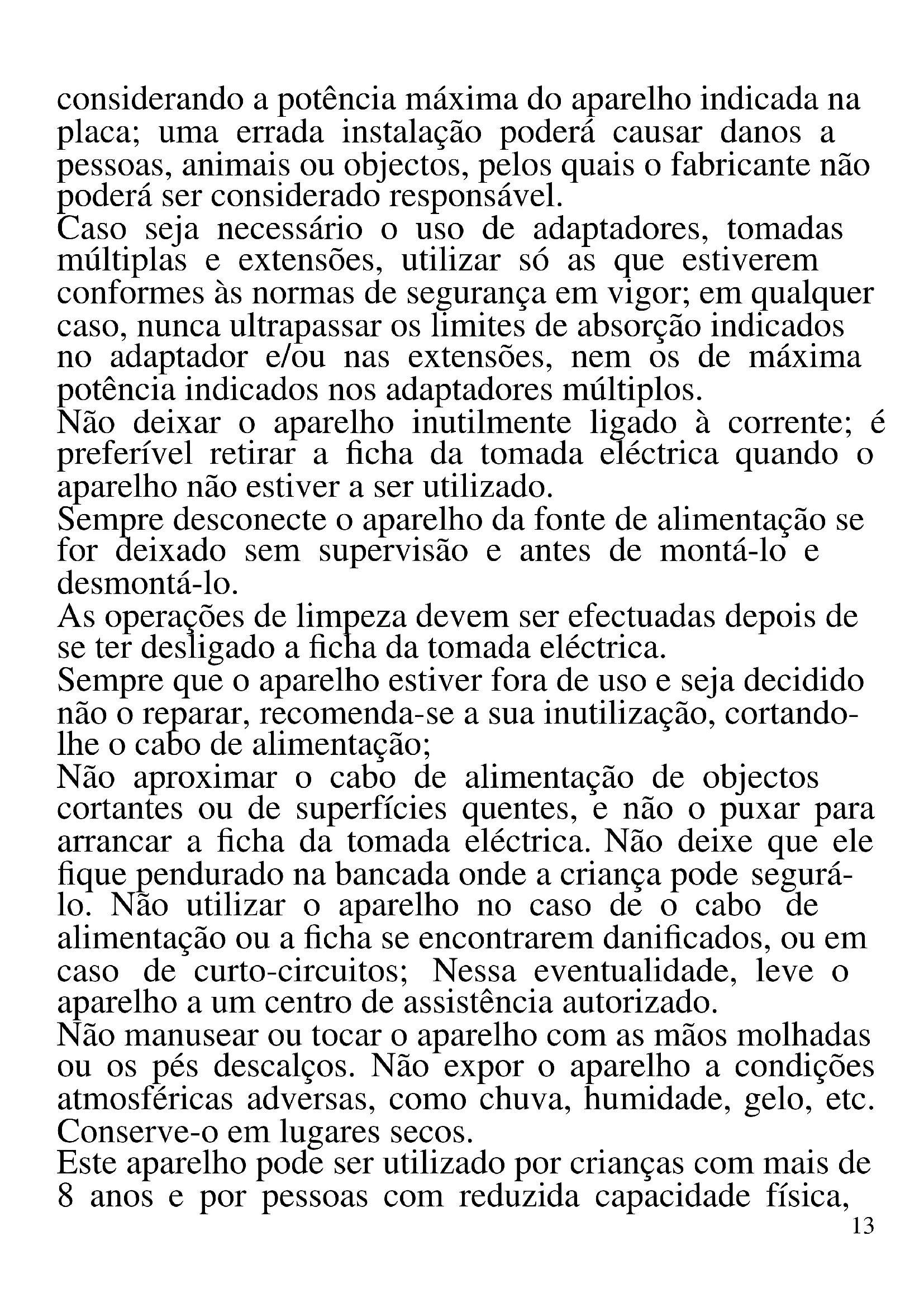 As indicações seguintes são muito importantes no que se refere à instalação, uso e manutenção deste aparelho; conserve com cuidado este manual para eventuais futuras consultas; utilize o aparelho apenas do modo indicado neste manual de instruções; outro tipo de utilização deverá considerar-se inadequado e perigoso; por isso, o fabricante não poderá ser considerado responsável na eventualidade de ocorrerem danos resultantes de uso indevido, errado ou irresponsável. Antes de utilizar, certifique-se da integridade do aparelho; em caso de dúvida não o utilize e dirija-se à assistência técnica autorizada; não deixe partes da embalagem (sacos de plástico, esferovite, pregos, agrafos, etc.) ao alcance das crianças, uma vez que constituem potenciais fontes de perigo; além disso, recordamos que essas partes devem ser objecto de recolha diferenciada de resíduos. Certifique-se de que os dados constantes da placa são compatíveis com os da rede eléctrica; a instalação deve ser efectuada de acordo com as instruções do fabricante,13 considerando a potência máxima do aparelho indicada na placa; uma errada instalação poderá causar danos a pessoas, animais ou objectos, pelos quais o fabricante não poderá ser considerado responsável. Caso seja necessário o uso de adaptadores, tomadas múltiplas e extensões, utilizar só as que estiverem conformes às normas de segurança em vigor; em qualquer caso, nunca ultrapassar os limites de absorção indicados no adaptador e/ou nas extensões, nem os de máxima potência indicados nos adaptadores múltiplos. Não deixar o aparelho inutilmente ligado à corrente; é preferível retirar a ficha da tomada eléctrica quando o aparelho não estiver a ser utilizado. Sempre desconecte o aparelho da fonte de alimentação se for deixado sem supervisão e antes de montá-lo e desmontá-lo. As operações de limpeza devem ser efectuadas depois de se ter desligado a ficha da tomada eléctrica. Sempre que o aparelho estiver fora de uso e seja decidido não o reparar, recomenda-se a sua inutilização, cortando- lhe o cabo de alimentação; Não aproximar o cabo de alimentação de objectos cortantes ou de superfícies quentes, e não o puxar para arrancar a ficha da tomada eléctrica. Não deixe que ele fique pendurado na bancada onde a criança pode segurá- lo. Não utilizar o aparelho no caso de o cabo de alimentação ou a ficha se encontrarem danificados, ou em caso de curto-circuitos; Nessa eventualidade, leve o aparelho a um centro de assistência autorizado. Não manusear ou tocar o aparelho com as mãos molhadas ou os pés descalços. Não expor o aparelho a condições atmosféricas adversas, como chuva, humidade, gelo, etc. Conserve-o em lugares secos. Este aparelho pode ser utilizado por crianças com mais de 8 anos e por pessoas com reduzida capacidade física,14 sensorial ou mental, ou ainda com falta de experiência na sua utilização, desde que lhes seja assegurada uma adequada supervisão ou se tiverem sido instruídas no uso do aparelho em segurança; as operações de limpeza e de manutenção não devem ser efectuadas por crianças, a menos que tenham mais de 8 anos e sejam supervisionadas. As crianças não devem brincar com o aparelho. Mantenha o aparelho e o cabo de alimentação fora do alcance de crianças com menos de 8 anos de idade. Não indicado para uso comercial. Só para uso doméstico. Em caso de avaria e/ou de mau funcionamento, não intervenha sobre o aparelho. Para uma eventual reparação dirija-se unicamente a um centro autorizado pelo fabricante e solicite peças de substituição originais. A não observância destas indicações pode comprometer a segurança do aparelho e tornar inválidos os termos da garantia. Este aparelho foi concebido para uso doméstico ou equivalente, em situações como as de refeitórios em pequenas empresas ou outros ambientes de natureza laboral; por clientes de hotéis, motéis ou acomodação turística, como turismo rural ou residencial. Este aparelho não foi concebido para ser utilizado por intermédio de um temporizador externo ou de um sistema de comando à distância autónomo. Antes de cada utilização, soltar o cabo de alimentação. Utilizar somente acessórios e componentes originais. Não sujeite produto a impactos, pois isso pode danificá-lo - Manter o aparelho afastado de materiais inflamáveis, fontes de calor, zonas frias e vapor.