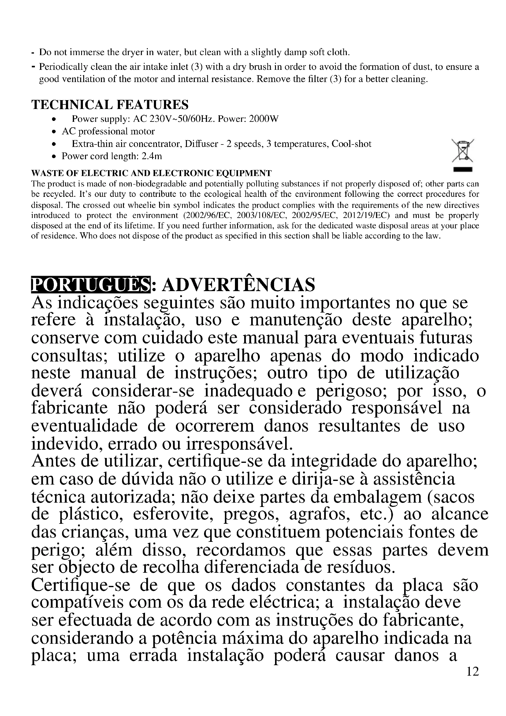 - 3 temperaturas, 2 velocidades, Ar frio RESÍDUOS DE APARELHIOS ELÉCTRICOS E ELÉCTRÓNICOS O aparelho é composto de algumas partes não biodegradáveis e de substâncias potencialmente tóxicas para o ambiente, se não forem correctamente eliminadas; outras partes podem ser recicladas. É dever de todos contribuir para a saúde ecológica do ambiente. Observando os correctos procedimentos de eliminação. O símbolo mostrado ao lado indica que o aparelho responde aos requisitos exigidos pelas novas directivas introduzidas pela tutela do ambiente (2002/96/EC, 2003/108/EC, 2002/95/EC, 2012/19/EC) e que deve ser eliminado correctamente no final do seu período de vida. Peça informações na câmara municipal da sua área de residência, se precisar de saber a localização dos centros de recolha deste tipo de resíduos. Quem não eliminar o aparelho do modo indicado neste parágrafo responde segundo as leis em vigor.17
