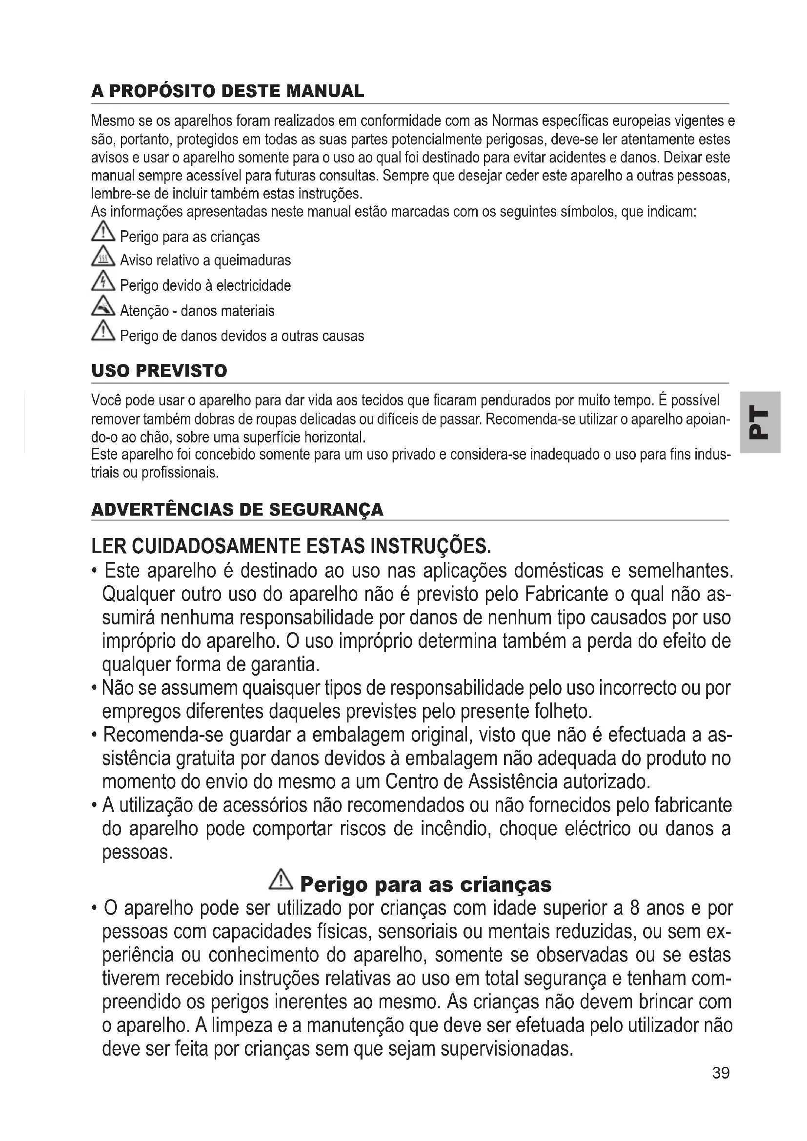 Mesmo se os aparelhos foram realizados em conformidade com as Normas especícas europeias vigentes e são, portanto, protegidos em todas as suas partes potencialmente perigosas, deve-se ler atentamente estes avisos e usar o aparelho somente para o uso ao qual foi destinado para evitar acidentes e danos. Deixar este manual sempre acessível para futuras consultas. Sempre que desejar ceder este aparelho a outras pessoas, lembre-se de incluir também estas instruções. As informações apresentadas neste manual estão marcadas com os seguintes símbolos, que indicam: Perigo para as crianças Aviso relativo a queimaduras Perigo devido à electricidade Atenção - danos materiais Perigo de danos devidos a outras causas USO PREVISTO Você pode usar o aparelho para dar vida aos tecidos que caram pendurados por muito tempo. É possível remover também dobras de roupas delicadas ou difíceis de passar. Recomenda-se utilizar o aparelho apoian- do-o ao chão, sobre uma superfície horizontal. Este aparelho foi concebido somente para um uso privado e considera-se inadequado o uso para ns indus- triais ou prossionais.