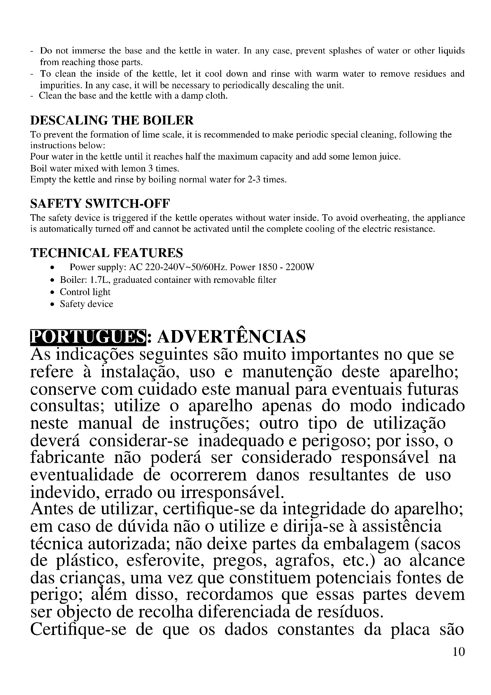 - Verter para a chaleira a quantidade de água desejada, dentro dos limites indicados (MAX: 1,7 litro, MIN: 0,5 l ). Fechar a tampa até bloquear. - Ligar a ficha à tomada eléctrica. - Encaixar a ligação da alimentação eléctrica da chaleira na respectiva base (4). - Carregar no botão (2) para ligar a chaleira.14 - Quando o líquido começa a ferver (cerca de 4 minutos para 1 litro de água) o termostato desliga automaticamente o aparelho. - Utilizar a água quente para o fim pretendido, tendo o cuidado de esvaziar completamente a chaleira para evitar incrustações calcárias na resistência interna. LIMPEZA Desligar a ficha da tomada eléctrica e deixar arrefecer todos os componentes do aparelho antes de executar qualquer operação de limpeza. - Não mergulhar a base ou a própria chaleira em água. Evitar sempre que salpicos de água ou de quaisquer outros líquidos atinjam o aparelho. - Para limpar o interior da chaleira, deve esperar-se que o mesmo arrefeça e enxaguá-lo com água tépida para remover resíduos e impurezas. Em todo o caso será sempre necessária uma limpeza periódica anti-calcário. - Para limpar a base e o exterior da chaleira, utilize um pano húmido.