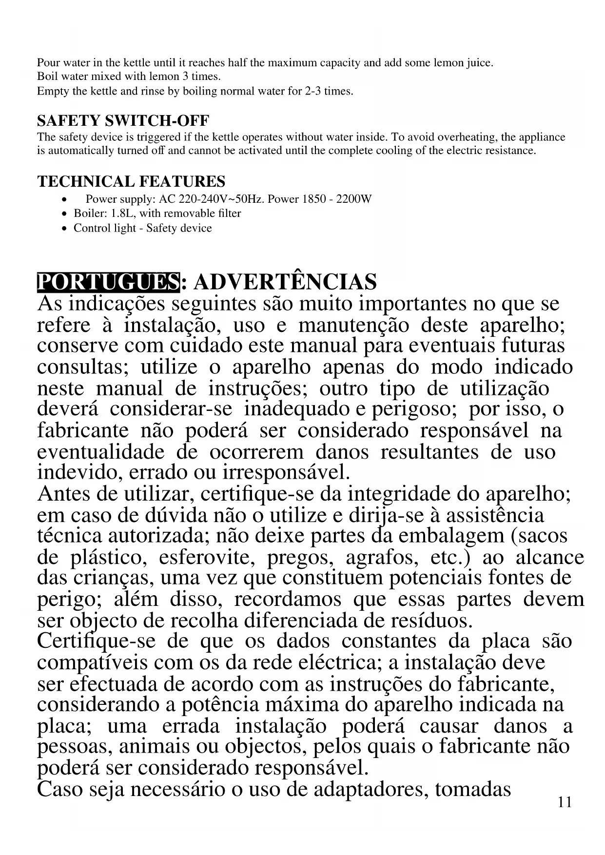 - Ferva a água conforme indicado no parágrafo "UTILIZAÇÃO DA CHALEIRA ELÉCTRICA". - Inserir o filtro (9) chá ou aromatizantes essências para sua fermentação. - Abra a tampa e monta o filtro para a parte inferior da tampa. Recoloque a tampa e deixe em infusão por quanto tempo for necessário. LIMPEZA Desligar a ficha da tomada eléctrica e deixar arrefecer todos os componentes do aparelho antes de executar qualquer operação de limpeza. - Não mergulhar a base ou a própria chaleira em água. Evitar sempre que salpicos de água ou de quaisquer outros líquidos atinjam o aparelho. - Para limpar o interior da chaleira, deve esperar-se que o mesmo arrefeça e enxaguá-lo com água tépida para remover resíduos e impurezas. Em todo o caso será sempre necessária uma limpeza periódica anti-calcário. - Para limpar a base e o exterior da chaleira, utilize um pano húmido.