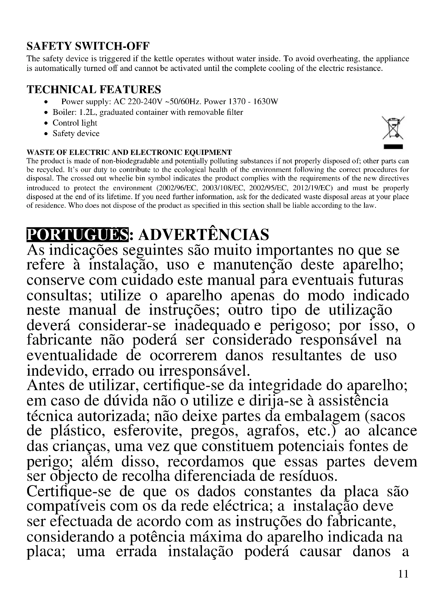 Alimentação: AC 220-240V ~50/60Hz, Potência 1370 - 1630W Chaleira: 1.2 litro, com indicador de nível de água e filtro removível Luz de controlo. Sistema de segurança para desligamento automático RESÍDUOS DE APARELHIOS ELÉCTRICOS E ELÉCTRÓNICOS O aparelho é composto de algumas partes não biodegradáveis e de substâncias potencialmente tóxicas para o ambiente, se não forem correctamente eliminadas; outras partes podem ser recicladas. É dever de todos contribuir para a saúde ecológica do ambiente. Observando os correctos procedimentos de eliminação. O símbolo mostrado ao lado indica que o aparelho responde aos requisitos exigidos pelas novas directivas introduzidas pela tutela do ambiente (2002/96/EC, 2003/108/EC, 2002/95/EC, 2012/19/EC) e que deve ser eliminado correctamente no final do seu período de vida. Peça informações na câmara municipal da sua área de residência, se precisar de saber a localização dos centros de recolha deste tipo de resíduos. Quem não eliminar o aparelho do modo indicado neste parágrafo responde segundo as leis em vigor.16