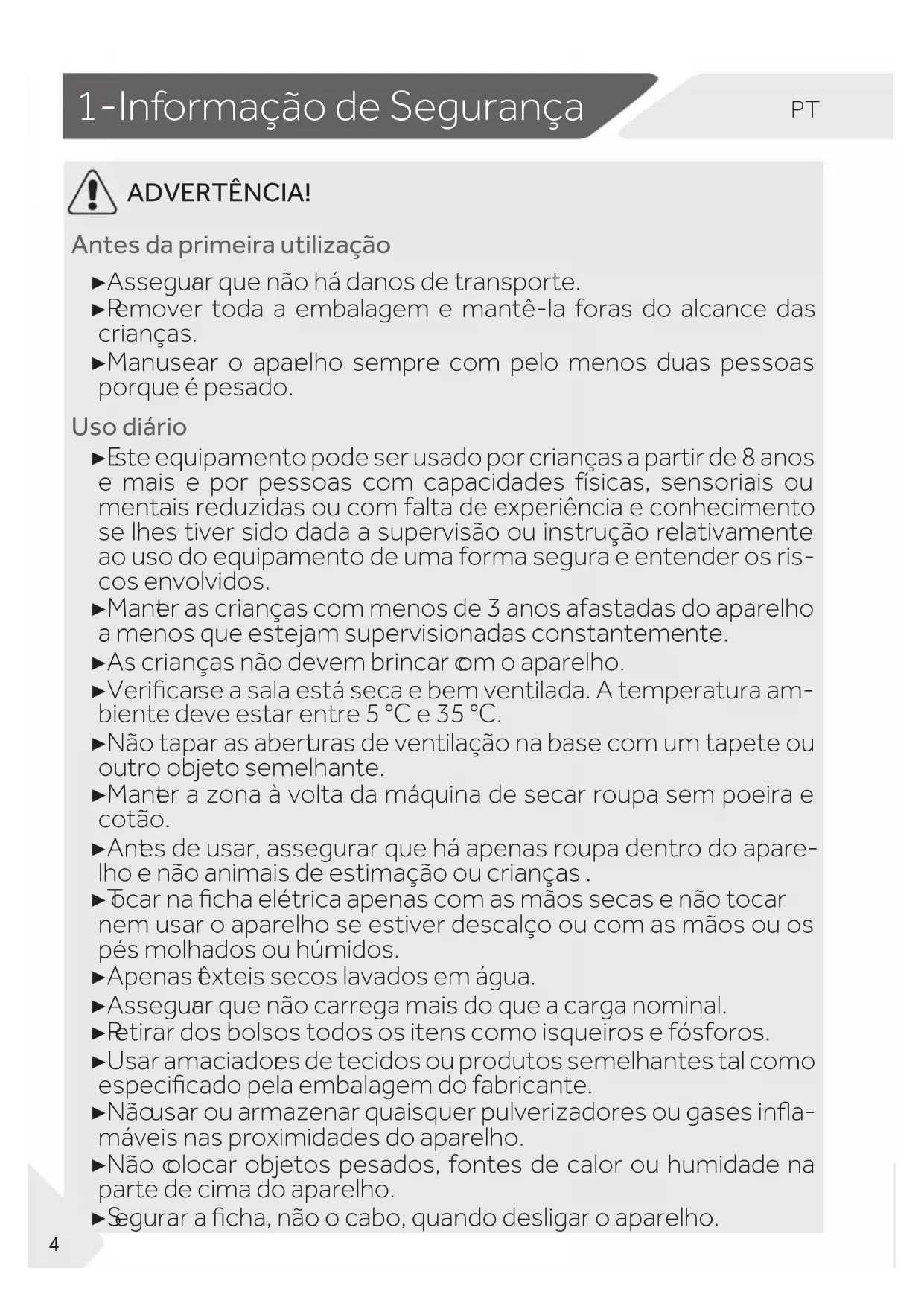 ADVERTÊNCIA! Antes da primeira utilização ▶ Assegur ar que não há danos de transporte. ▶ R emover toda a embalagem e mantê-la foras do alcance das crianças. ▶ Manusear o apar elho sempre com pelo menos duas pessoas porque é pesado. Uso diário ▶ E ste equipamento pode ser usado por crianças a partir de 8 anos e mais e por pessoas com capacidades físicas, sensoriais ou mentais reduzidas ou com falta de experiência e conhecimento se lhes tiver sido dada a supervisão ou instrução relativamente ao uso do equipamento de uma forma segura e entender os ris- cos envolvidos. ▶ Mant er as crianças com menos de 3 anos afastadas do aparelho a menos que estejam supervisionadas constantemente. ▶ As crianças não devem brincar c om o aparelho. ▶ Vericar se a sala está seca e bem ventilada. A temperatura am- biente deve estar entre 5 °C e 35 °C. ▶ Não tapar as abert uras de ventilação na base com um tapete ou outro objeto semelhante. ▶ Mant er a zona à volta da máquina de secar roupa sem poeira e cotão. ▶ Ant es de usar, assegurar que há apenas roupa dentro do apare- lho e não animais de estimação ou crianças . ▶ T ocar na cha elétrica apenas com as mãos secas e não tocar nem usar o aparelho se estiver descalço ou com as mãos ou os pés molhados ou húmidos. ▶ Apenas t êxteis secos lavados em água. ▶ Assegur ar que não carrega mais do que a carga nominal. ▶ R etirar dos bolsos todos os itens como isqueiros e fósforos. ▶ Usar amaciador es de tecidos ou produtos semelhantes tal como especicado pela embalagem do fabricante. ▶ Não usar ou armazenar quaisquer pulverizadores ou gases ina- máveis nas proximidades do aparelho. ▶ Não c olocar objetos pesados, fontes de calor ou humidade na parte de cima do aparelho. ▶ S egurar a cha, não o cabo, quando desligar o aparelho.PT 1-Inf ormação de Segurança