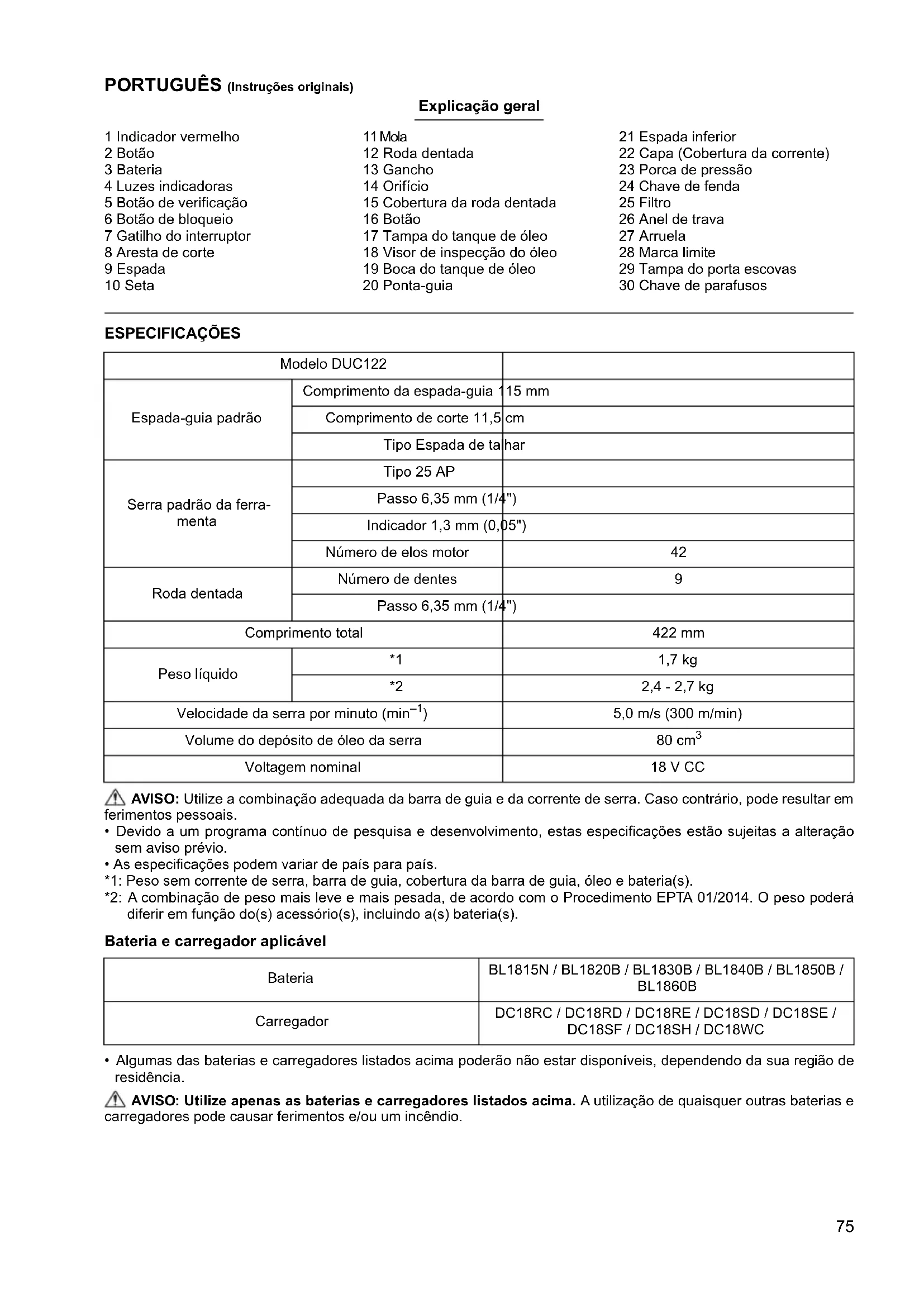 Para países europeos solamente Las declaraciones de conformidad están incluidas como Anexo A de este manual de instrucciones.75 PORTUGUÊS (Instruções originais) Explicação geral 1 Indicador vermelho 2 Botão 3 Bateria 4 Luzes indicadoras 5 Botão de verificação 6 Botão de bloqueio 7 Gatilho do interruptor 8 Aresta de corte 9 Espada 10 Seta 11 Mola 12 Roda dentada 13 Gancho 14 Orifício 15 Cobertura da roda dentada 16 Botão 17 Tampa do tanque de óleo 18 Visor de inspecção do óleo 19 Boca do tanque de óleo 20 Ponta-guia 21 Espada inferior 22 Capa (Cobertura da corrente) 23 Porca de pressão 24 Chave de fenda 25 Filtro 26 Anel de trava 27 Arruela 28 Marca limite 29 Tampa do porta escovas 30 Chave de parafusos ESPECIFICAÇÕES AVISO: Utilize a combinação adequada da barra de guia e da corrente de serra. Caso contrário, pode resultar em ferimentos pessoais.