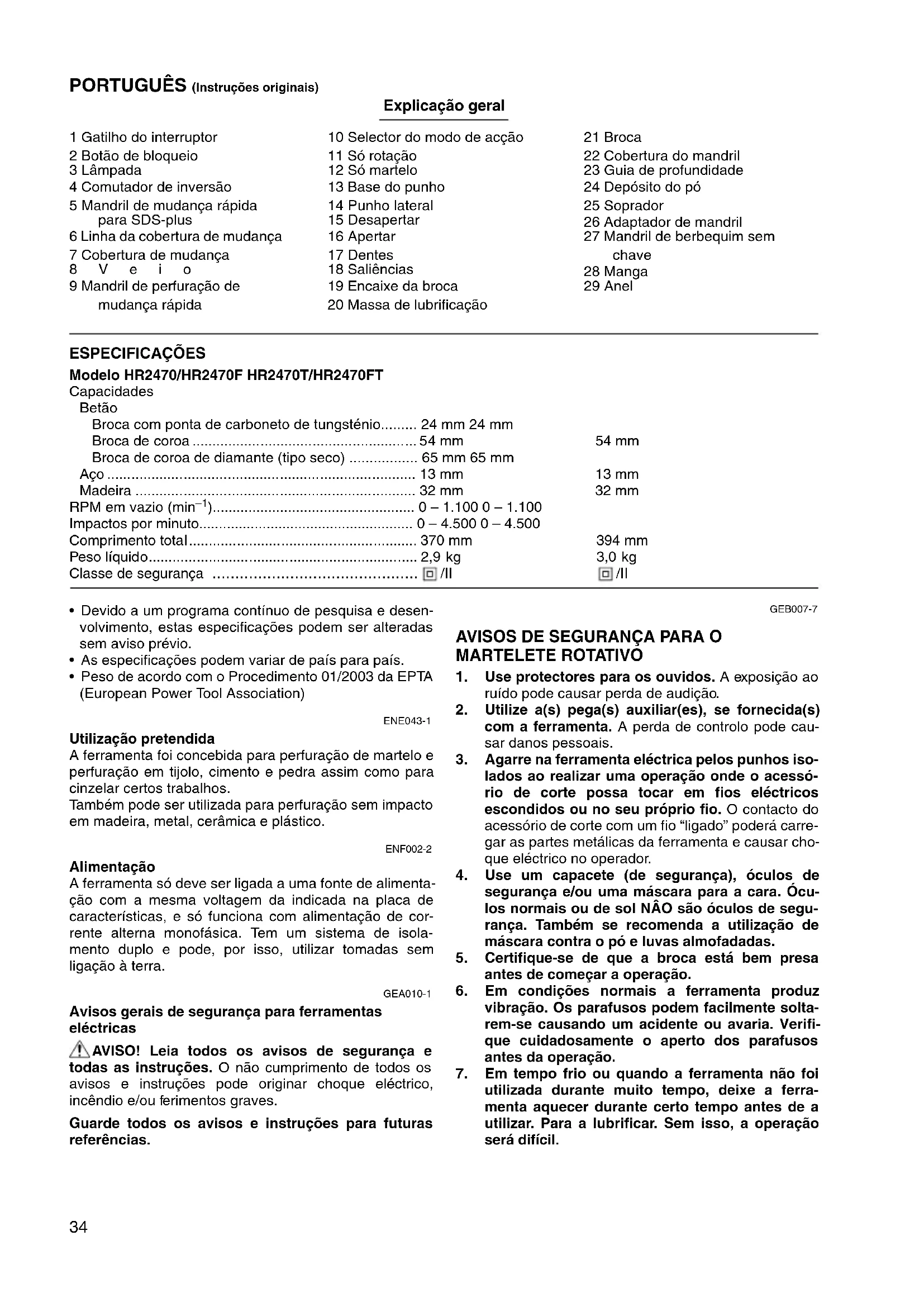 - Sólo para países europeos La declaración CE de conformidad está incluida como Anexo A de este manual de instrucciones.34 PORTUGUÊS (Instruções originais) Explicação geral 1 Gatilho do interruptor 2 Botão de bloqueio 3 Lâmpada 4 Comutador de inversão 5 Mandril de mudança rápida para SDS-plus 6 Linha da cobertura de mudança 7 Cobertura de mudança 8Veio 9 Mandril de perfuração de mudança rápida 10 Selector do modo de acção 11 Só rotação 12 Só martelo 13 Base do punho 14 Punho lateral 15 Desapertar 16 Apertar 17 Dentes 18 Saliências 19 Encaixe da broca 20 Massa de lubrificação 21 Broca 22 Cobertura do mandril 23 Guia de profundidade 24 Depósito do pó 25 Soprador 26 Adaptador de mandril 27 Mandril de berbequim sem chave 28 Manga 29 Anel ESPECIFICAÇÕES Modelo HR2470/HR2470F HR2470T/HR2470FT Capacidades Betão Broca com ponta de carboneto de tungsténio p. 24