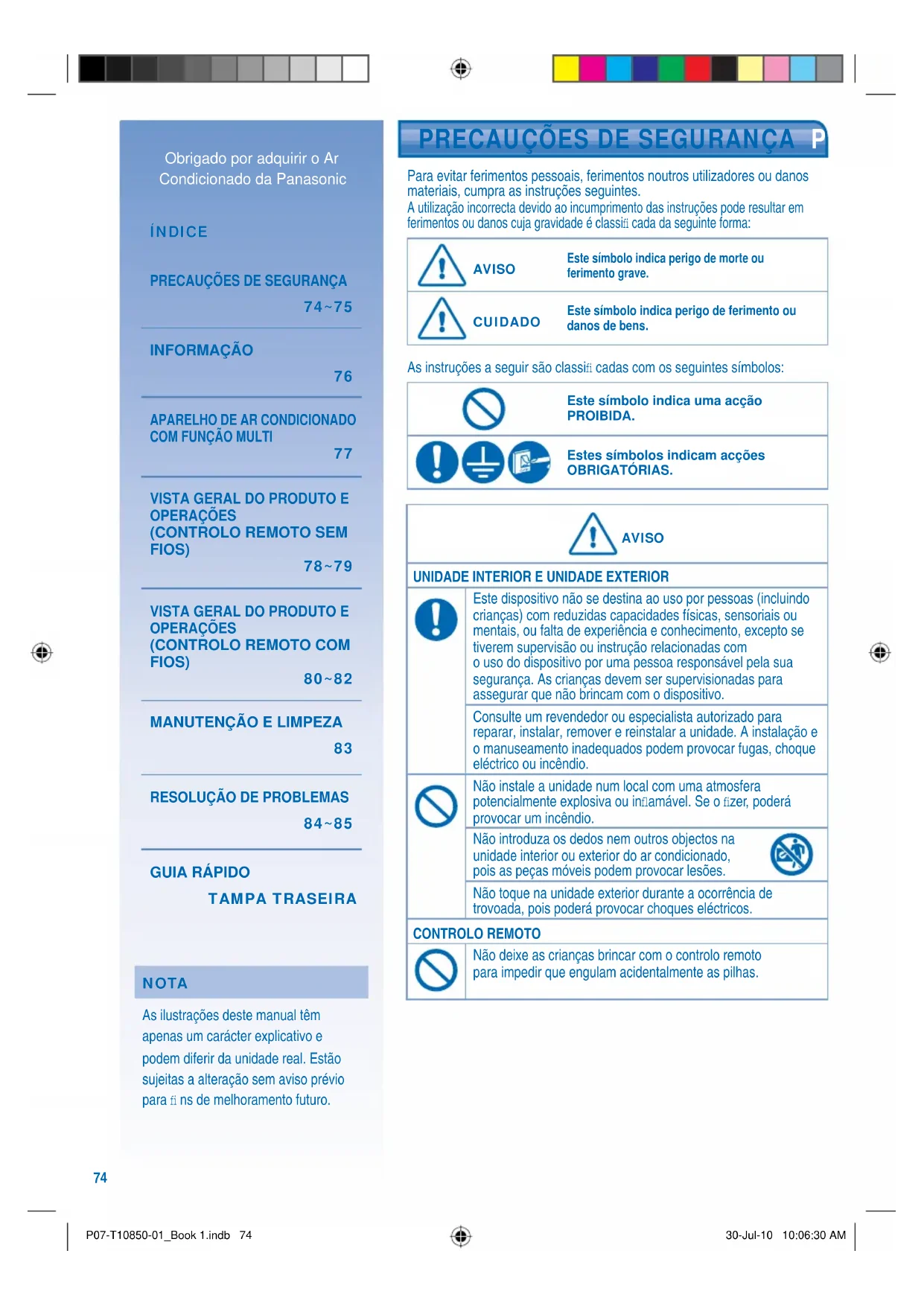 - Verwijder de batterijen uit de afstandsbediening. (draadloze afstandsbediening). P07-T10850-01_Book 1.indb 73P07-T10850-01_Book 1.indb 73 30-Jul-10 10:06:30 AM30-Jul-10 10:06:30 AM74 PRECAUÇÕES DE SEGURANÇA PRECAUÇÕES DE SEGURANÇA Para evitar ferimentos pessoais, ferimentos noutros utilizadores ou danos materiais, cumpra as instruções seguintes. A utilização incorrecta devido ao incumprimento das instruções pode resultar em ferimentos ou danos cuja gravidade é classifi cada da seguinte forma: AVISO AVISO Este símbolo indica perigo de morte ou ferimento grave. CUIDADO CUIDADO Este símbolo indica perigo de ferimento ou danos de bens. As instruções a seguir são classifi cadas com os seguintes símbolos: Este símbolo indica uma acção PROIBIDA. Estes símbolos indicam acções OBRIGATÓRIAS. Obrigado por adquirir o Ar Condicionado da Panasonic ÍNDICE ÍNDICE