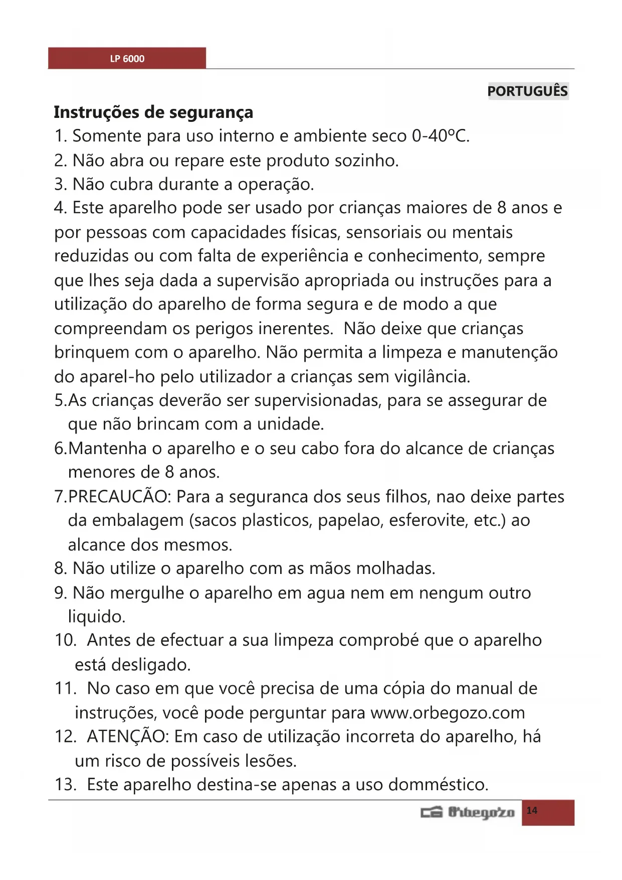 13. Este aparelho destina-se apenas a uso domméstico.LP 6000