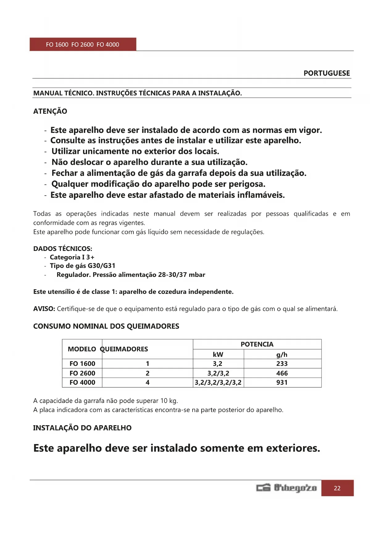 PORTUGUESE MANUAL TÉCNICO. INSTRUÇÕES TÉCNICAS PARA A INSTALAÇÃO. ATENÇÃO - Este aparelho deve ser instalado de acordo com as normas em vigor. - Consulte as instruções antes de instalar e utilizar este aparelho. - Utilizar unicamente no exterior dos locais. - Não deslocar o aparelho durante a sua utilização. - Fechar a alimentação de gás da garrafa depois da sua utilização. - Qualquer modificação do aparelho pode ser perigosa. - Este aparelho deve estar afastado de materiais inflamáveis. Todas as operações indicadas neste manual devem ser realizadas por pessoas qualificadas e em conformidade com as regras vigentes. Este aparelho pode funcionar com gás líquido sem necessidade de regulações. DADOS TÉCNICOS: - Categoria I 3+ - Tipo de gás G30/G31 - Regulador. Pressão alimentação 28-30/37 mbar Este utensílio é de classe 1: aparelho de cozedura independente. AVISO: Certifique-se de que o equipamento está regulado para o tipo de gás com o qual se alimentará.