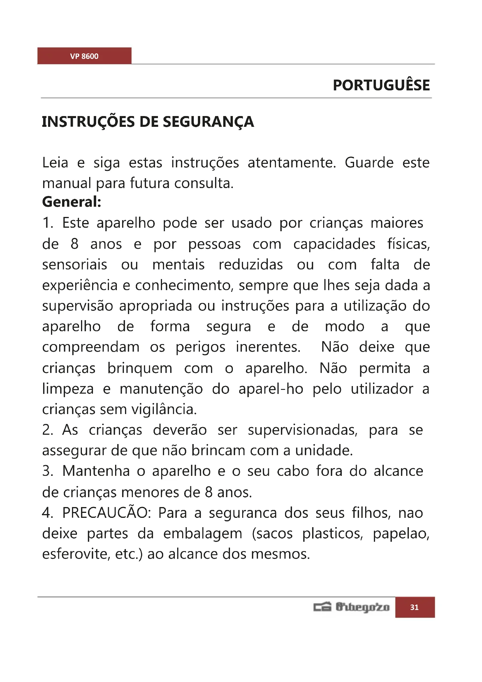 deixe partes da embalagem (sacos plasticos, papelao, esferovite, etc.) ao alcance dos mesmos.VP 8600