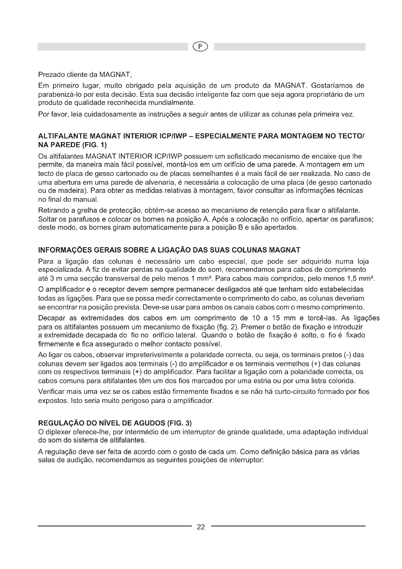 Interior ICP 262 Interior ICP 82 Resistencia: 70 / 120 Vatios 80 / 140 Vatios Impedancia: 2 x 8 Ohmios 8 Ohmios Frecuencia de separación: 4 000 Hz 4 000 Hz Gama de frecuencias: 36 – 24 000 Hz 34– 24 000 Hz Potencia recomendada del amplicador: 20 – 140 Vatios 20 – 160 Vatios Rendimiento (1 vatio/1 m): 90 dB 91 dB Dimensiones exteriores Ø: 233 mm 275 mm Oricio Ø: 198 mm 240 mm Profundidad de montaje: 88 mm 102 mm Interior ICP 62 Interior ICP 52 Resistencia: 70 / 120 Vatios 60 / 100 Vatios Impedancia: 8 Ohmios 8 Ohmios Frecuencia de separación: 4 000 Hz 4 000 Hz Gama de frecuencias: 36 – 24 000 Hz 38 – 24 000 Hz Potencia recomendada del amplicador: 20 – 140 Vatios 20 – 120 Vatios Rendimiento (1 vatio/1 m): 90 dB 89 dB Dimensiones exteriores Ø: 233 mm 202 mm Oricio Ø: 198 mm 168 mm Profundidad de montaje: 88 mm 81 mm Interior IWP 82 Interior IWP 62 Resistencia: 80 / 140 Vatios 70 / 120 Vatios Impedancia: 8 Ohmios 8 Ohmios Frecuencia de separación: 3 800 Hz 3 800 Hz Gama de frecuencias: 34 – 26 000 Hz 36 – 26 000 Hz Potencia recomendada del amplicador: 20 – 160 Vatios 20 – 140 Vatios Rendimiento (1 vatio/1 m): 91 dB 90 dB Dimensiones exteriores (ancho x alt.): 254 x 359 mm 218 x 305 mm Oricio (ancho x alt.): 218 x 321 mm 185 x 272 mm Profundidad de montaje: 88 mm 67 mm RESERVADOS LOS DERECHOS DE REALIZAR CAMBIOS TÉCNICOS. 21Prezado cliente da MAGNAT, Em primeiro lugar, muito obrigado pela aquisição de um produto da MAGNAT. Gostaríamos de parabenizá-lo por esta decisão. Esta sua decisão inteligente faz com que seja agora proprietário de um produto de qualidade reconhecida mundialmente. Por favor, leia cuidadosamente as instruções a seguir antes de utilizar as colunas pela primeira vez. ALTIFALANTE MAGNAT INTERIOR ICP/IWP – ESPECIALMENTE PARA MONTAGEM NO TECTO/ NA PAREDE (FIG. 1) Os altifalantes MAGNAT INTERIOR ICP/IWP possuem um sosticado mecanismo de encaixe que lhe permite, da maneira mais fácil possível, montá-los em um orifício de uma parede. A montagem em um tecto de placa de gesso cartonado ou de placas semelhantes é a mais fácil de ser realizada. No caso de uma abertura em uma parede de alvenaria, é necessária a colocação de uma placa (de gesso cartonado ou de madeira). Para obter as medidas relativas à montagem, favor consultar as informações técnicas no nal do manual. Retirando a grelha de protecção, obtém-se acesso ao mecanismo de retenção para xar o altifalante. Soltar os parafusos e colocar os bornes na posição A. Após a colocação no orifício, apertar os parafusos; deste modo, os bornes giram automaticamente para a posição B e são apertados. INFORMAÇÕES GERAIS SOBRE A LIGAÇÃO DAS SUAS COLUNAS MAGNAT Para a ligação das colunas é necessário um cabo especial, que pode ser adquirido numa loja especializada. A z de evitar perdas na qualidade do som, recomendamos para cabos de comprimento até 3 m uma secção transversal de pelo menos 1 mm². Para cabos mais compridos, pelo menos 1,5 mm². O amplicador e o receptor devem sempre permanecer desligados até que tenham sido estabelecidas todas as ligações. Para que se possa medir correctamente o comprimento do cabo, as colunas deveriam se encontrar na posição prevista. Deve-se usar para ambos os canais cabos com o mesmo comprimento. Decapar as extremidades dos cabos em um comprimento de 10 a 15 mm e torcê-las. As ligações para os altifalantes possuem um mecanismo de xação (g. 2). Premer o botão de xação e introduzir a extremidade decapada do o no orifício lateral. Quando o botão de xação é solto, o o é xado rmemente e ca assegurado o melhor contacto possível. Ao ligar os cabos, observar impreterivelmente a polaridade correcta, ou seja, os terminais pretos (-) das colunas devem ser ligados aos terminais (-) do amplicador e os terminais vermelhos (+) das colunas com os respectivos terminais (+) do amplicador. Para facilitar a ligação com a polaridade correcta, os cabos comuns para altifalantes têm um dos os marcados por uma estria ou por uma listra colorida. Vericar mais uma vez se os cabos estão rmemente xados e se não há curto-circuito formado por os expostos. Isto seria muito perigoso para o amplicador. REGULAÇÃO DO NÍVEL DE AGUDOS (FIG. 3) O diplexer oferece-lhe, por intermédio de um interruptor de grande qualidade, uma adaptação individual do som do sistema de altifalantes. A regulação deve ser feita de acordo com o gosto de cada um. Como denição básica para as várias salas de audição, recomendamos as seguintes posições de interruptor: 22Sala de audição Exemplo Posição do interruptor Instalação com pouco amortecimento de som Salas húmidas, superfícies reectoras duras, ladrilhos, superfícies de vidro grandes, espaços com pouca mobília -2dB Instalação com amortecimento de som normal Carpetes, superfícies de vidro com cortinas, móveis em cabedal, espaços mobilados normalmente 0dB Instalação com muito amortecimento de som Alcatifas, móveis almofadados, cortinas pesadas, espaços com muita mobília +2dB Interior ICP 82/ICP 62/ICP 52/IWP 82/IWP 62 Graças à tecnologia „Swivel“, o altifalante de agudos pode ser rodado até 35 graus, garantindo, assim, excelentes propriedades de emissão e permitindo a orientação para o local de audição: LIGAÇÃO A UM AMPLIFICADOR ESTÉREO Na gura 4 está representada a ligação dos altifalantes em um amplicador stereo.