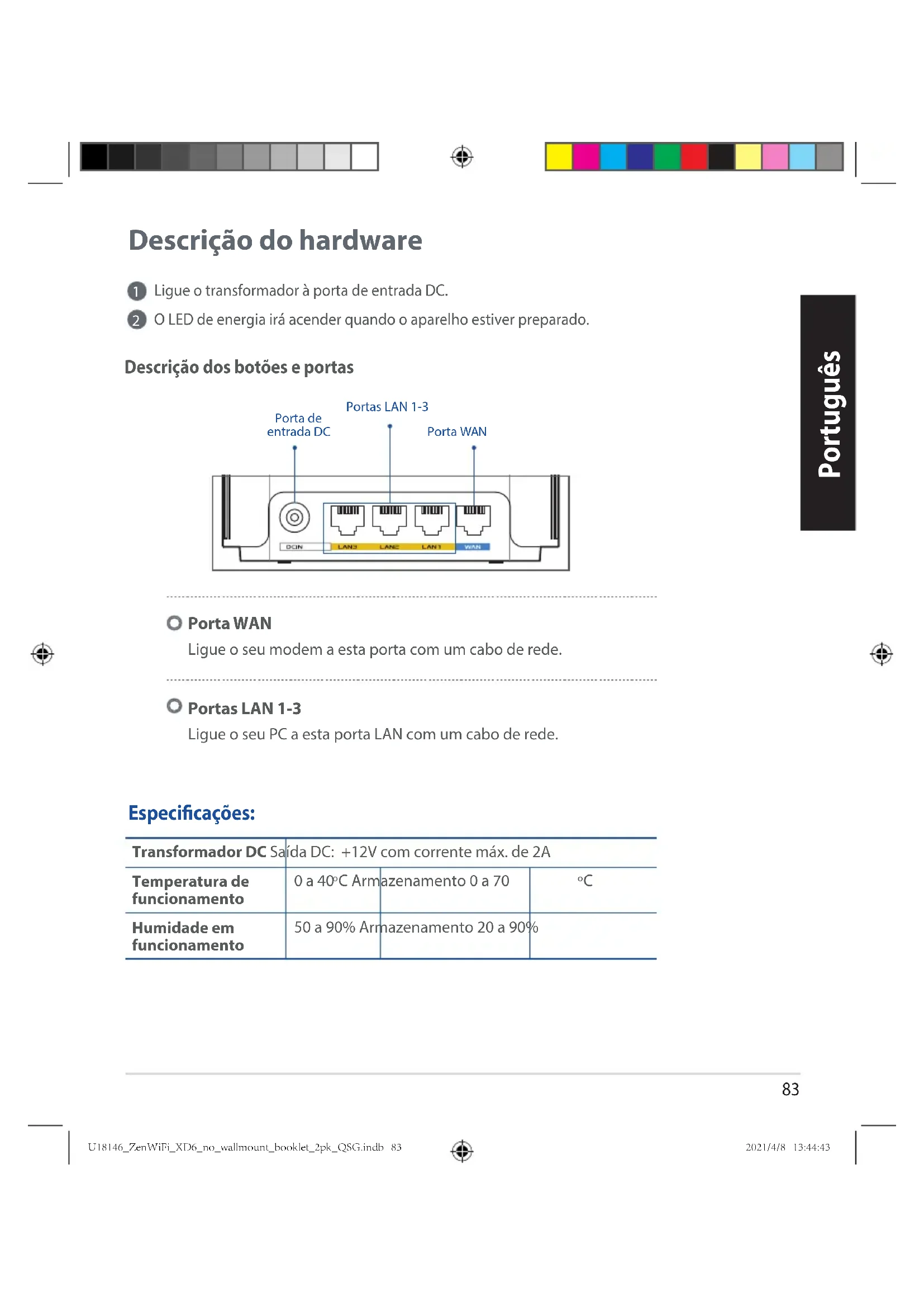 Humidade em funcionamento50 a 90% Armazenamento 20 a 90% Especicações: Descrição dos botões e portas Porta WANPortas LAN 1-3 Porta WAN Ligue o seu modem a esta porta com um cabo de rede. Portas LAN 1-3 Ligue o seu PC a esta porta LAN com um cabo de rede. U18146_ZenWiFi_XD6_no_wallmount_booklet_2pk_QSG.indb 83U18146_ZenWiFi_XD6_no_wallmount_booklet_2pk_QSG.indb 83 2021/4/8 13:44:432021/4/8 13:44:4384 Português Antes De Congurar